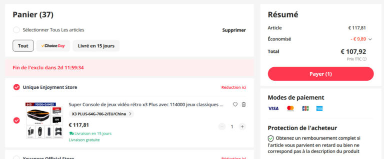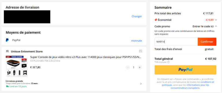 4. Introduisez le code promo sur la droite. Vous pouvez voir ici que le vendeur offrait une réduction de 9,89€ de base et avec le code promo MAR9 vous pouvez obtenir une réduction supplémentaire.