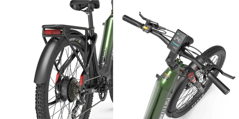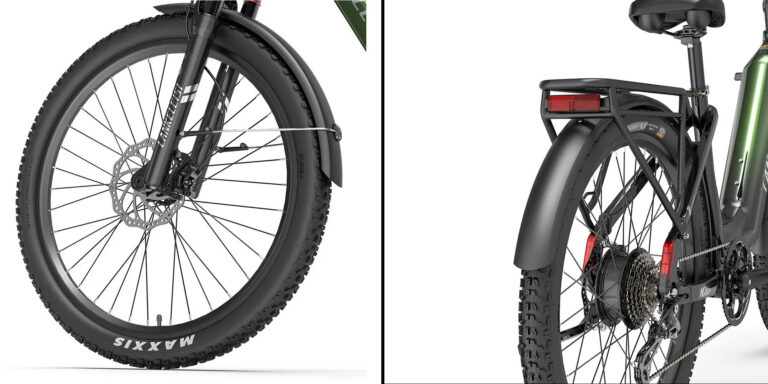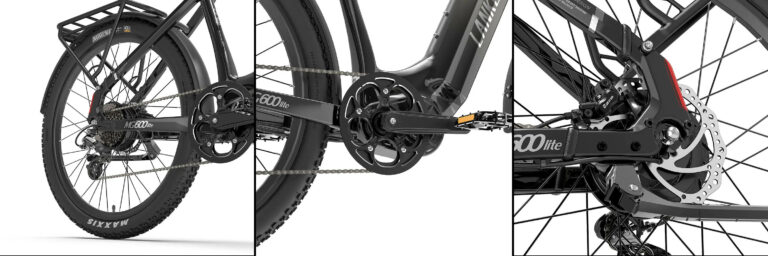 La première grosse différence visible entre ce nouveau modèle et les modèles précédents, c’est la taille des roues. Au lieu des pneus de 4 pouces habituels, ce vélo utilise des pneus de 2.4 pouces de largeur pour des roues de 27 pouces. Ce ne sont pas encore des mensurations d’un vélo de ville, mais on s’en rapproche. Ce type de pneu vous permettra de rouler sur la plupart des surfaces, il s’agit d’une configuration plus sage que des vélos comme le Lankeleisi MG600 Plus ou le Lankeleisi X3000 plus.