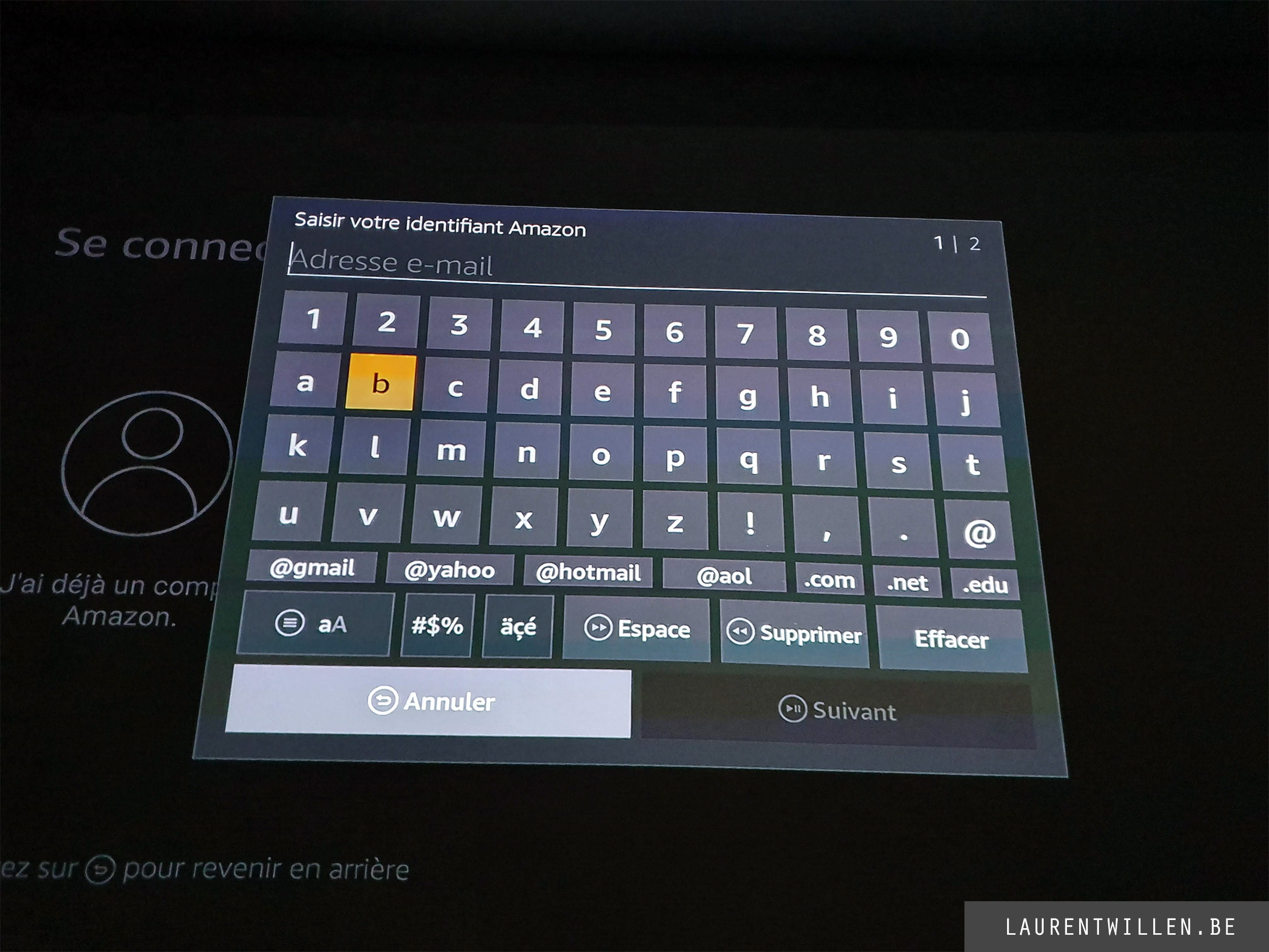 Après l'installation, vous devez vous identifier avec votre compte Amazon. L'écran de saisie pour l'adresse e-mail et le mot de passe est assez facile à utiliser mais pour ceux qui sont habitués à un clavier azerty/qwerty, il faudra s'habituer à l'affichage alphabétique.