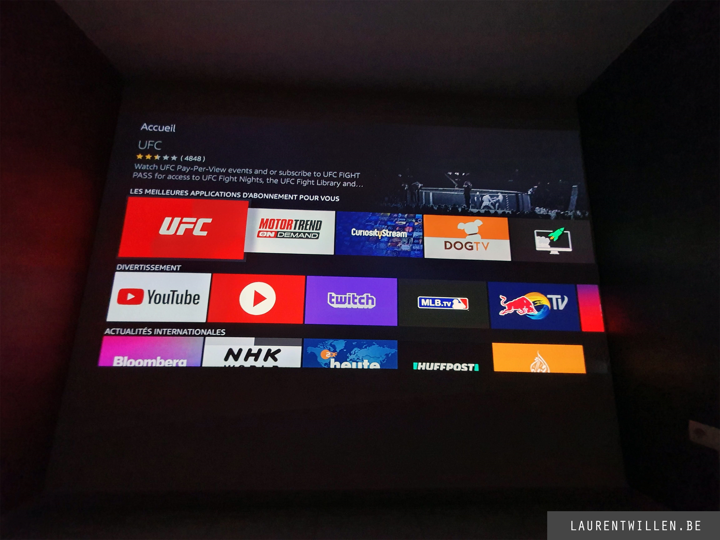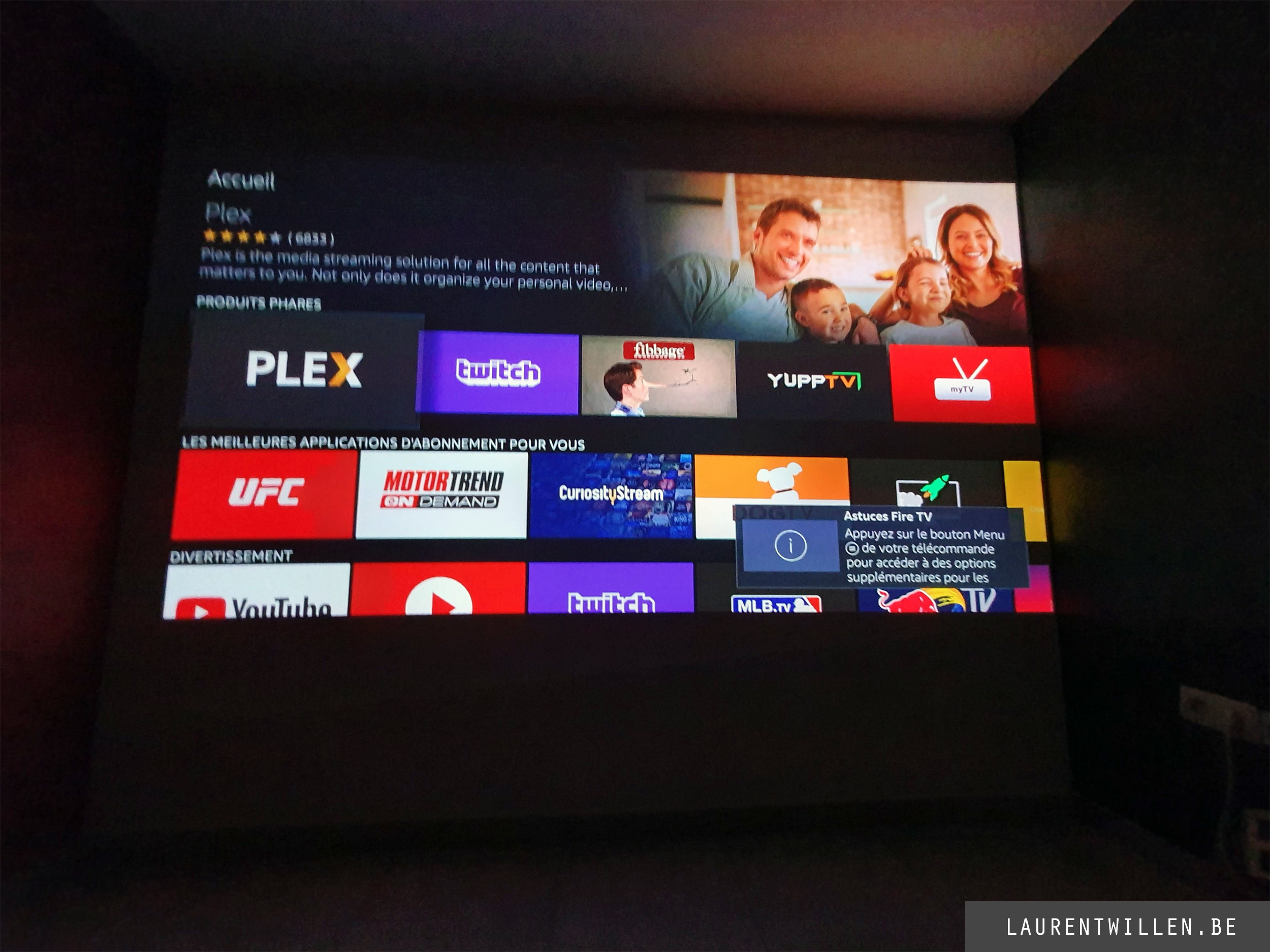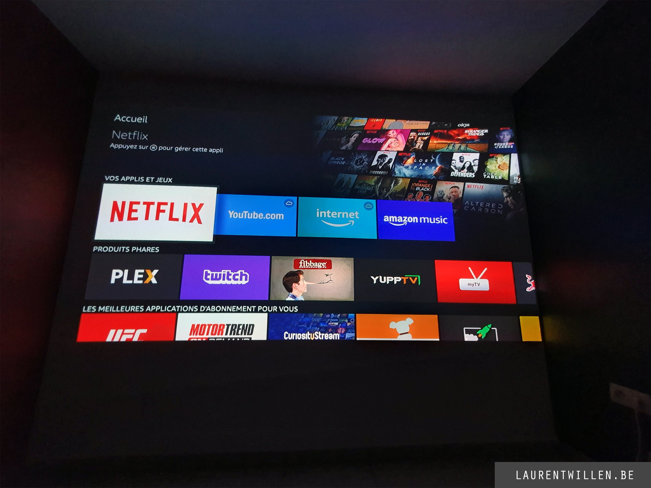 L'interface d'Amazon est divisée en 3 écrans accessibles à partir d'une navigation présente en haut de l'écran. Commençons par l'écran d'accueil. L'interface est très facile à utiliser, elle est richement colorée et on profite dès le départ d'une résolution en 1080p assurant une lisibilité impeccable. Je trouve même que la lisibilité est meilleur que la version d'Android qui tourne sur mon projecteur.
