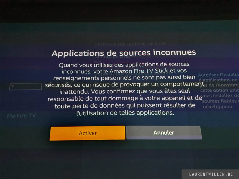 Pour ceux qui comme moi seront frustrés par l'absence de certaines applications, il existe une solution, il s'agit du side-loading. Cette technique consiste à installer des applications non officielles sur un appareil. Pour y arriver il faut d'abord aller dans les paramètres du FireTV Stick. choisir "Ma FireTV" et ensuite "Options pour les développeurs". Là il faut autoriser les applications de sources inconnues.