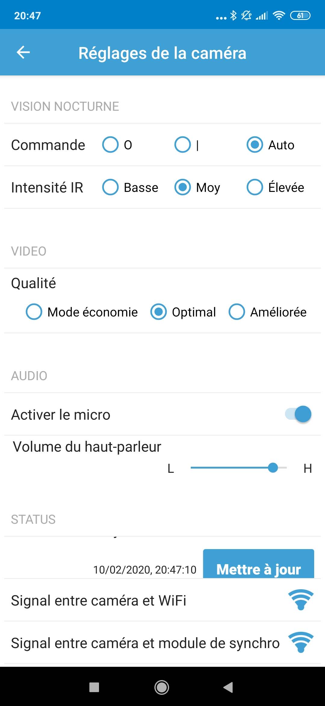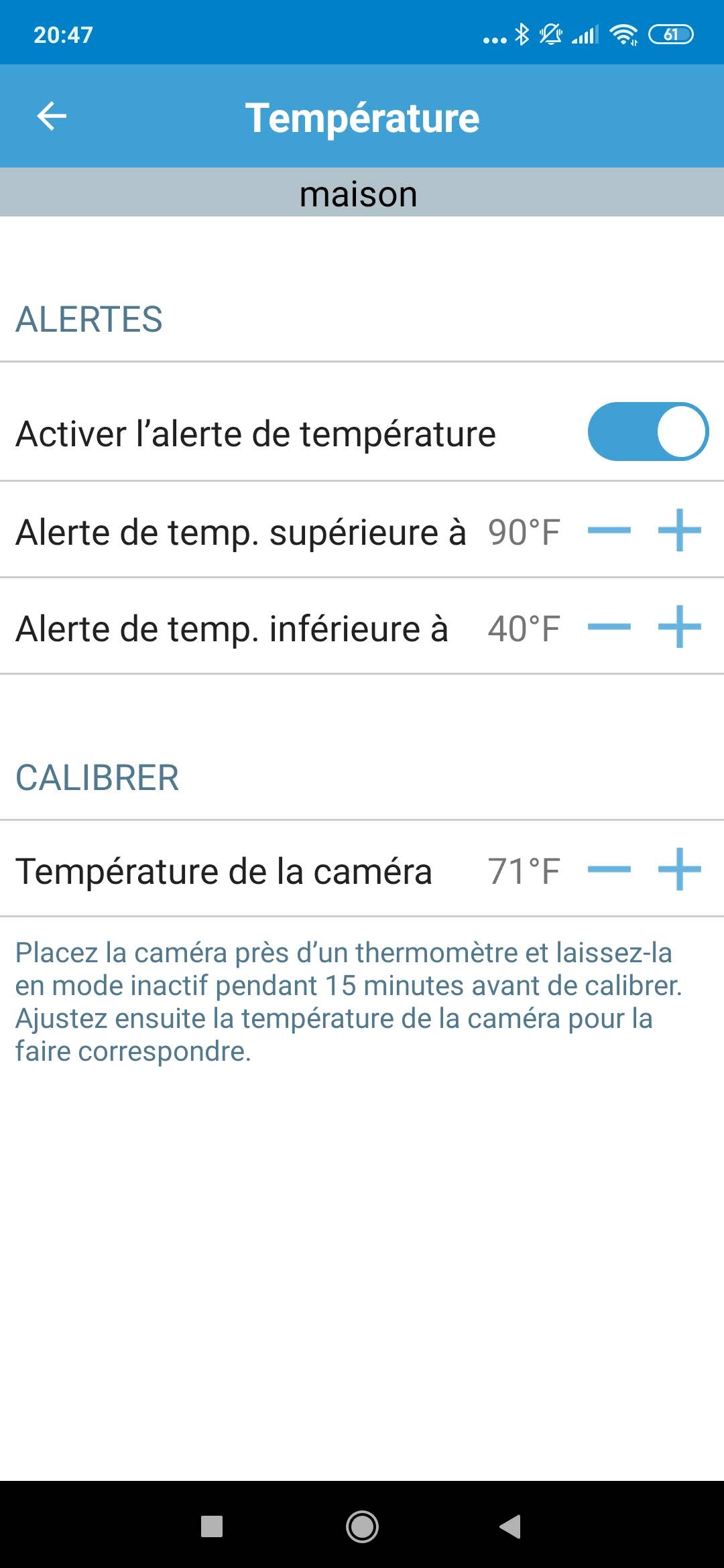 Vous pouvez également configurer chaque caméra individuellement en activant/désactivant la détection du mouvemnet (icone du petit bonhomme qui court) mais vous pouvez également changer le nom de la caméra, voir l'état des piles, la température ambiante, définir les zones de détection, définir la sensibilité de détection, définir la sensibilité du module infrarouge, définir la durée du clip vidéo, définir la qualité vidéo et également le volume du haut-parleur. L'application offre donc un grand nombre de possibilité pour chaque caméra, elle détecte également le type de caméra (intérieure ou extérieure) pour proposer les réglages les plus appropriés pour chaque type de caméra.