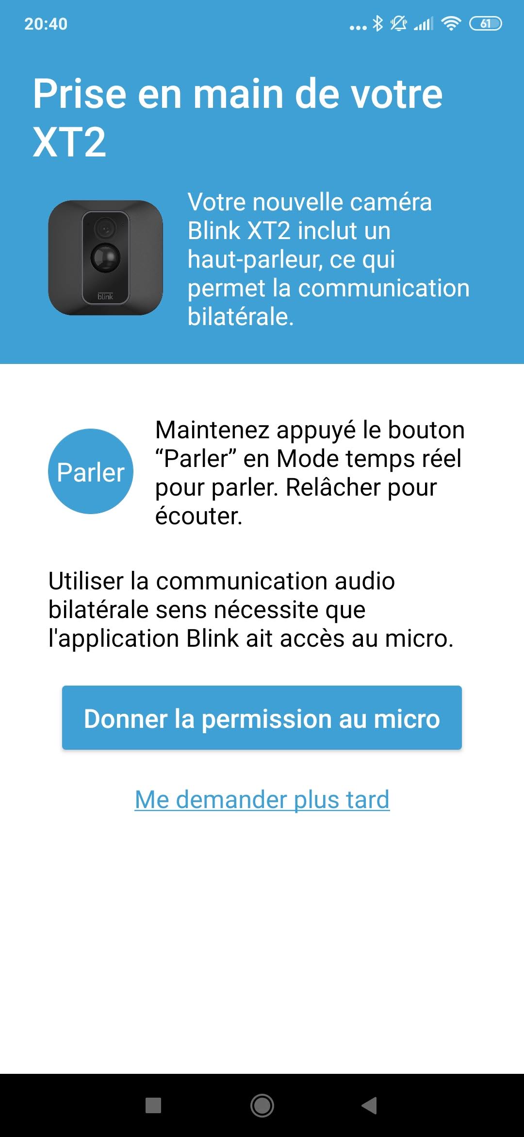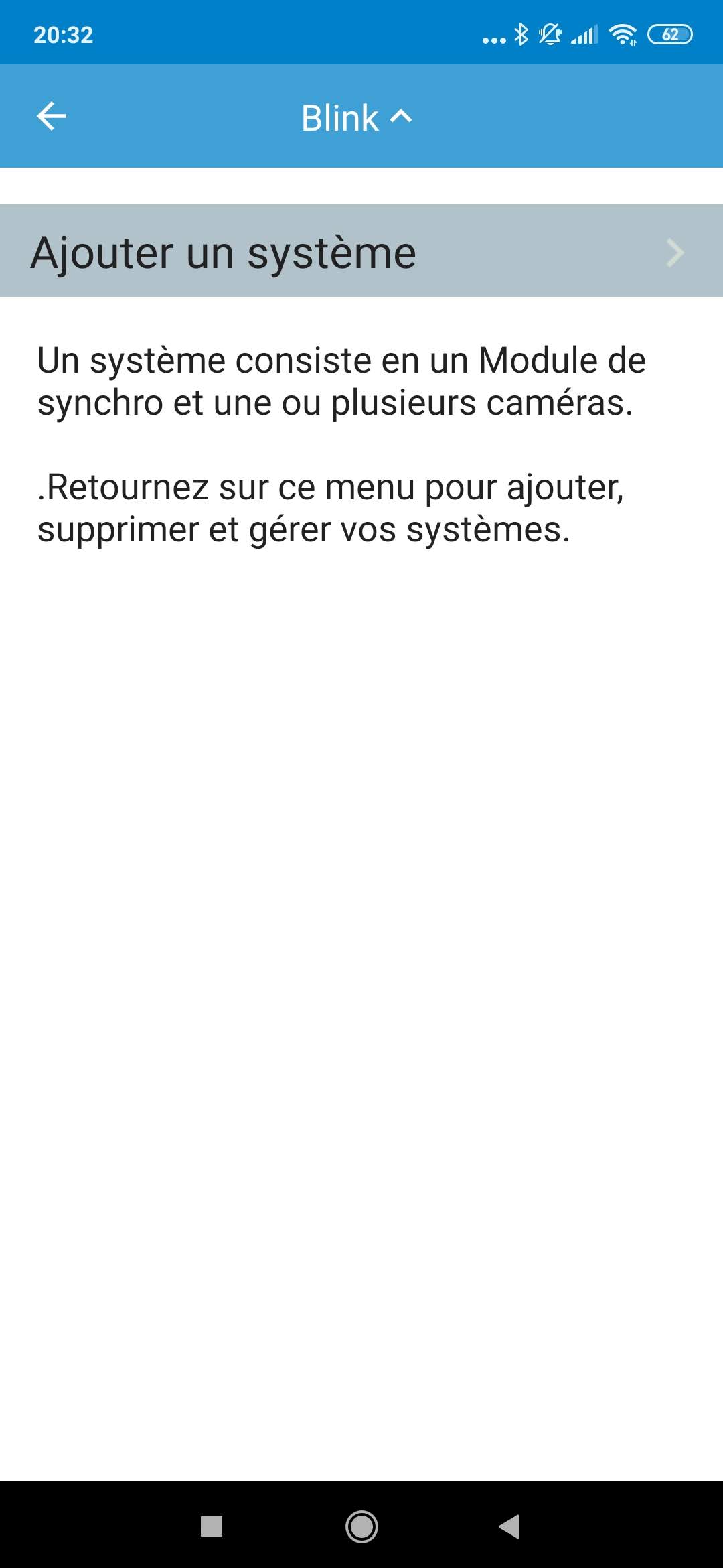 La mise en route du système est très simple. Vous devez d'abord télécharger l'application Blink sur le Play Store de Google ou l'App Store d'Apple. Cette application vous permet de connecter le module de controle à votre réseau wifi et ensuite ajouter chaque caméra pour les configurer selon vos souhaits. Chaque caméra dispose d'un code QR à l'arrière, il suffit de scanner ce code avec l'application Blink pour ajouter la caméra à votre configuration.L'écran d'accueil de l'application vous permet de voir une photo de chaque caméra, vous ne voyez donc pas tous les flux vidéos en temps réel, c'est une vue statique. Pour voir une caméra en temps réel, vous devrez appuyer sur l'icone caméra. L'icone photo sert à mettre à jour la photo de la caméra qui s'affiche sur l'écran principal.