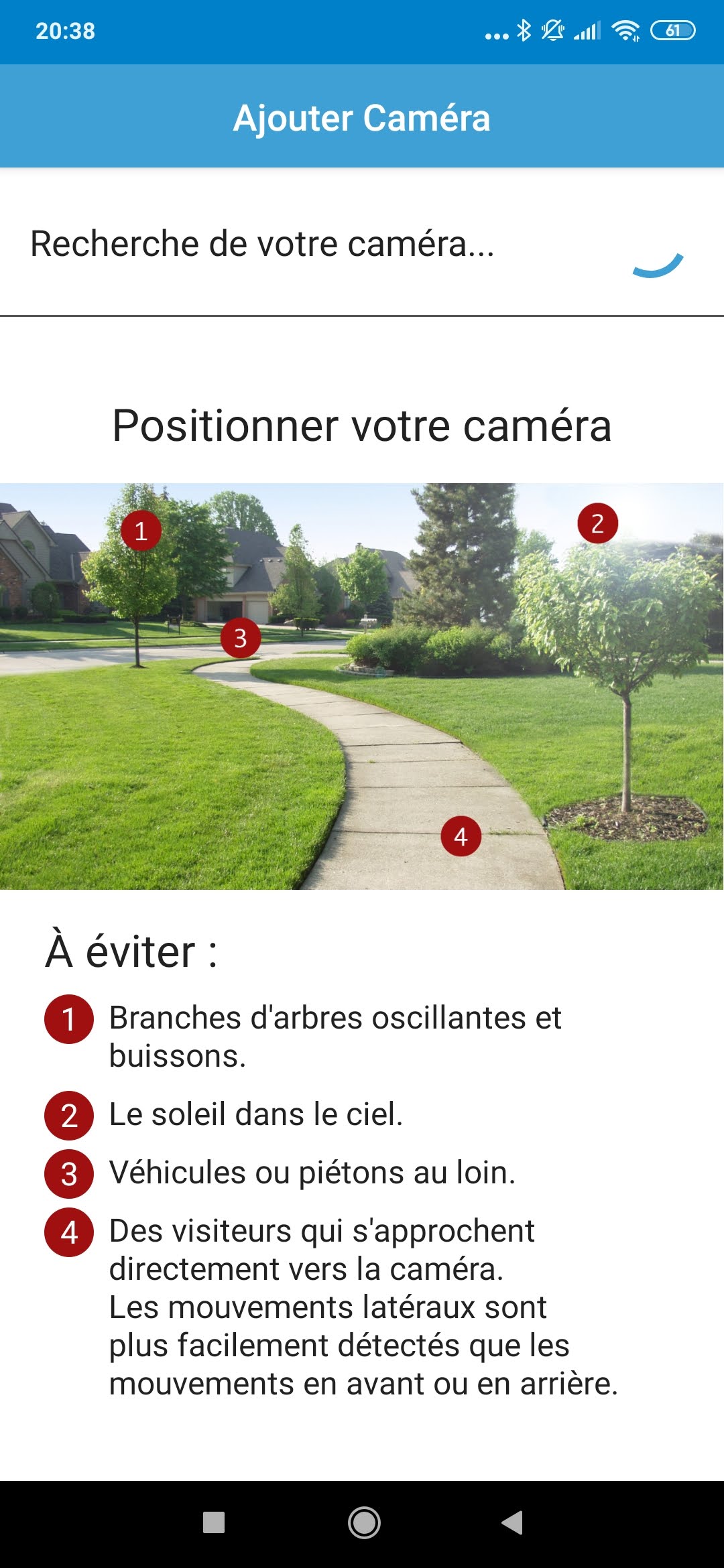 Le placement de votre caméra va donc avoir une importance essentielle sur sa capacité de détection car si elle est orientée vers une zone qui peut être traversée en quelques secondes, la caméra ne verra rien. Vous devez donc vous assurez que la caméra soit orientée vers une zone où un éventuel intrus sera coincé pendant au moins 5 à 10 secondes. C'est un des plus gros défauts de la caméra!