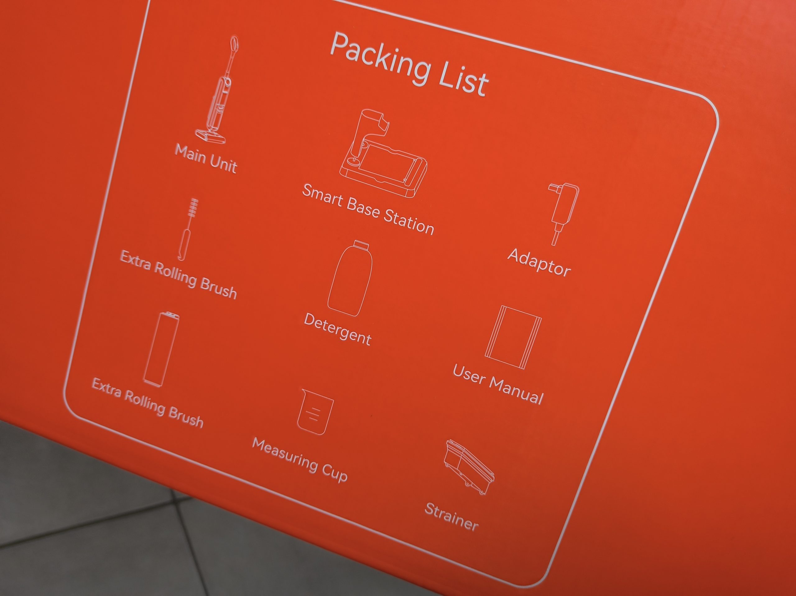 La boite contient l'aspirateur avec sa double brosse rotative, un réservoir d'eau pour le nettoyage, un réservoir pour la collecte de la saleté, un gobelet doseur, un filtre hepa, une brosse de nettoyage, une station de recharge, une brosse de secours et un manuel.