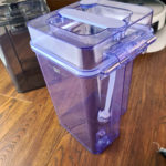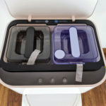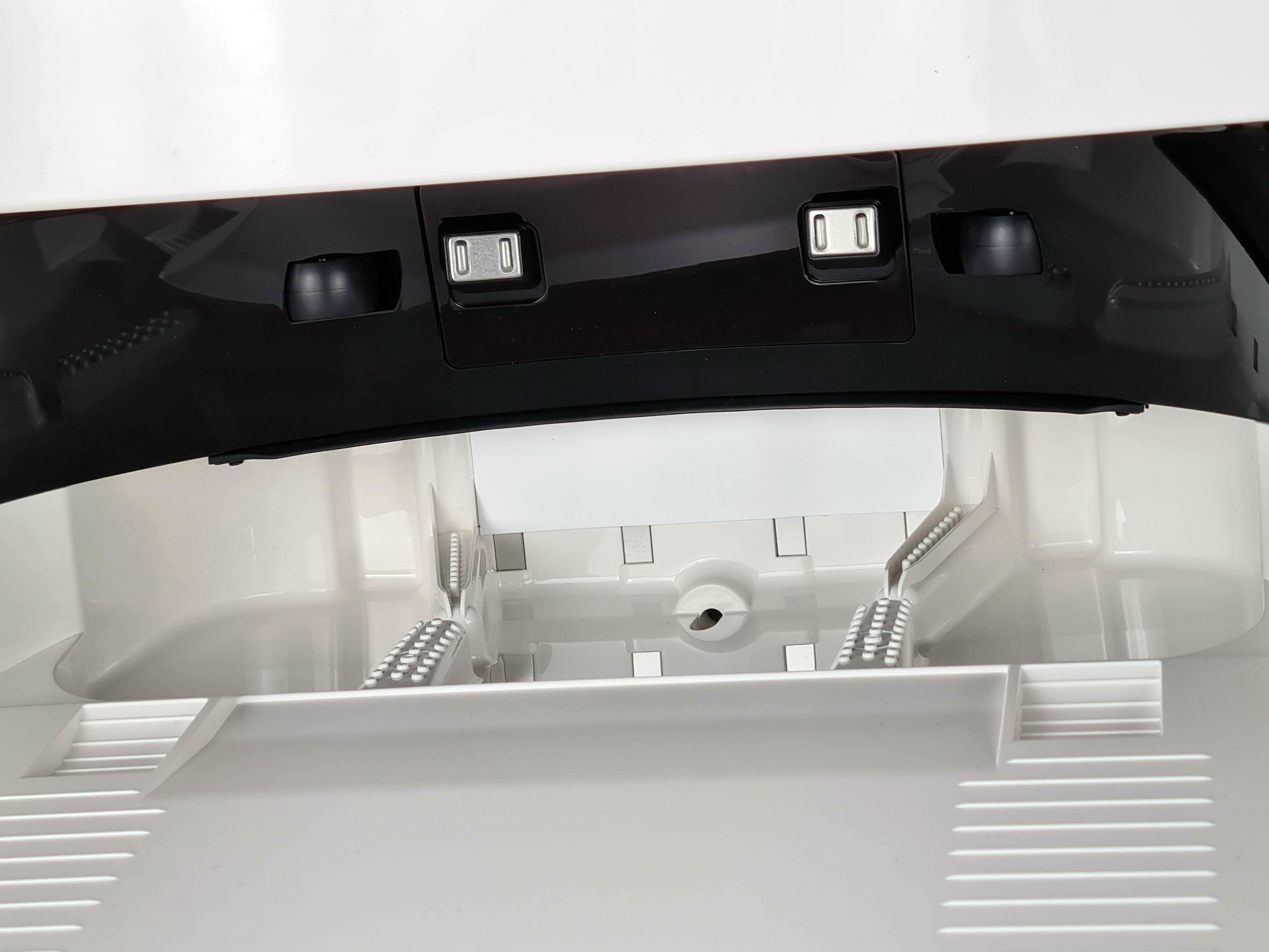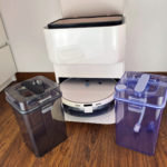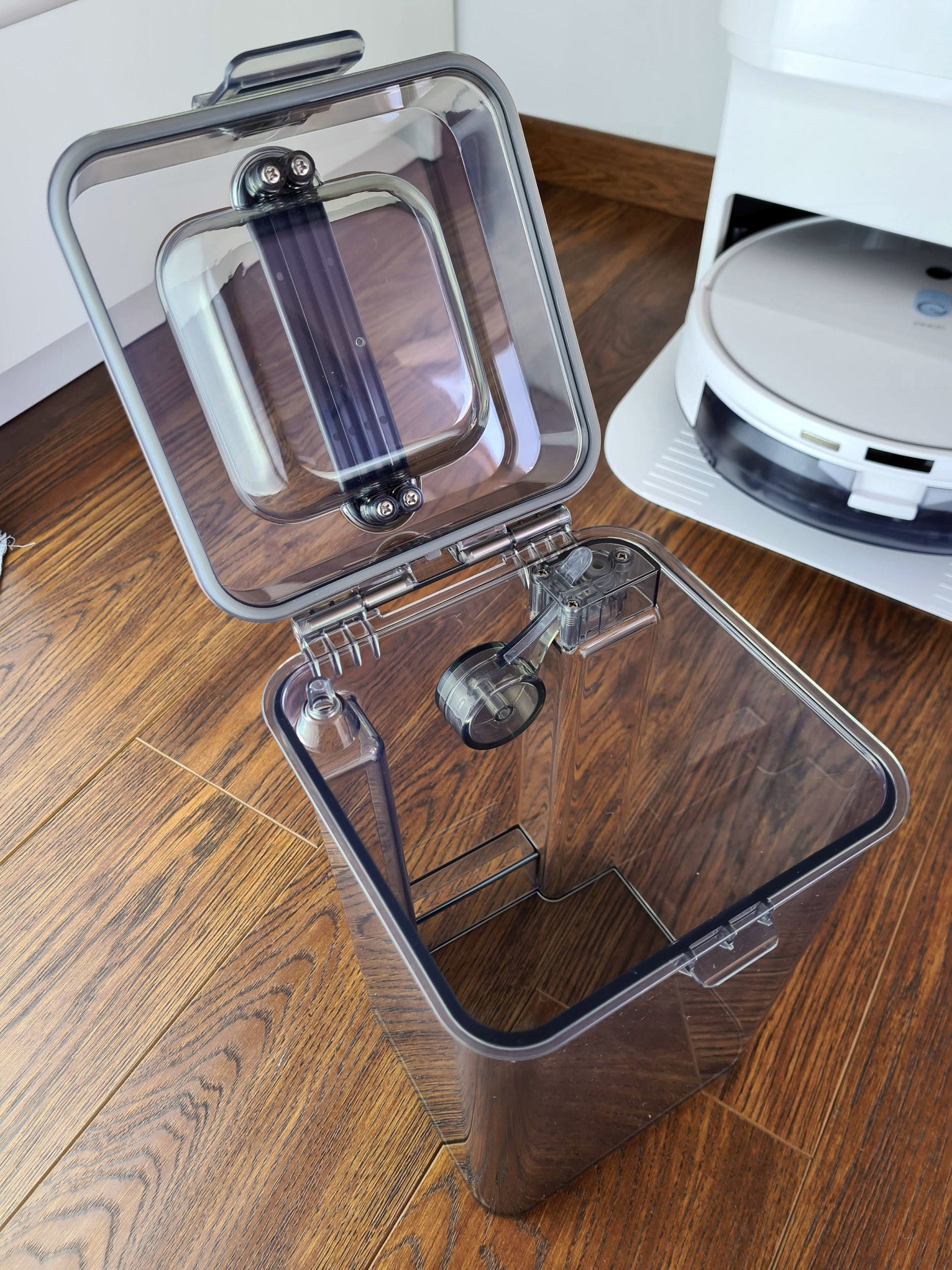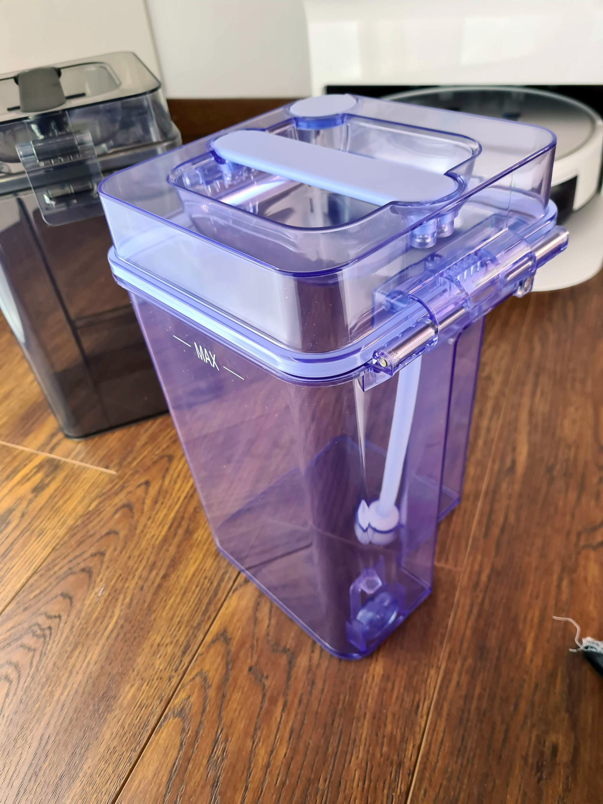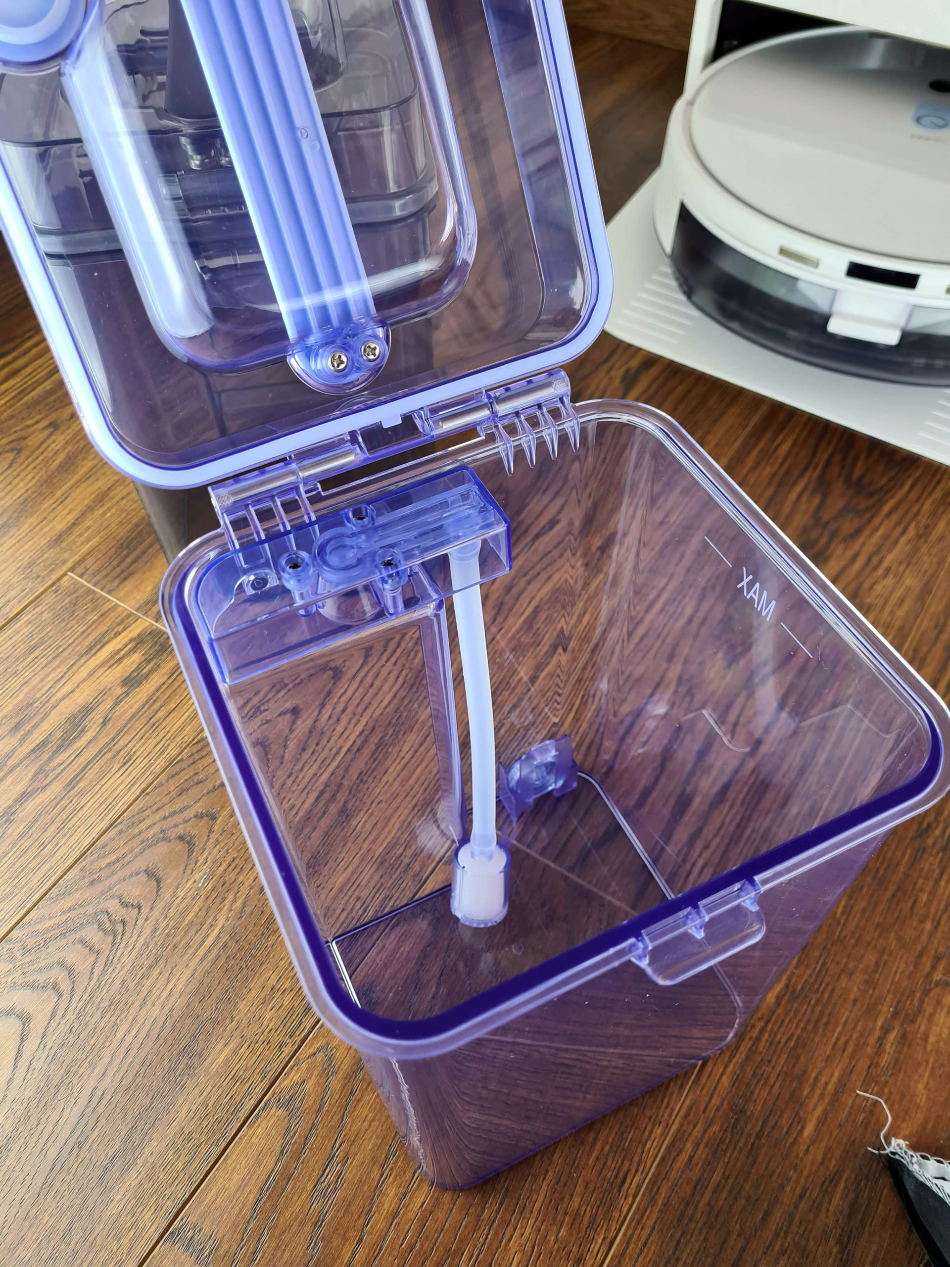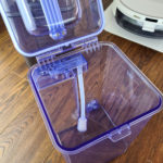 Sous le couvercle, on retrouve 2 récipients, un pour l'eau propre et un pour l'eau sale. Ces réservoirs peuvent contenir 3.5 litres chacun. Ils sont connectés au robot nettoyeur par le bas et sont capable d'une part d'injecter l'eau propre dans le robot nettoyeur mais ils sont aussi capable d'aspirer l'eau sale pour la stocker dans le réservoir prévu à cet effet. Avec une capacité de 3.5l, le robot nettoyeur doit pouvoir faire presque 10 sessions de nettoyage, cela dépendra de l'intensité du mode nettoyage.