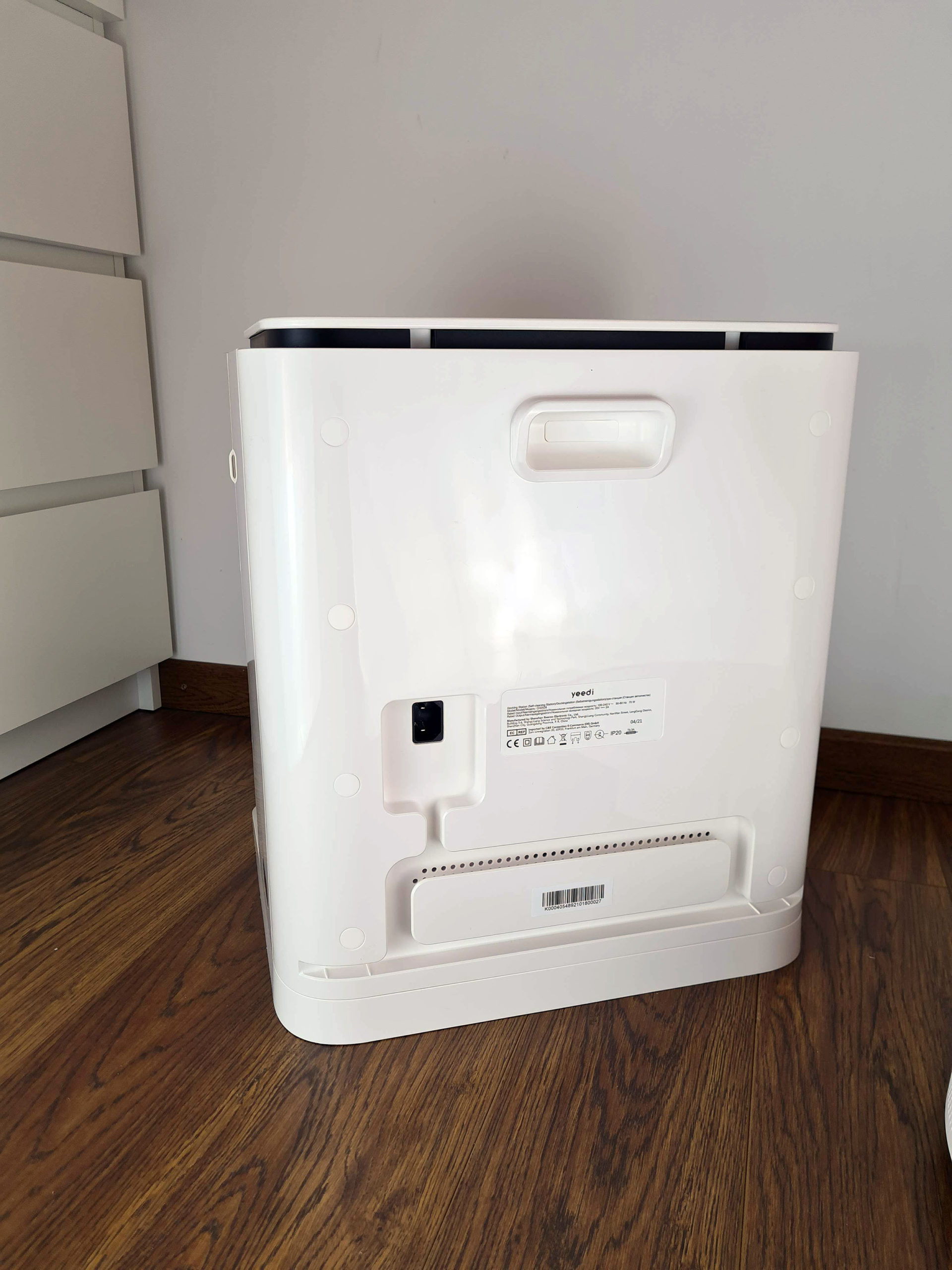 J'étais en videoconférence pour le boulot lorsque la Yeedi Mop Station est arrivée chez moi, je n'ai donc pas pu prendre le colis moi même mais j'avais entendu le facteur déposer la caisse dans le hall d'entrée, d'habitude il se contente de passer le paquet au dessus de grillage à la première personne qui ouvre la porte. Lorsque j'ai vu le paquet j'ai compris pourquoi, le paquet était énorme. La Yeedi Mop Station est une station de nettoyage composée d'un grosse station d'accueil très épurée et un robot aspirateur nettoyeur.