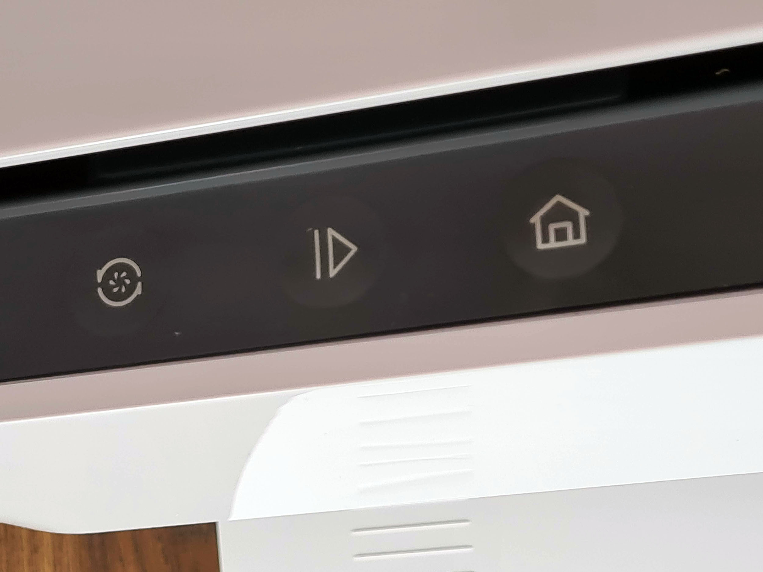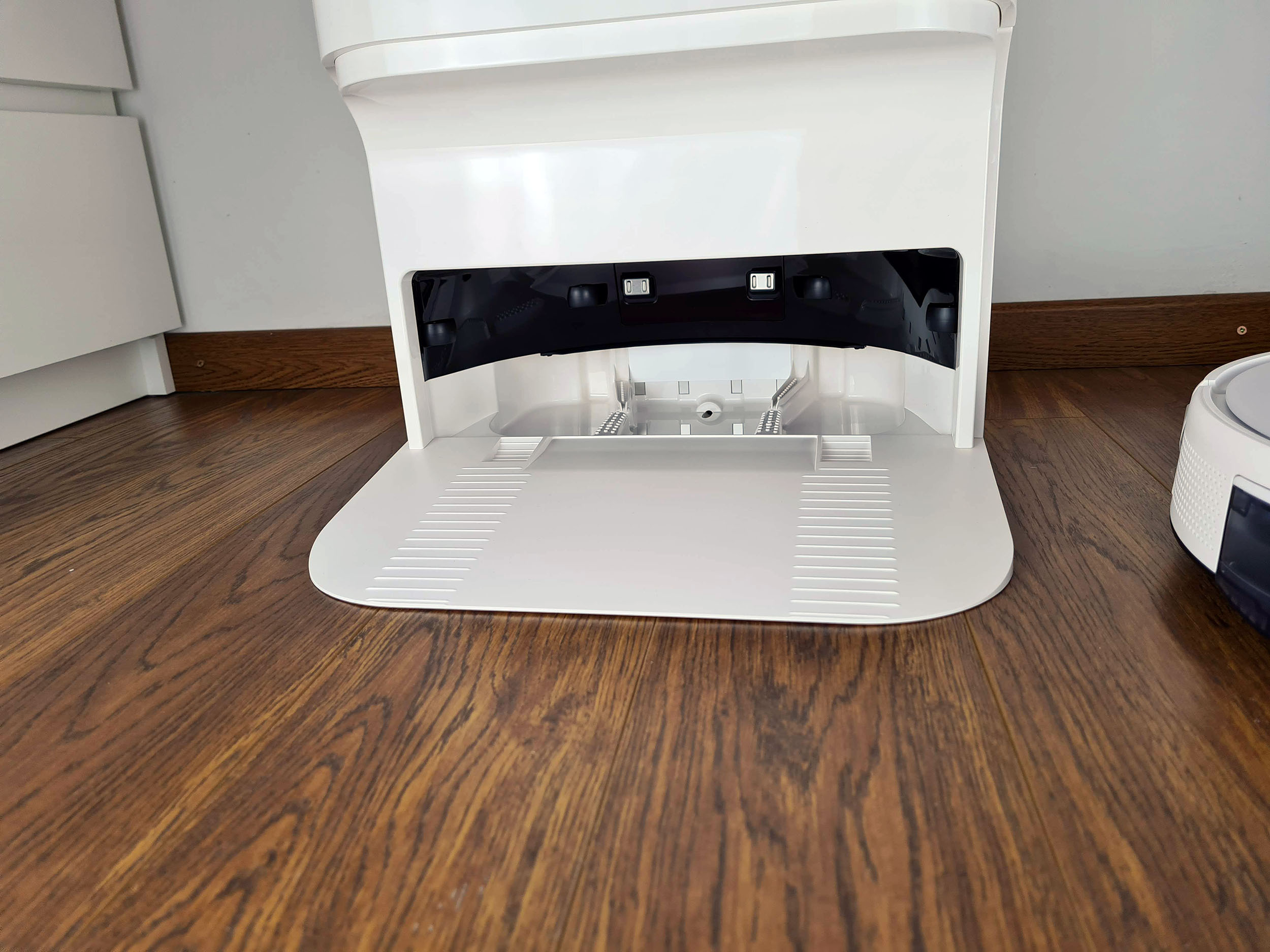 Le robot s'installe en marche arrière dans la station d'accueil, des capteurs lui permettent de s'orienter correctement et les roues crantées permettent d'escalader la petite rampe d'accès. Une fois le robot installé, le robot se met en charge, nettoie les brosses et remet de l'eau propre dans le réservoir du robot. La station est assez simple à utiliser, elle ne dispose que de trois boutons (démarrer une session avec l'aspirateur, mettre en pause/redémarrer et retour à la station). Vous pouvez donc utiliser la station d'accueil pour démarrer l'aspirateur et sans application mais il serait dommage de s'en passer, j'explique cela plus loin dans cet article.
