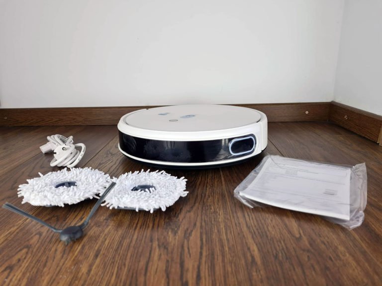 La boite de la Yeedi Mop Station contient un robot aspirateur/nettoyeur Yeedi, une brosse pour amener les saletés vers la zone d'aspiratin, deux brosses rotatives pour le nettoyage et un manuel. Le robot est assez plat, il devrait donc pouvoir passer en dessous de la plupart des meubles. Son système de détection s'appuie sur des capteurs comme la plupart des robots de ce type mais il utilise également son pare-choc pour évaluer son environnement. Pour les objets clairs, le système de détection suffit mais pour les objets sombres j'ai remarqué qu'il a tendance à utiliser son pare-choc pour identifier les obstacles.