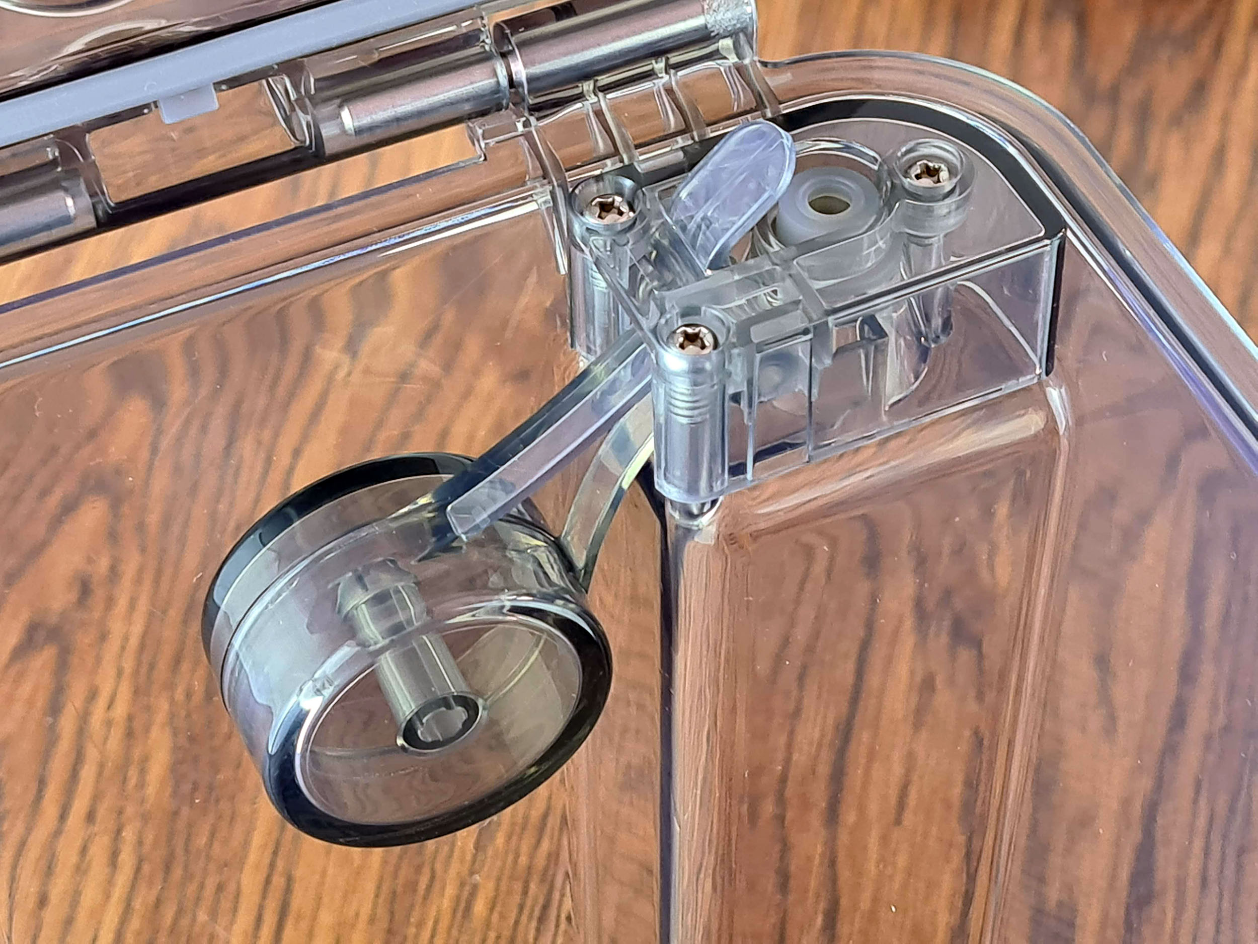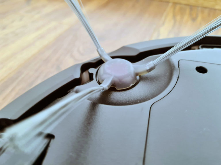 Les brosses de nettoyage s'attachent directement sur le réservoir d'eau, elles peuvent être enlevées très facilement. Ces brosses tournent pour nettoyer mais le robot applique également une pression pour détacher les saletés plus facilement. Je n'avais pas encore testé un robot nettoyeur de ce type, je vais montrer plus loin que l'efficacité du nettoyage est nettement supérieure aux robots équipés d'une serpillère qui se contente de glisser sur le sol.