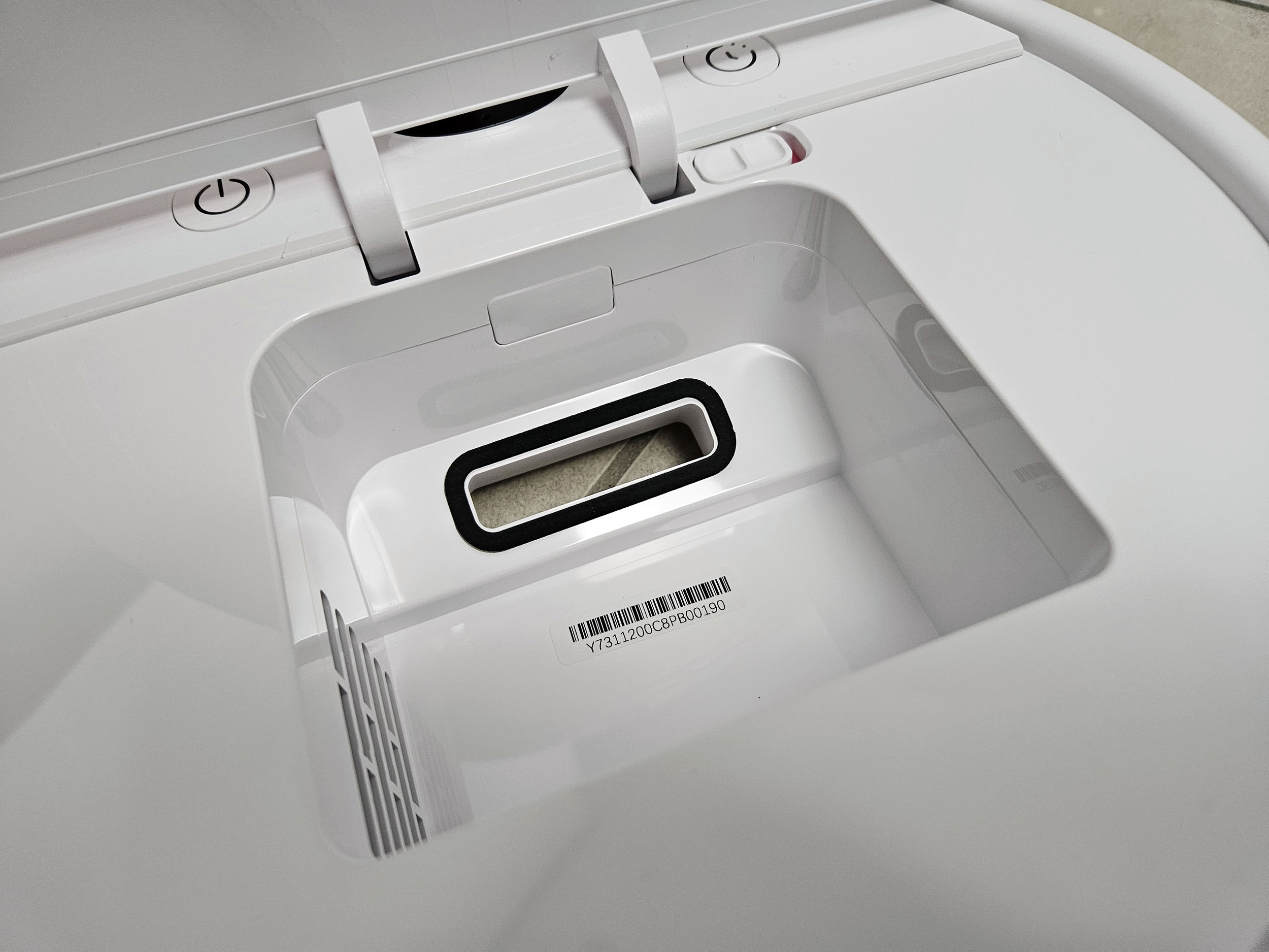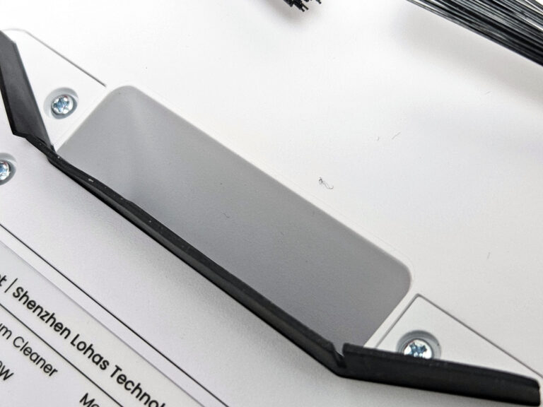 Le capot s’ouvre en tirant sur une lamelle de caoutchouc. Sur les autres robots une pression sur le capot provoque son ouverture. Le réservoir est assez petit, je pense que c’est le plus petit réservoir parmi les robots que j’ai testés.