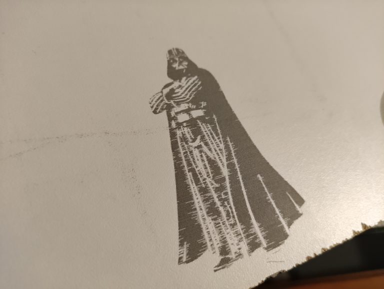 Pour cette deuxième tentative j'ai pris un personnage très célèbre de l'univers Star Wars et j'ai envoyée l'image vers le graveur en augmentant le nombre de ligne pour réduire l'effet des lignes de la première tentative. J'ai filmé la gravure en vitesse rapide, le processus dure environ 20 minutes.