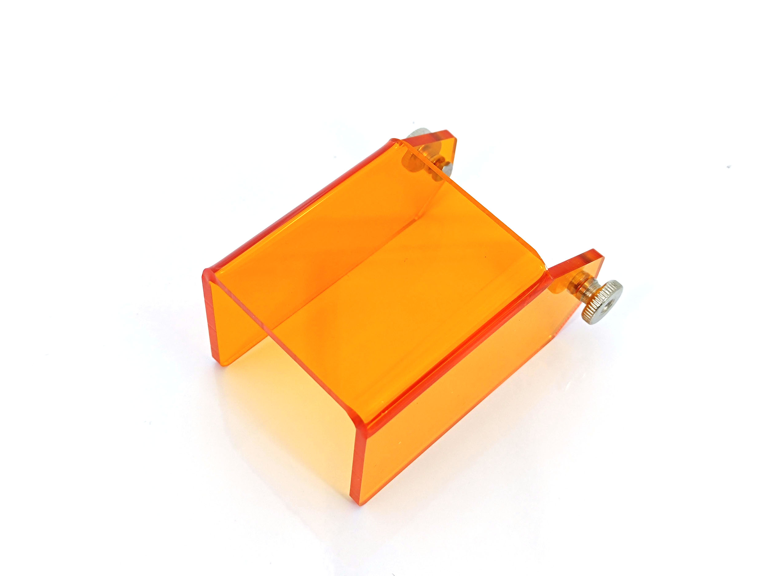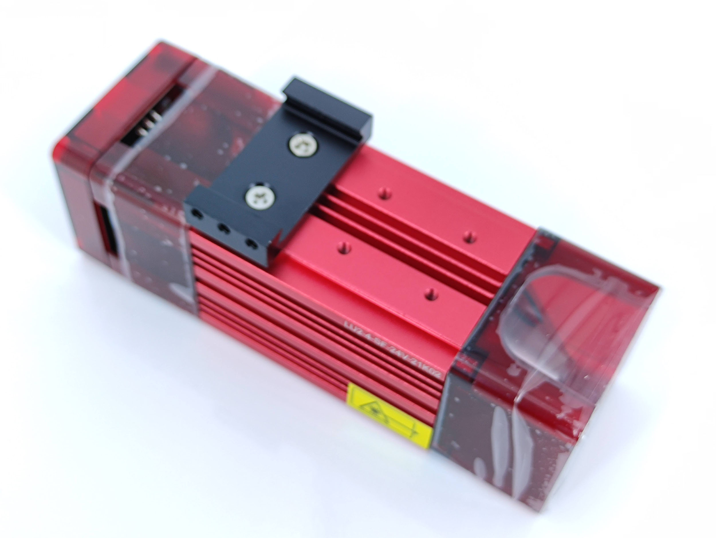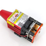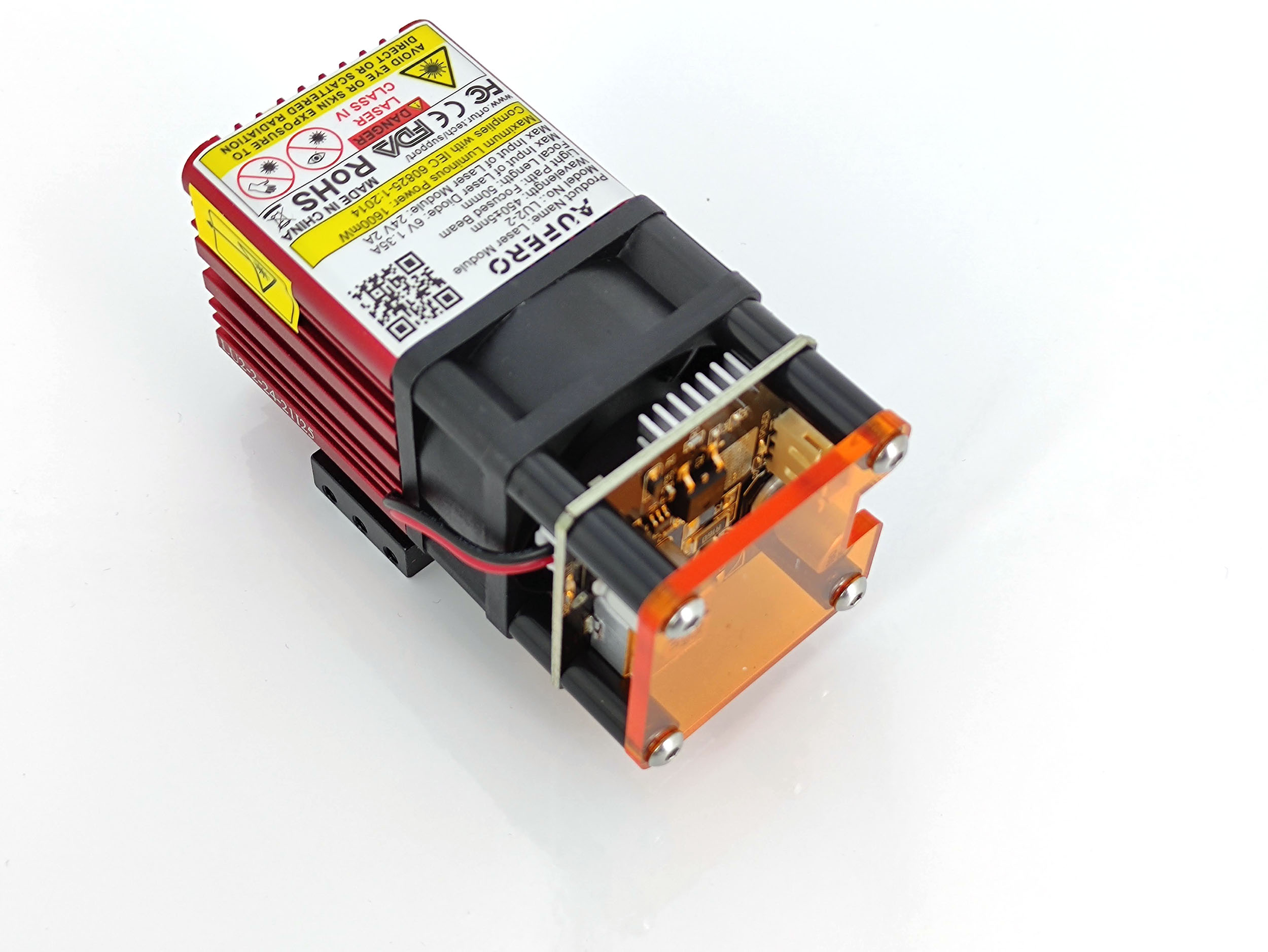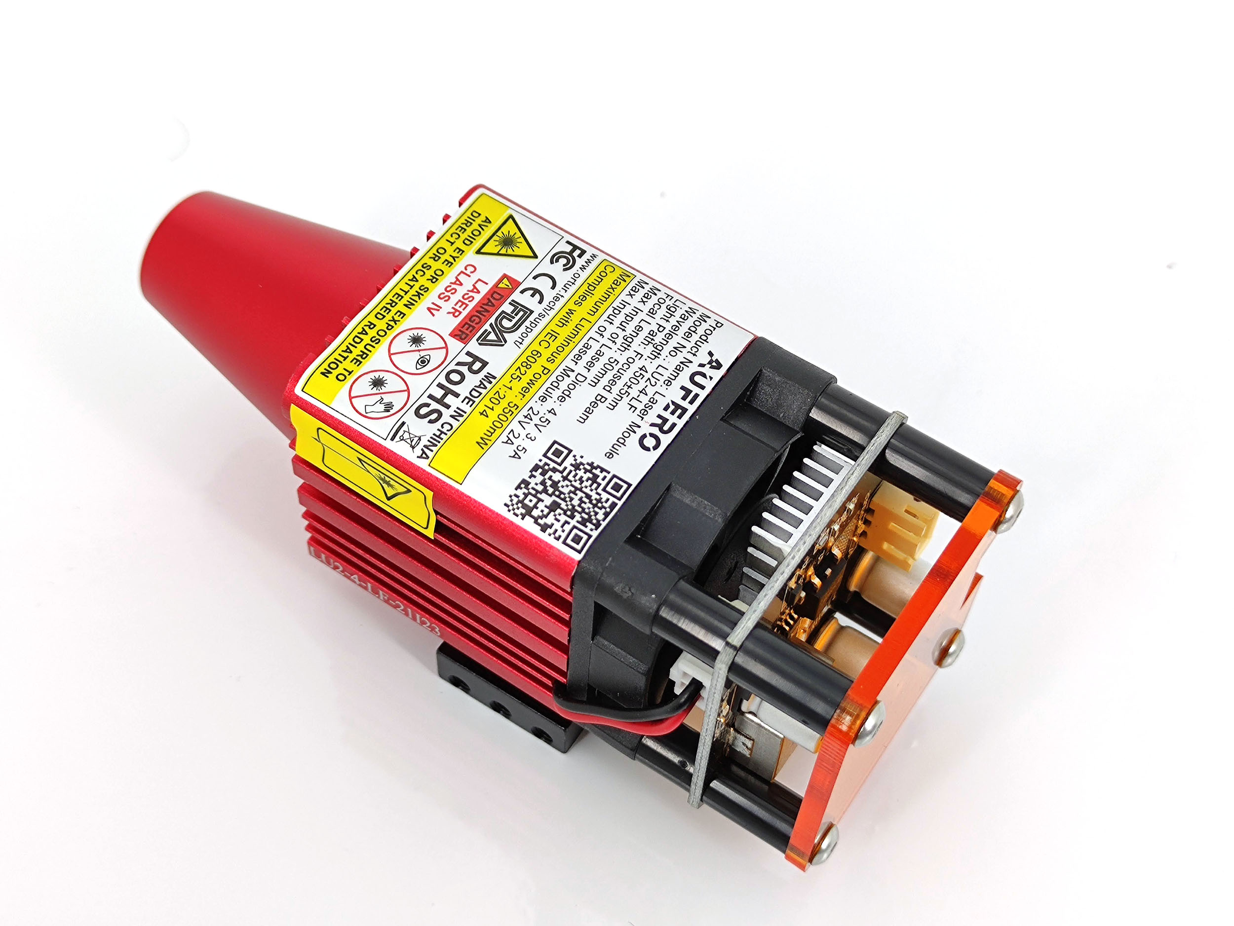 L'installation du laser est assez simple. Il faut utiliser les glissières dans le bloc de métal rouge pour permettre de fixer la protection en plastique Orange. Il faut ensuite brancher deux cables comme sur la vidéo.