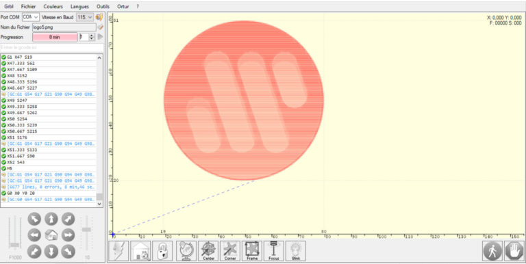 Pour utiliser le logiciel avec le graveur, c'est assez simple. Il faut brancher le cable usb entre le graveur et votre ordinateur et allumer le graveur en appuyant quelques secondes sur le bouton d'allumage. Si vous entendez le son caractéristique d'un nouvel appareil USB connecté c'est bon signe. Si tel est le cas, choisissez soit COM3, COM4 ou COM5 dans la liste déroulante en haut à gauche. Si la zone sous "progress" se remplit d'information, c'est que tout est bon. Si ce n'est pas le cas, je vous conseille de cliquer sur "tools" pour installer le driver CH340, suivez simplement les instructions. Débranchez le cable USB et branchez le pour refaire le test avec la liste déroulante. Sur ma Surface Pro, le graveur se trouvait sur COM5.