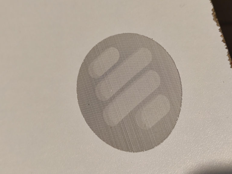 La présence de ligne est nettement moins visible qu'au premier essai (j'ai pris 6 lignes par mm), je n'ai pas non plus de zone plus claire mais par contre j'ai des ratés dans la gravure. Je ne sais pas si cela provient du graveur ou des paramètres.