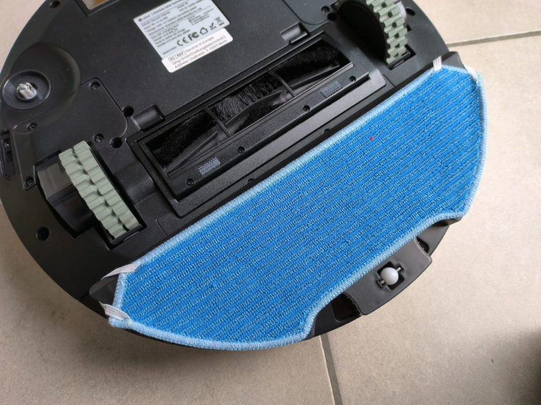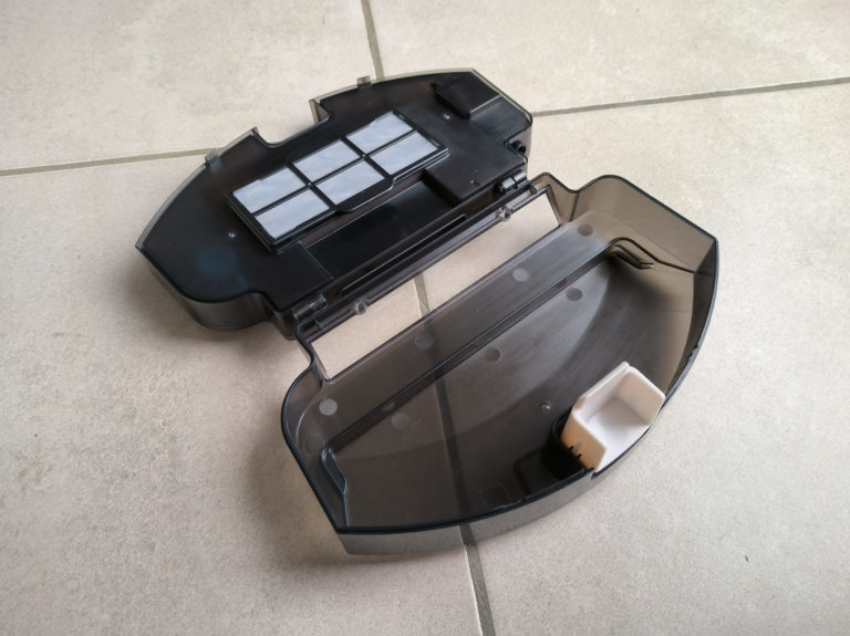 Le réservoir s'insère à l'arrière du robot aspirateur, un simple clic permet de le détacher. Le réservoir est composé de deux parties, une partie pour récolter la poussière avec une capacité de 520ml et une autre partie pour stocker l'eau de nettoyage avec une capacité de 160ml. La capacité du réservoir à poussière est un peu au dessus de la moyenne et le réservoir d'eau est assez petit car même si il est équipé d'un reservoir d'eau, ce robot est avant tout un robot aspirateur avant d'être également un robot nettoyeur. La serpillère est statique, elle ne vibre pas, elle récolte simplement les saletés avec l'humidité de la serpillère.
