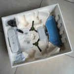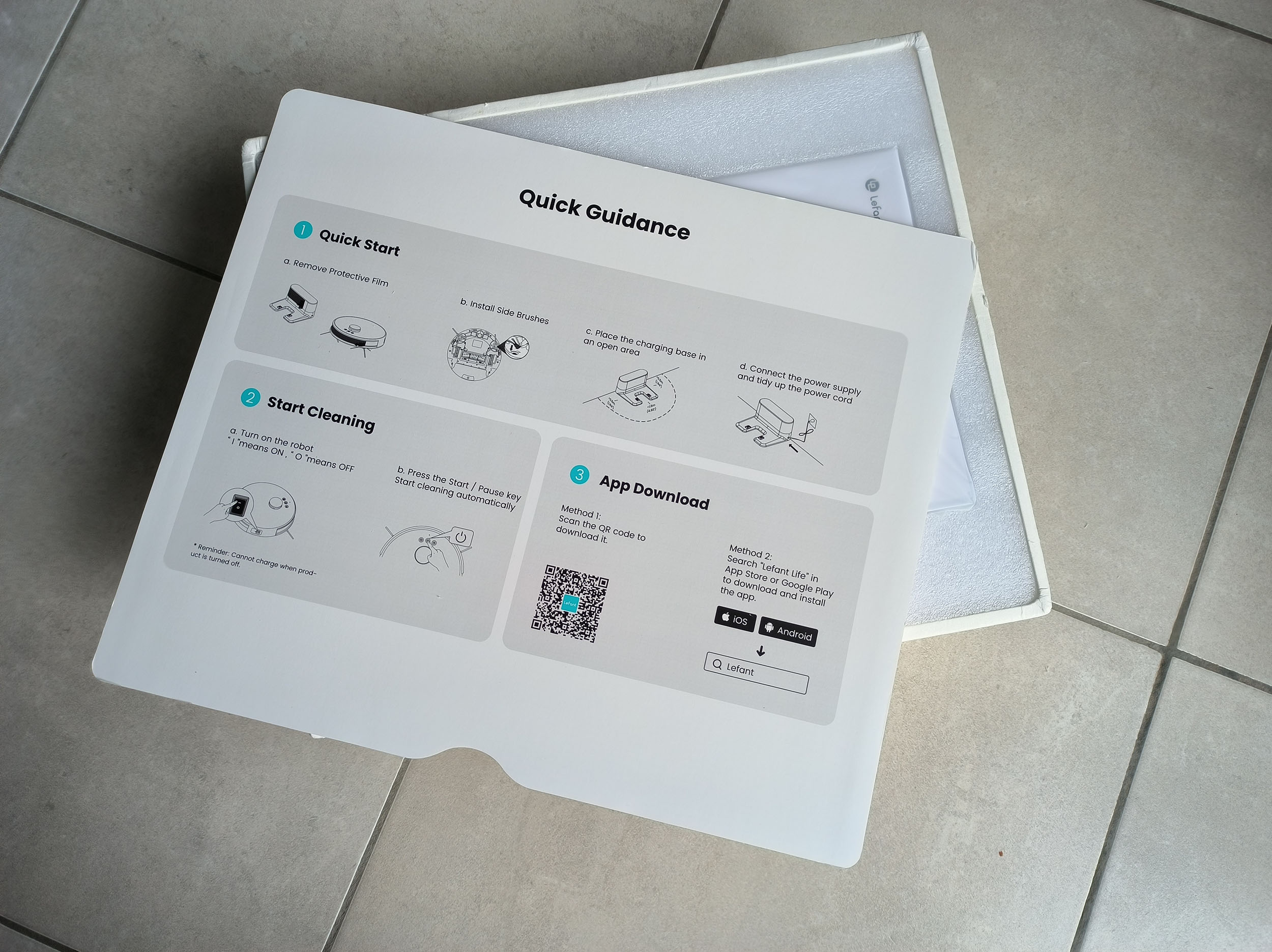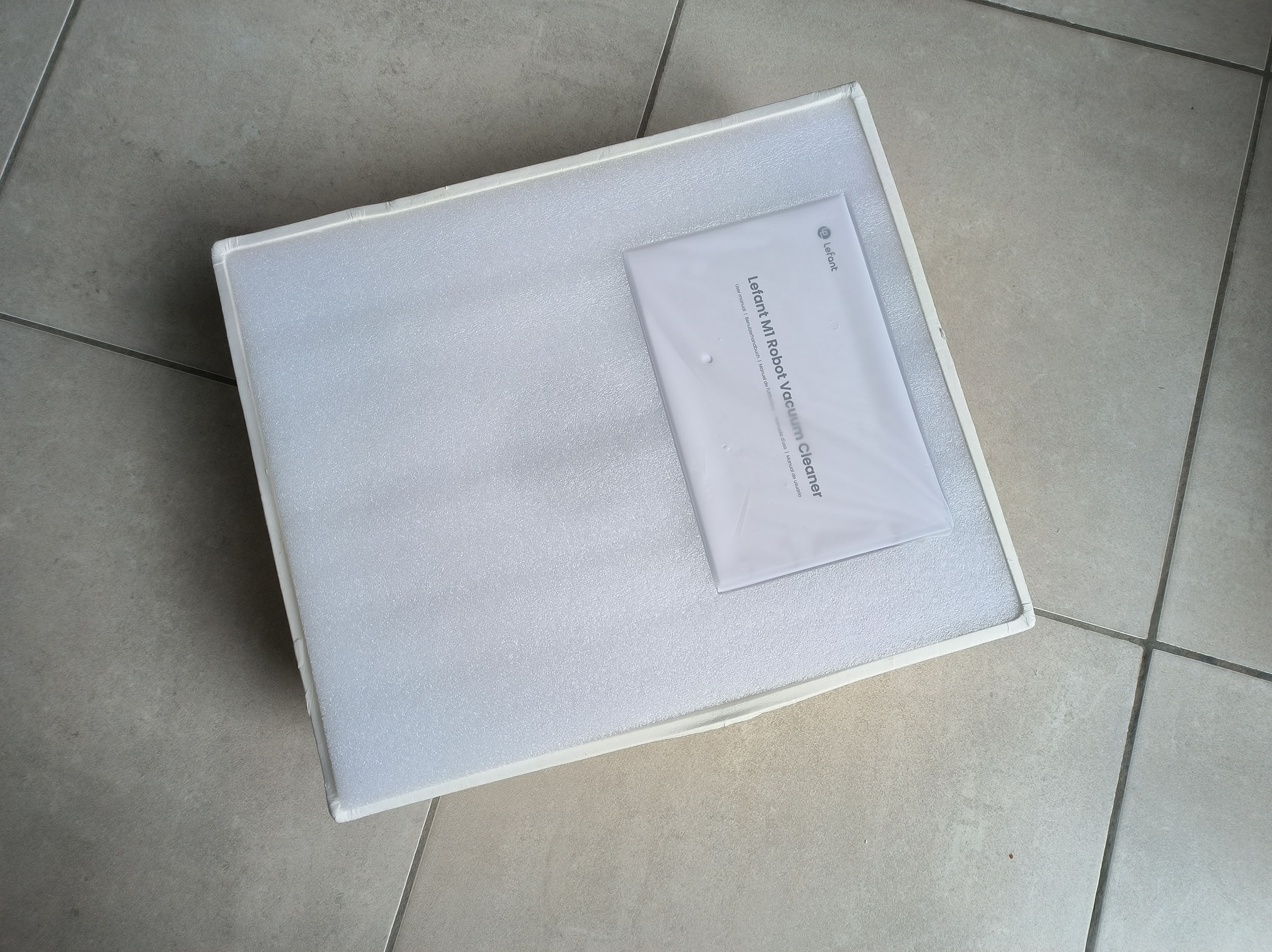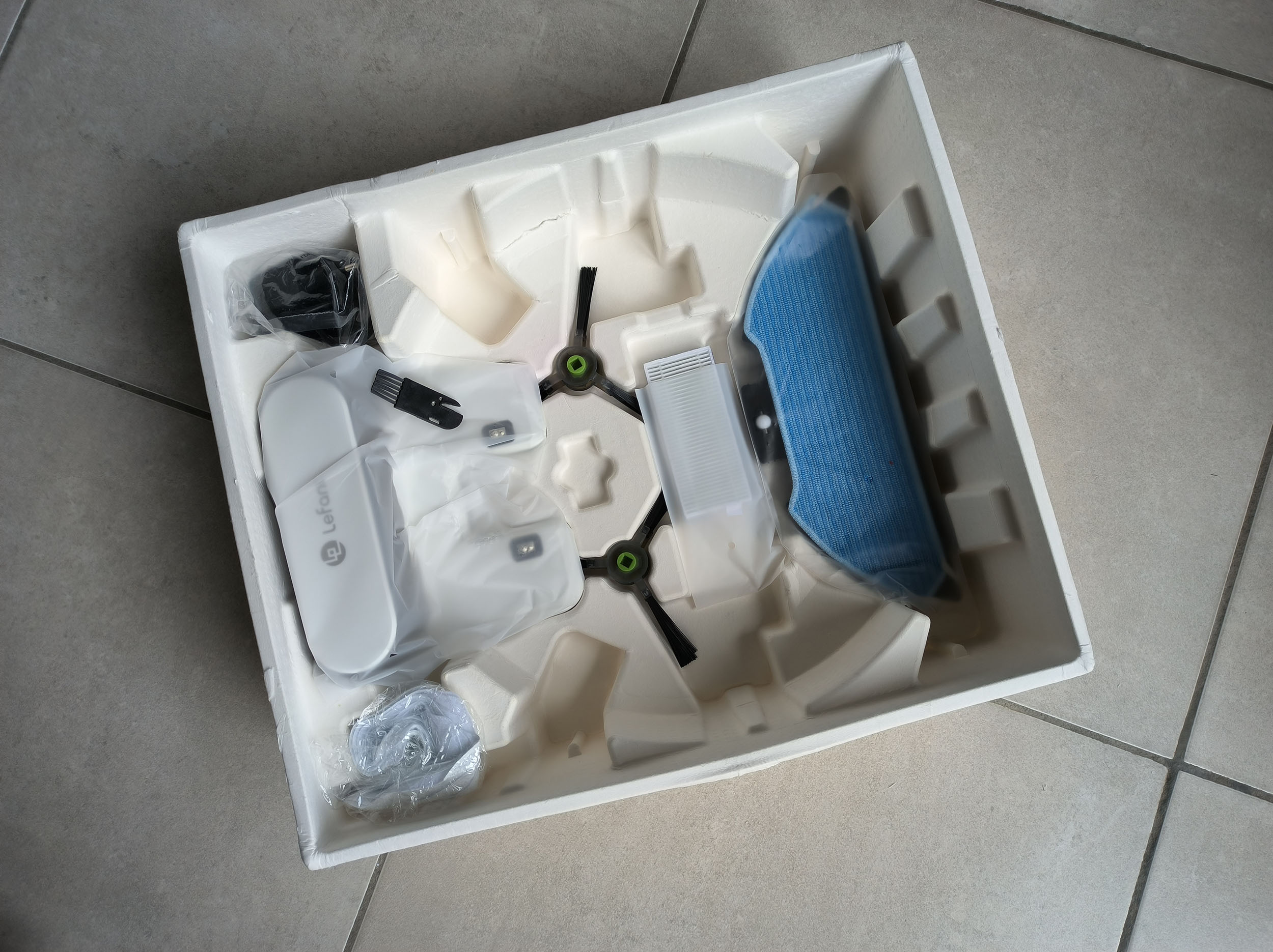 La boite du Lefant M1 est beaucoup plus neutre que celle du Lefant F1, elle ne donne que très peu d'indications sur le produits. La boite contient l'aspirateur, le réservoir d'eau et poussière, un filtre HEPA (en plus de celui qui est déjà dans l'aspirateur), un brosse de nettoyage, 4 brosses, une serpillère attachée à son socle de nettoyage, plusieurs serpillères supplémentaires, la station de charge et le chargeur. Lefant a été assez généreux au niveau des accessoires car avec 2 brosses en plus et des serpillères supplémentaires, vous allez ainsi pouvoir utiliser le robot pendant des mois avant d'envisager d'acheter de nouvelles brosses ou serpillères.