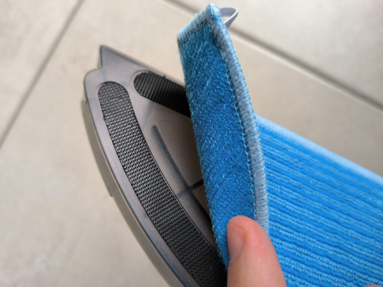 Les serpillères sont attachées à leur socle par le biais d'un revêtement adhésif, c'est la même chose que sur les autres aspirateurs sauf qu'ici elles sont également attachée par une petite corde à chaque extrémité, la serpillère est ainsi attachée de façon plus sûr à son socle.