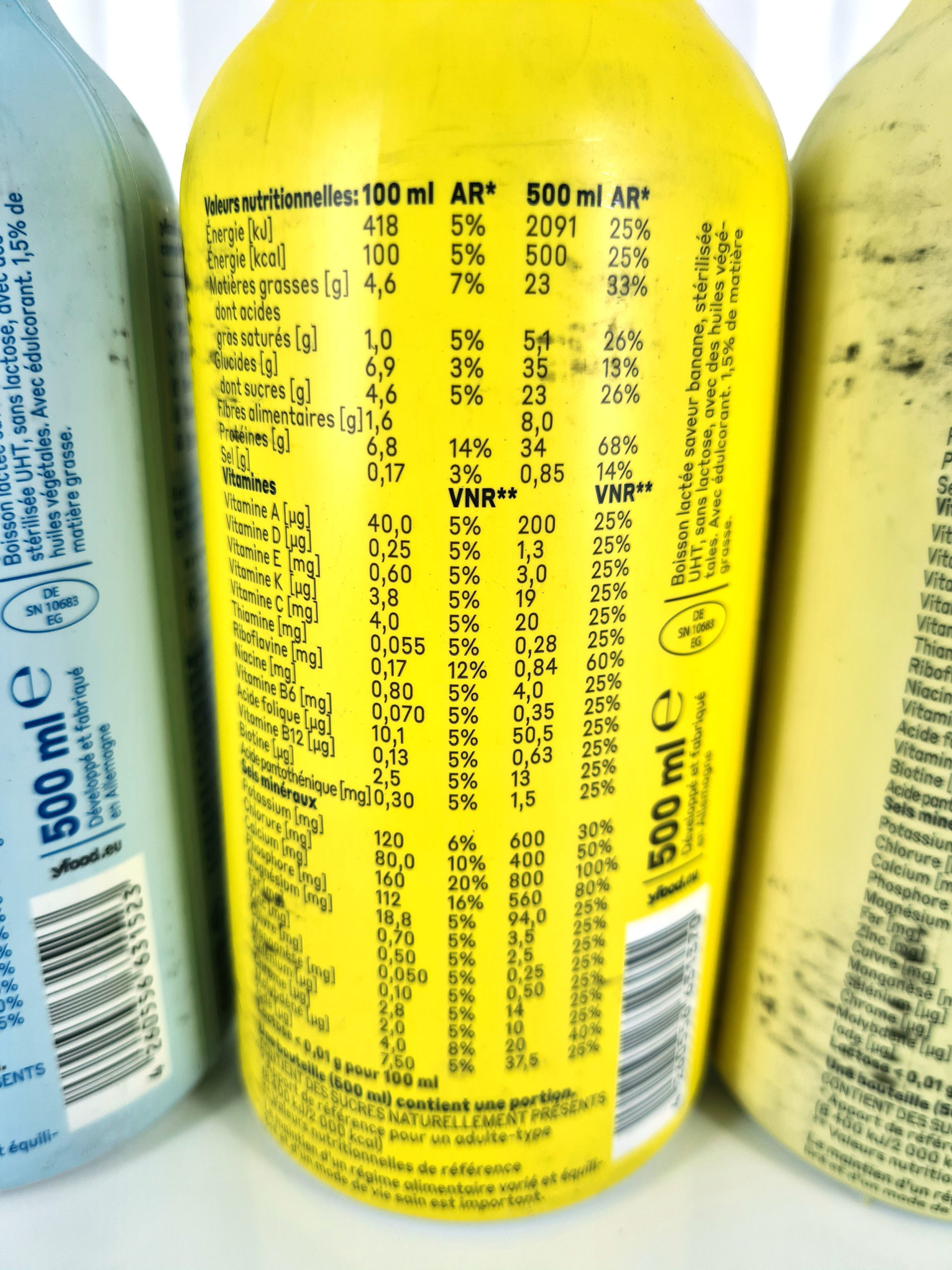 Quand on achète un produit de ce type, on ne peut que se fier aux étiquettes pour comprendre ce que la boisson contient. Toutes les boissons contiennent la même chose, seul le goût est différent. J'ai pris ici la boisson goût banane à titre d'exemple. On y retrouve les choses suivantes: