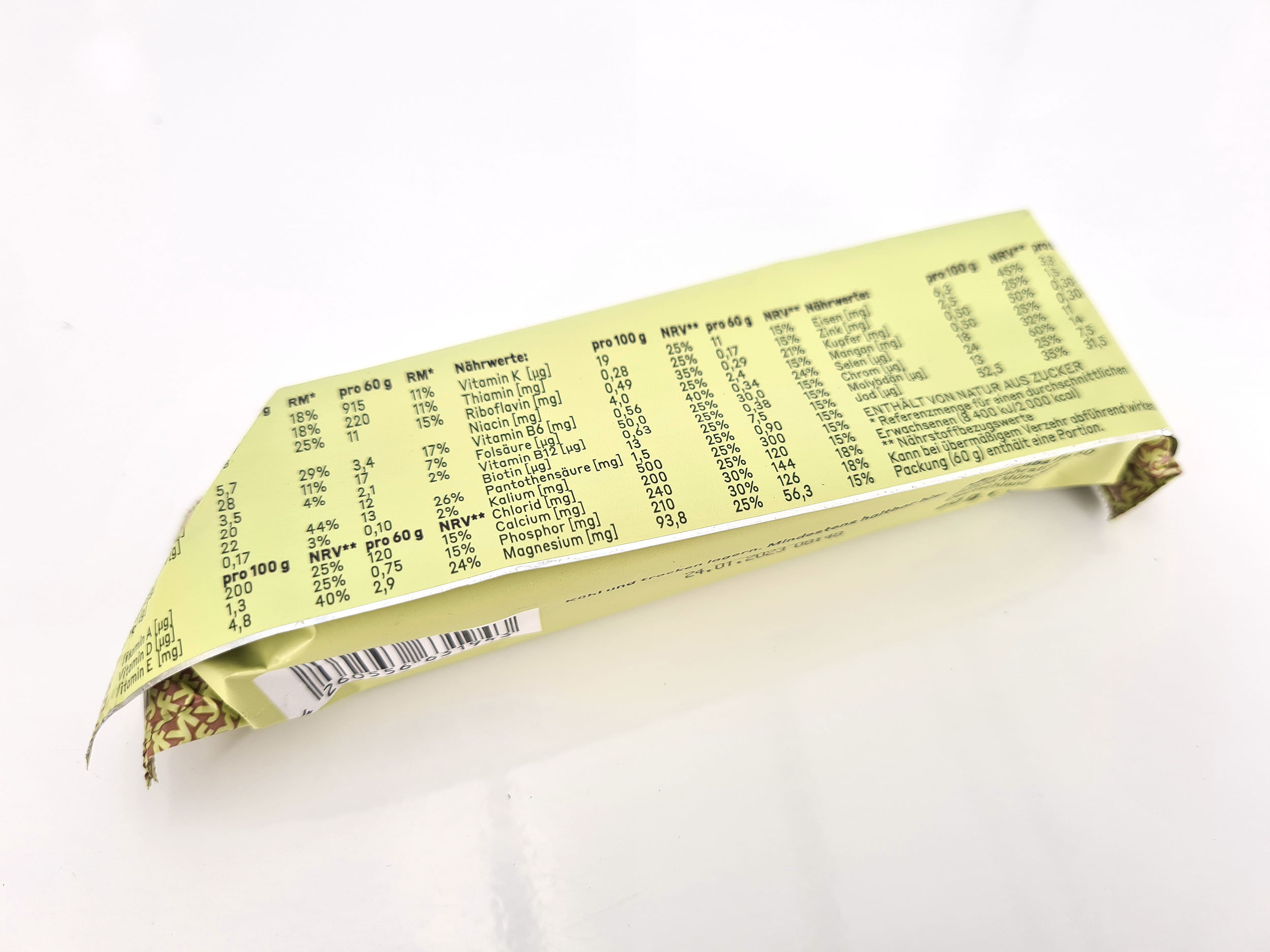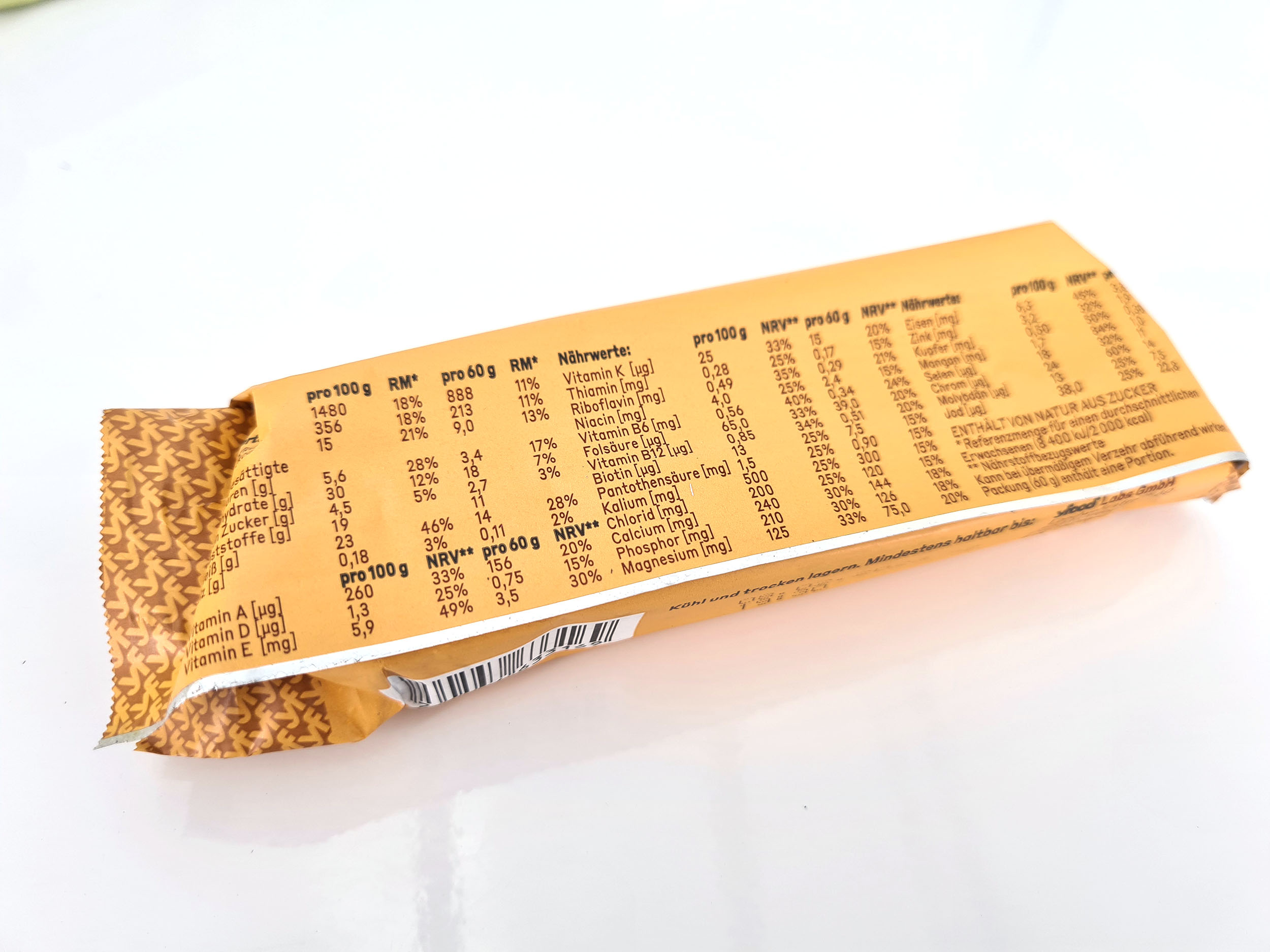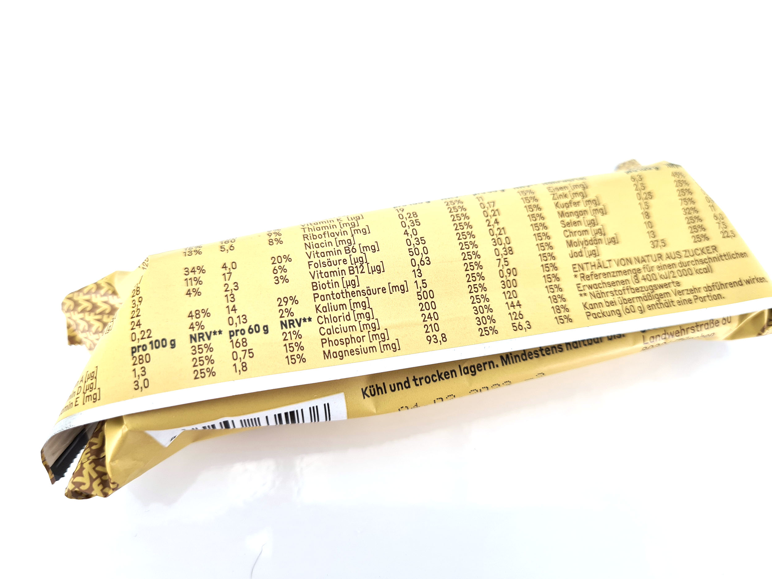 Je retrouve ici la plupart des mêmes ingrédients que dans les boissons avec quelques différences dans les quantités et quelques éléments qui ne sont pas présents dans la boisson. Ici aussi les quantités sont assez faibles et le pourcentage de l'apport journalier ne dépasse pas 24%. Ce n'est pas non plus une barre diététique mais elle est conçu pour assurer le pont entre deux repas trop éloignés.