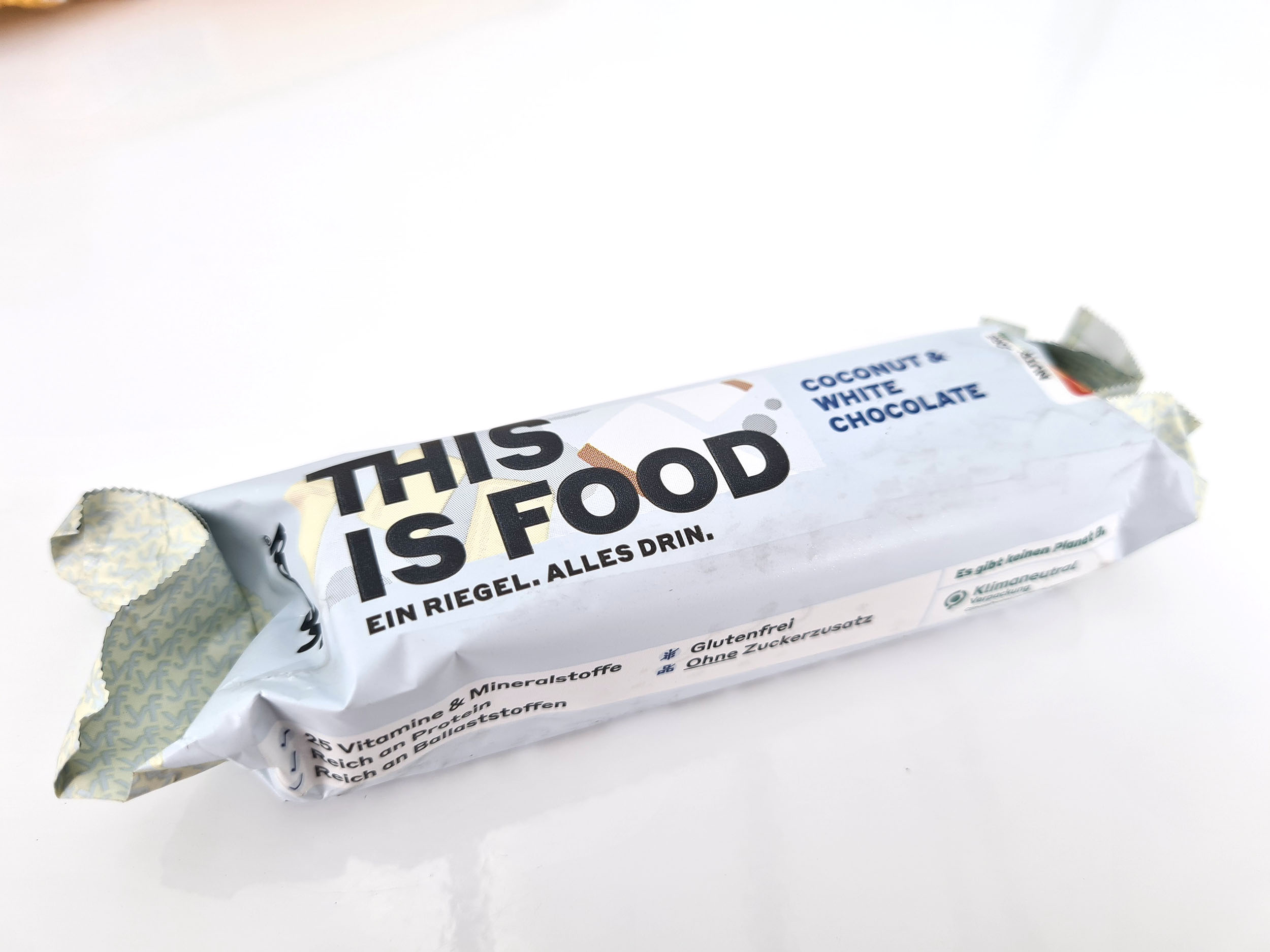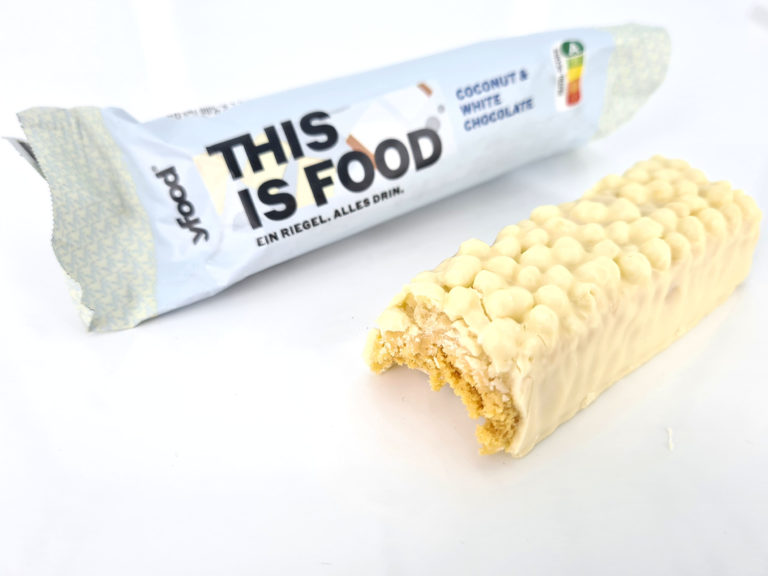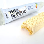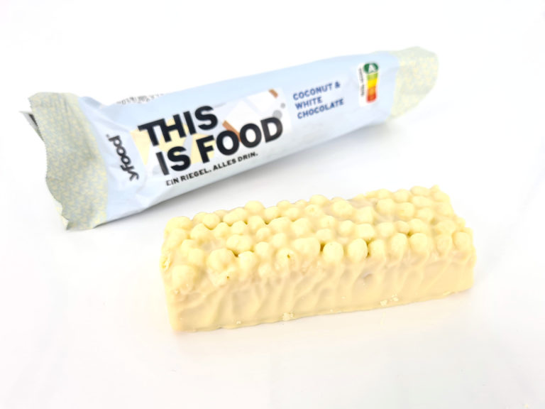 Voici un exemple de la barre chocolatée à la noix de coco, elle est enrobée par une couche de chocolat blanc.