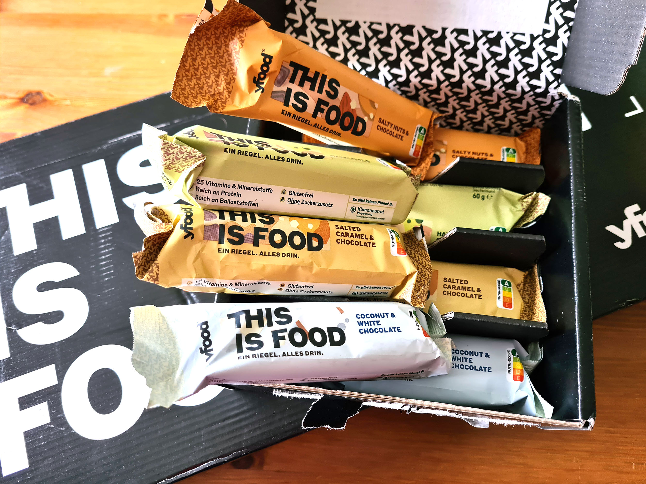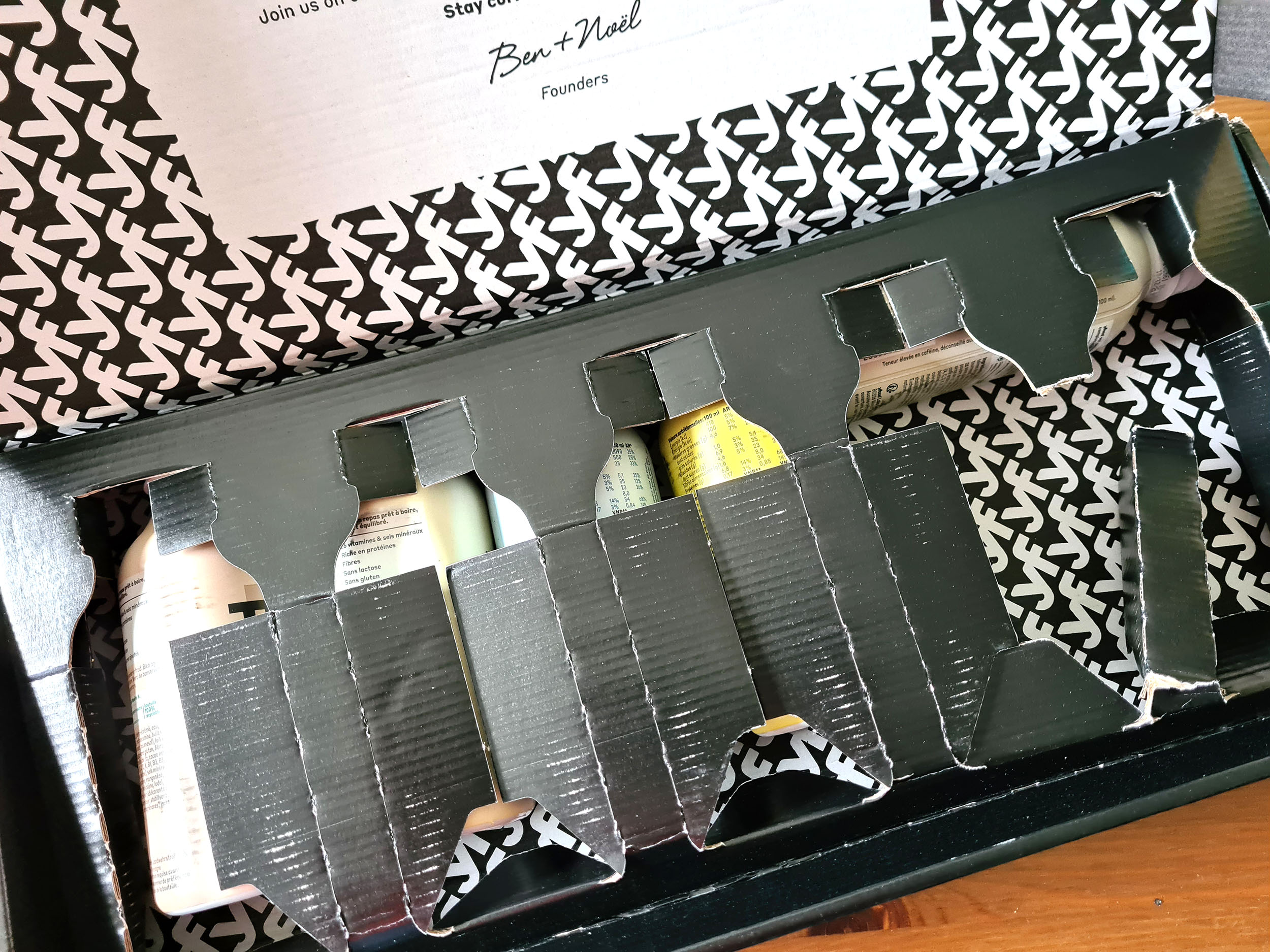 Je n'avais jamais gouté ce genre de produit et ne sachant pas trop à quoi m'attendre, j'ai acheté le pack découverte pour avoir dans la même boite 5 boissons différentes et j'ai pris l'équivalent pour les barres chocolatées (qui ont disparu du catalogue au moment d'écrire ces lignes). J'ai reçu les deux boites environ une semaine après avoir passé la commande et j'ai tout reçu en pleine canicule, il faisait plus de 35°C dehors, je me suis donc demandé si cela n'allait pas avoir une influence sur le produit.
