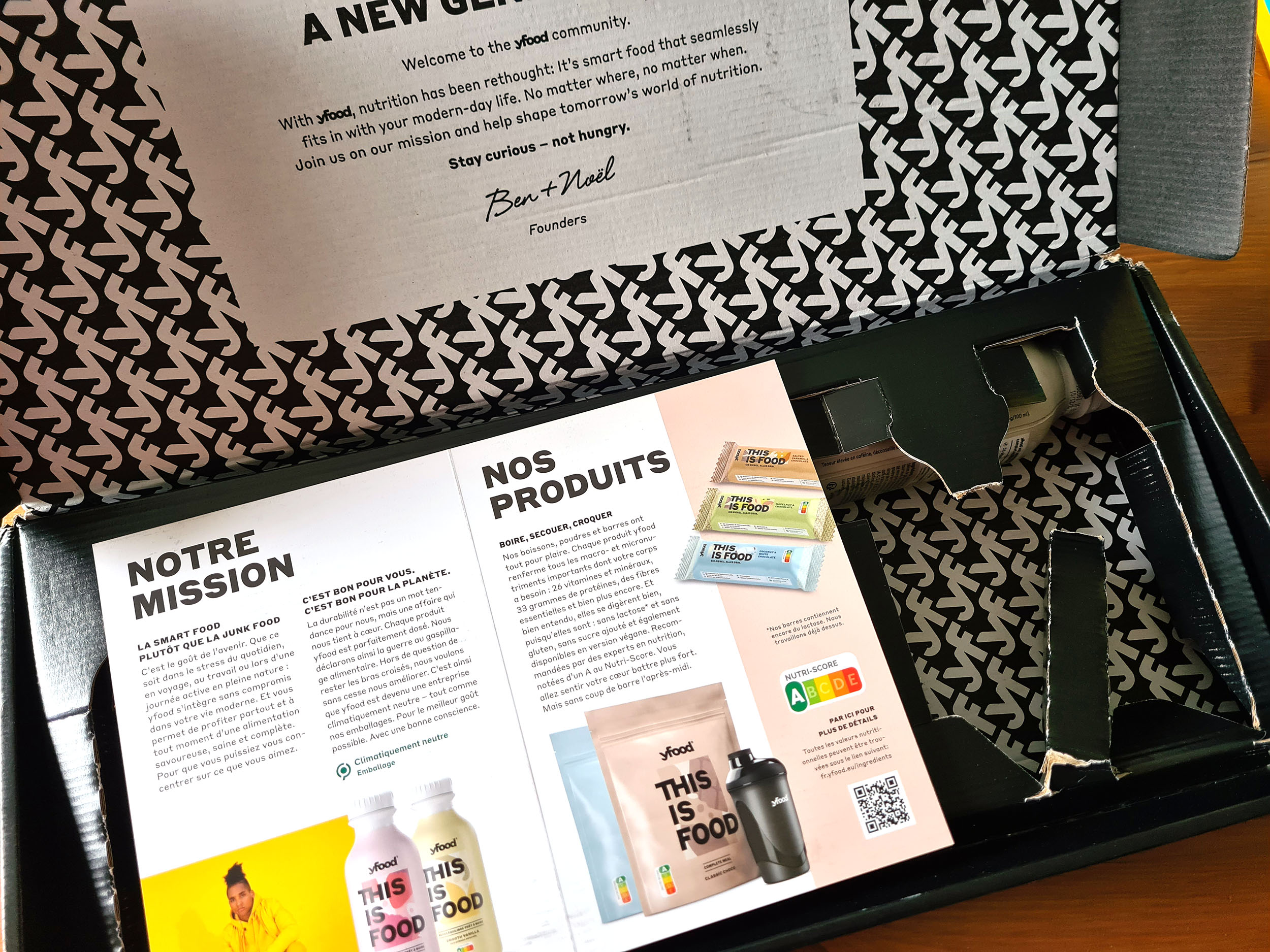 Avec ce type de boite, je vois bien que Yfood met une sérieuse couche de marketing pour gérer son image, l'emballage a une identité forte et la première impression que ça donne est que ce produit a une vocation plutôt premium. On est ici loin des emballages type carton de lait, tout est soigné pour créer une ambiance. On peut voir ça de deux façons, ils cherchent soit à créer une marque premium pour attirer un certain type de public ou alors ils cherchent à couvrir un produit moyen avec un bel emballage. Difficile de juger à ce stade-ci du test.