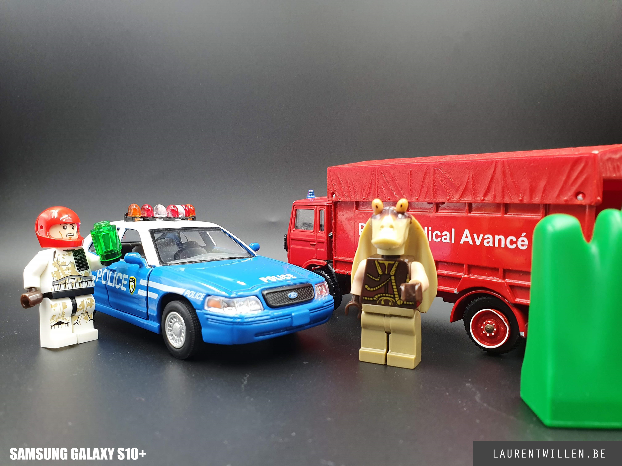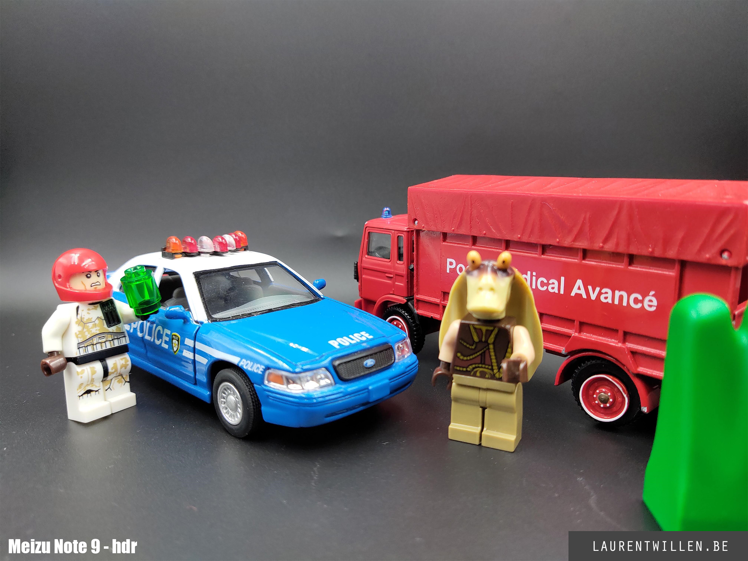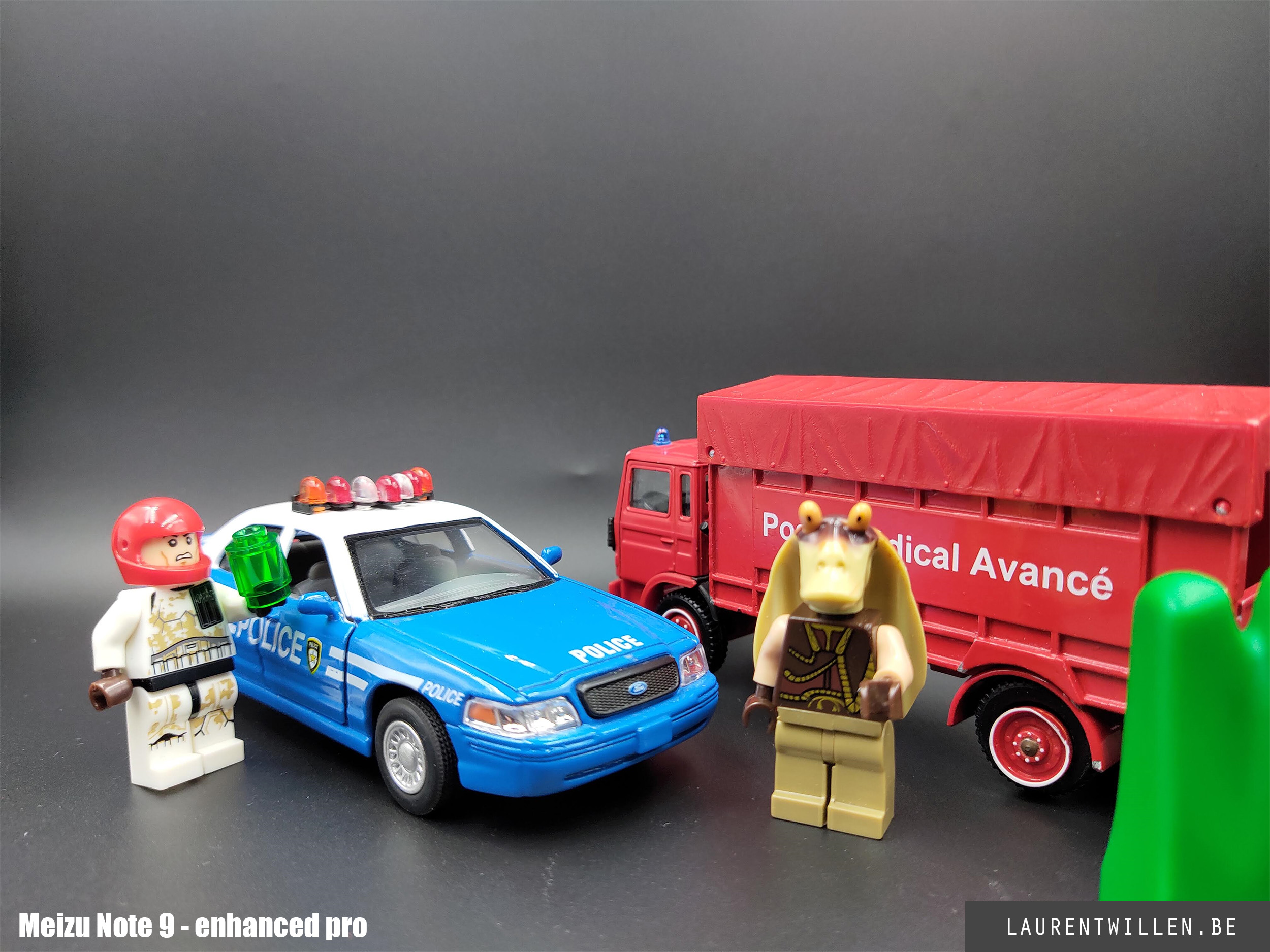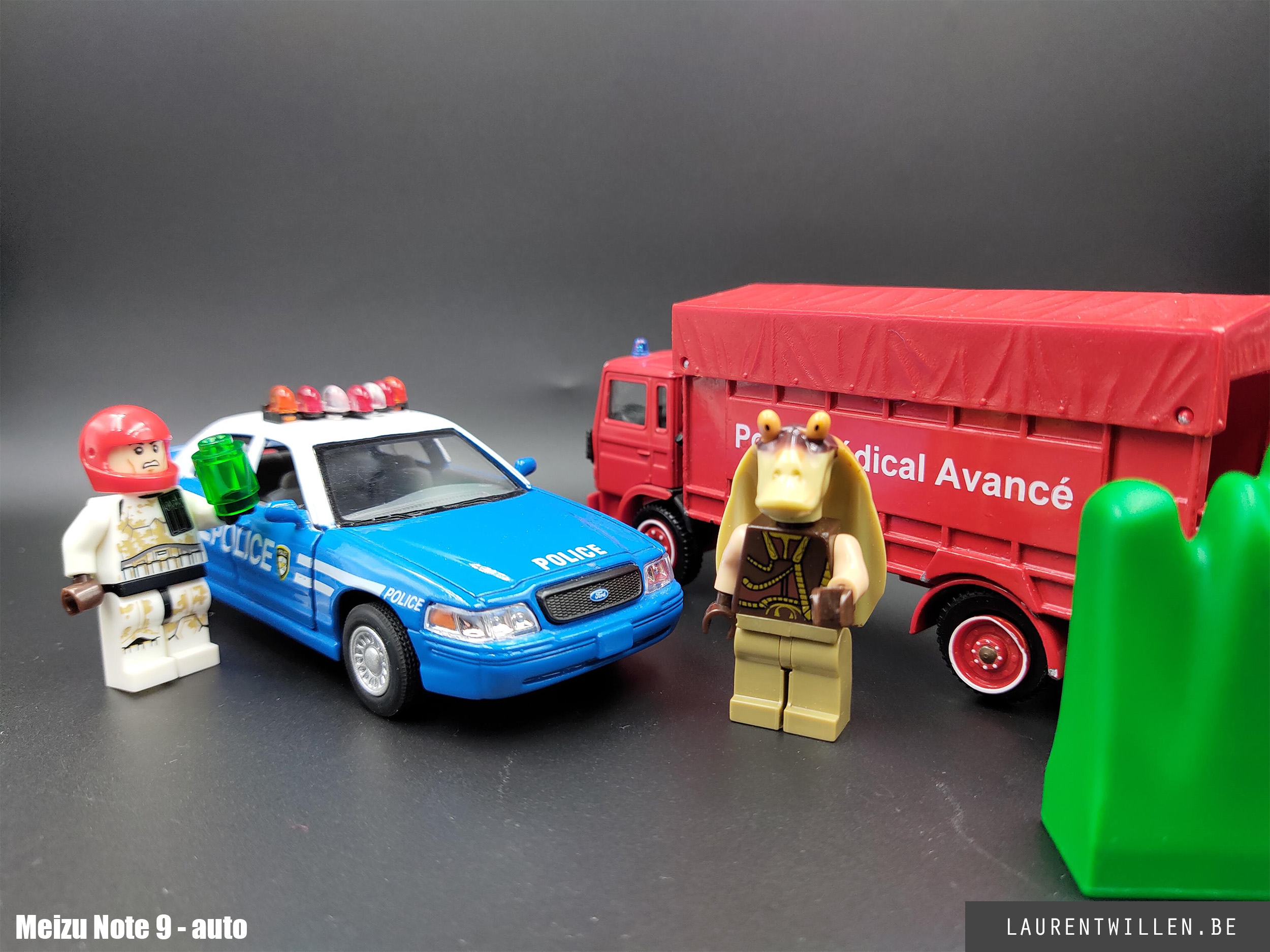 Comme pour les autres tests, j'ai commencé mon test photo par un test en studio. Cette fois, c'est mon fils de 6 ans qui a décidé de la disposition des objets et malgré son ignorance en matière de couleurs, il a fait un bon choix car on retrouve les trois couleurs primaires. J'ai rarement plusieurs téléphones en même temps mais les retards dans les livraisons m'ont permis de tester le Redmi Note 7 et le Samsung Galaxy S10+ en même temps que le Meizu.