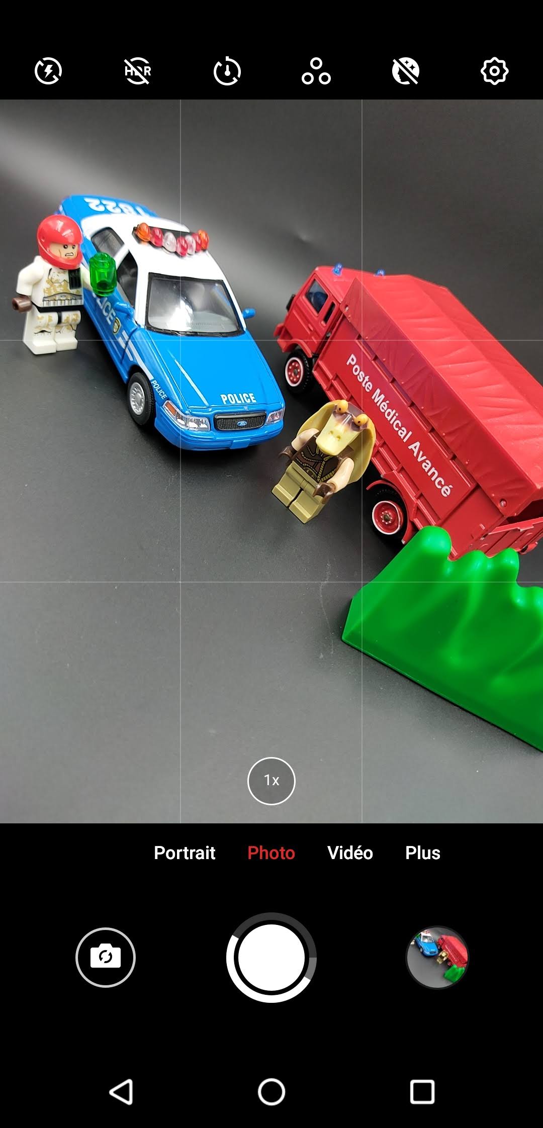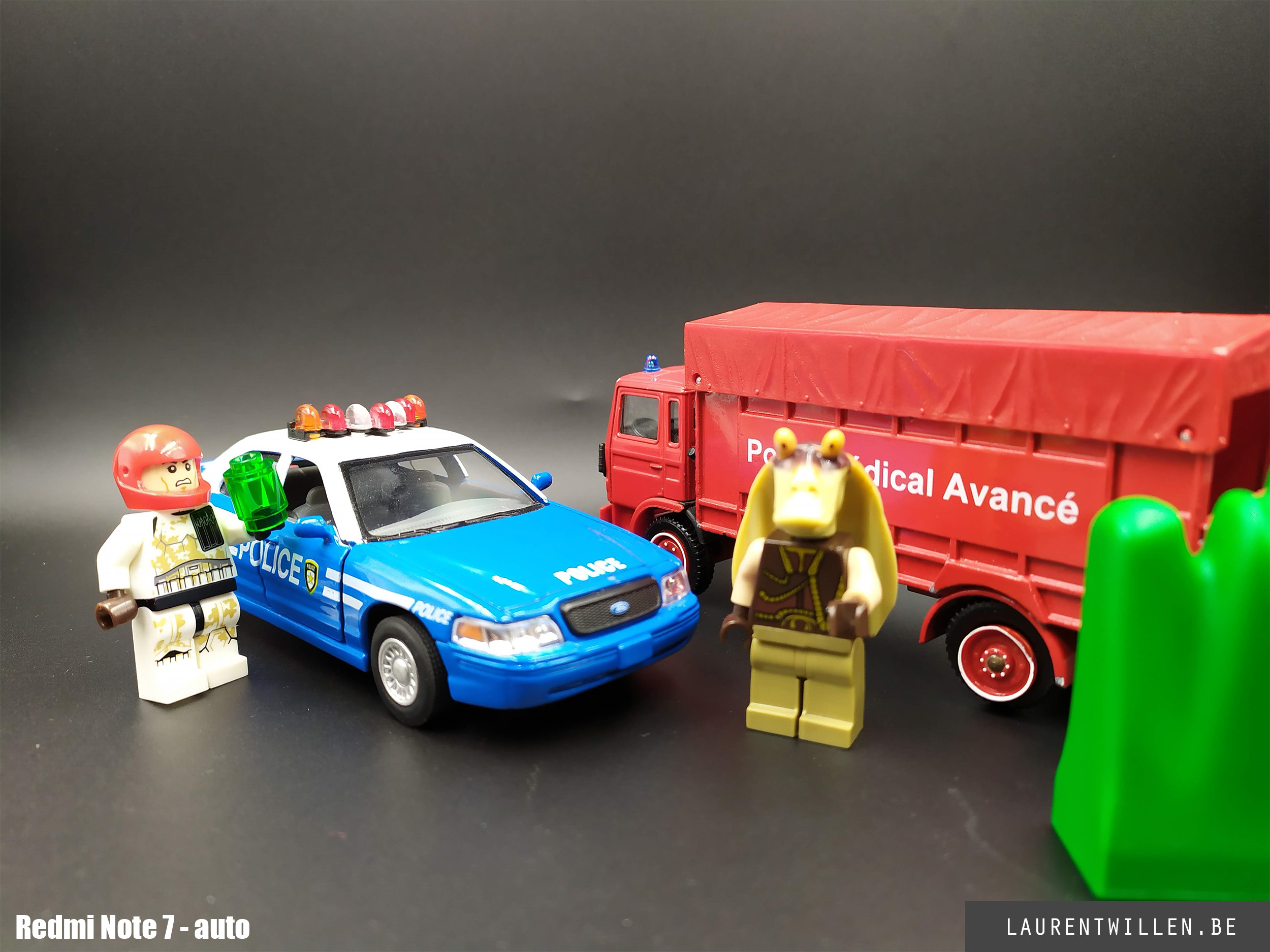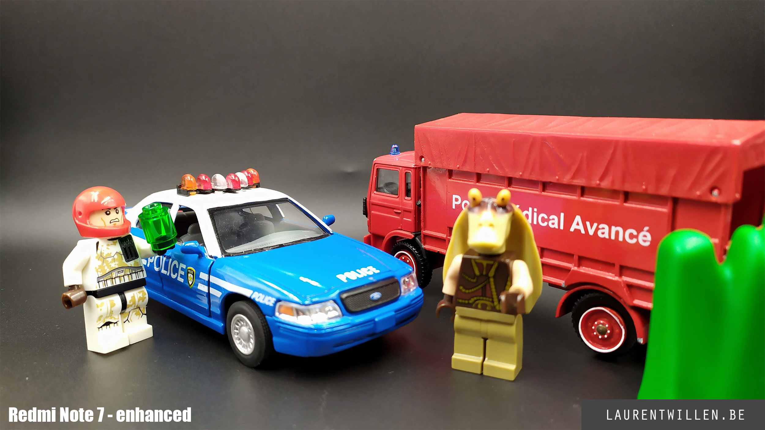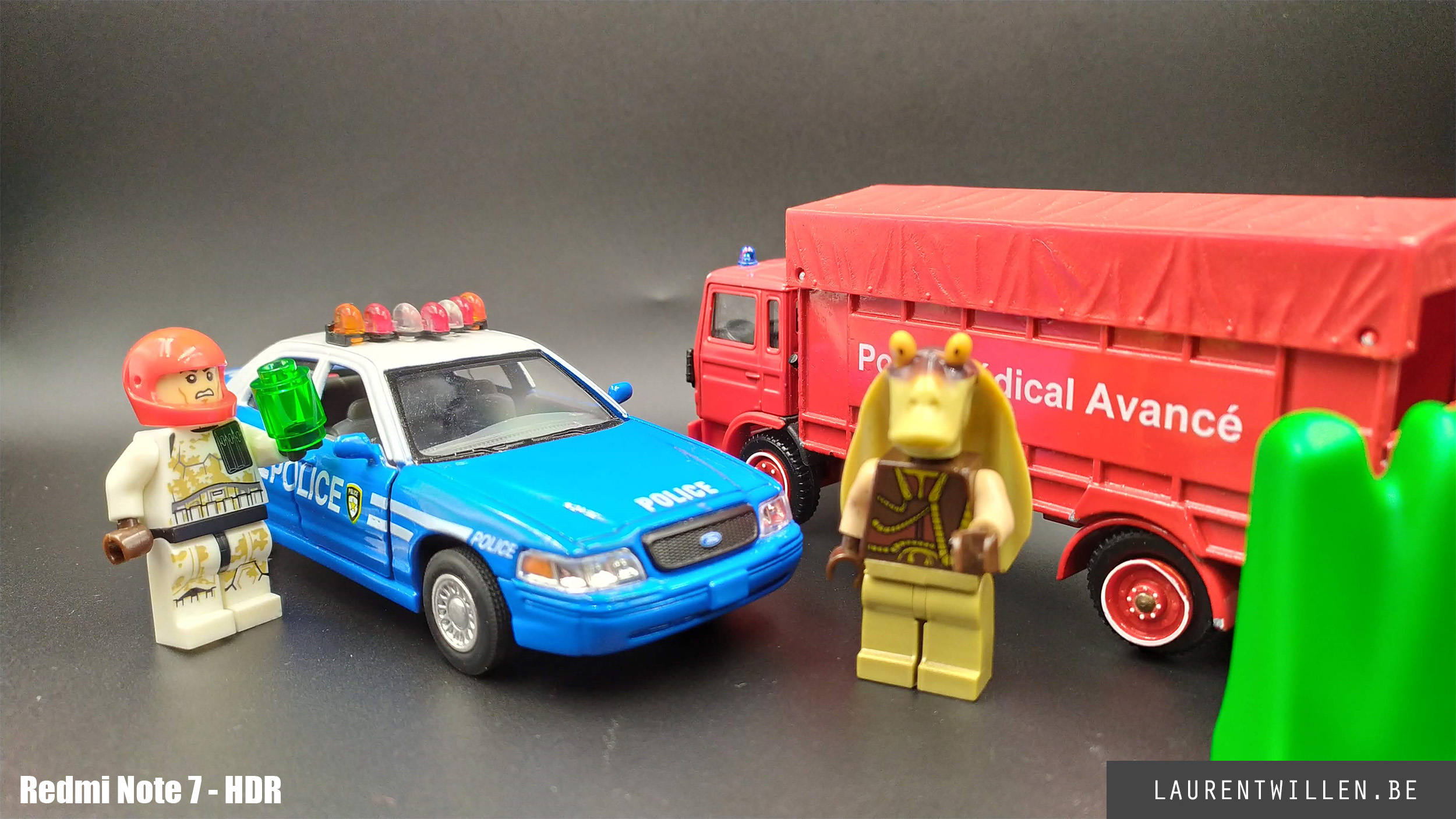 Comme pour les autres tests, j'ai commencé mon test photo par un test en studio. Cette fois, c'est mon fils de 6 ans qui a décidé de la disposition des objets et malgré son ignorance en matière de couleurs, il a fait un bon choix car on retrouve les trois couleurs primaires. J'ai rarement plusieurs téléphones en même temps mais les retards dans les livraisons m'ont permis de tester le Redmi Note 7 et le Samsung Galaxy S10+ en même temps que le Meizu.