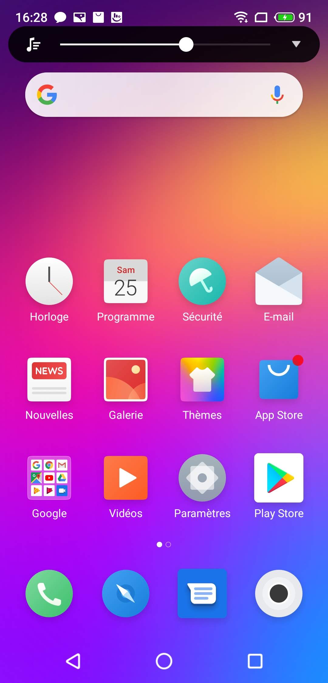 En bas de l'écran d'accueil on retrouve un moteur de recherche interne à l'appareil qui permet également de faire des recherches sur le web mais ces recherches aboutissent sur un site de recherche en Russe! Le téléphone est pourtant configuré correctement en français avec la Belgique comme pays de référence.