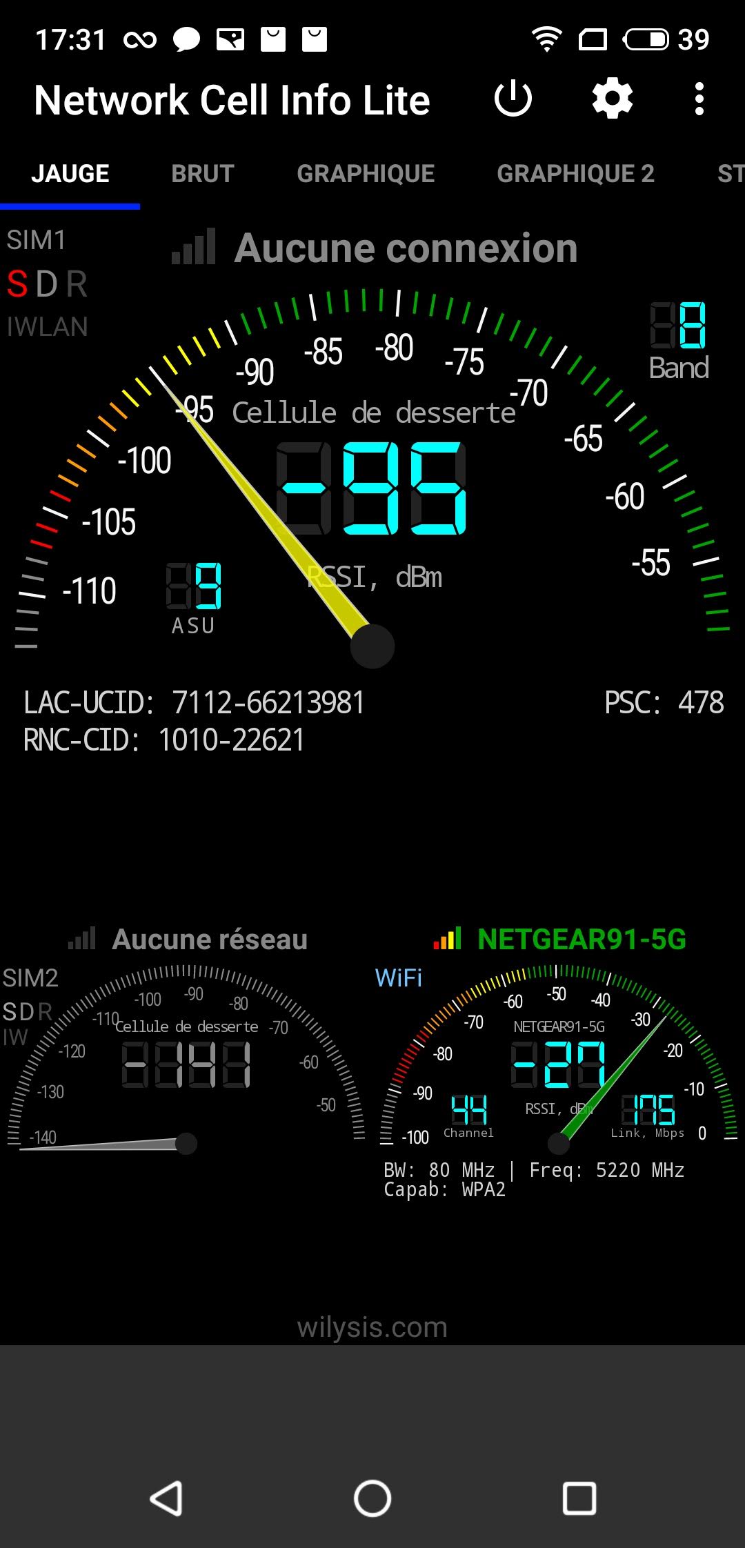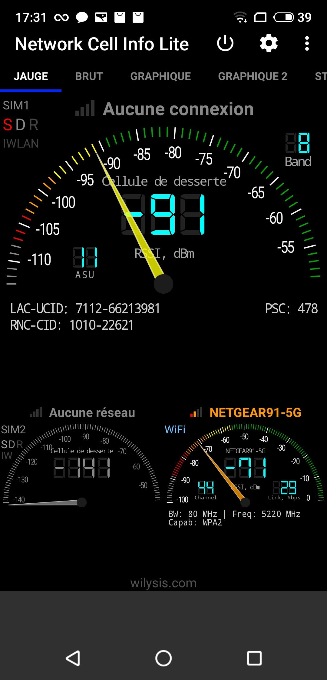 Sur le graphe ci-dessous, je compare 2 téléphones sur les mêmes cellules pour voir lequel capte le mieux le réseau. Le téléphone qui capte le mieux réseau est celui qui occupe le plus d'espace.