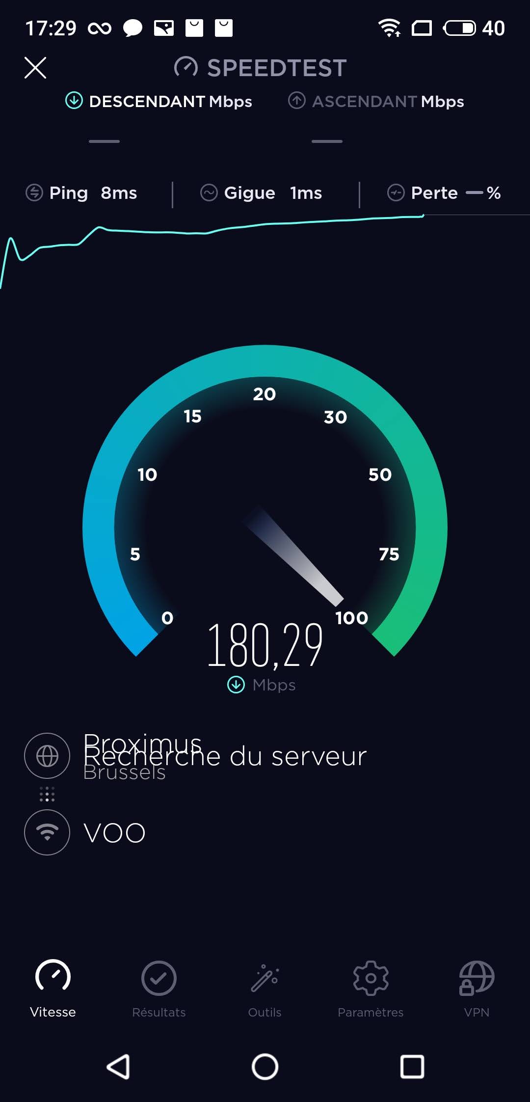Pour le test de téléchargement, j'ai obtenu une vitesse de download entre 190 et 200Mbps alors qu'avec d'autres appareils je suis monté au delà des 250Mbps. Ce n'est donc clairement pas le téléphone le plus rapide mais 200Mbps c'est très largement suffisant pour faire du streaming en HD. Pour l'upload, comme d'habitude, la vitesse est limitée par mon fournisseur d'accès.