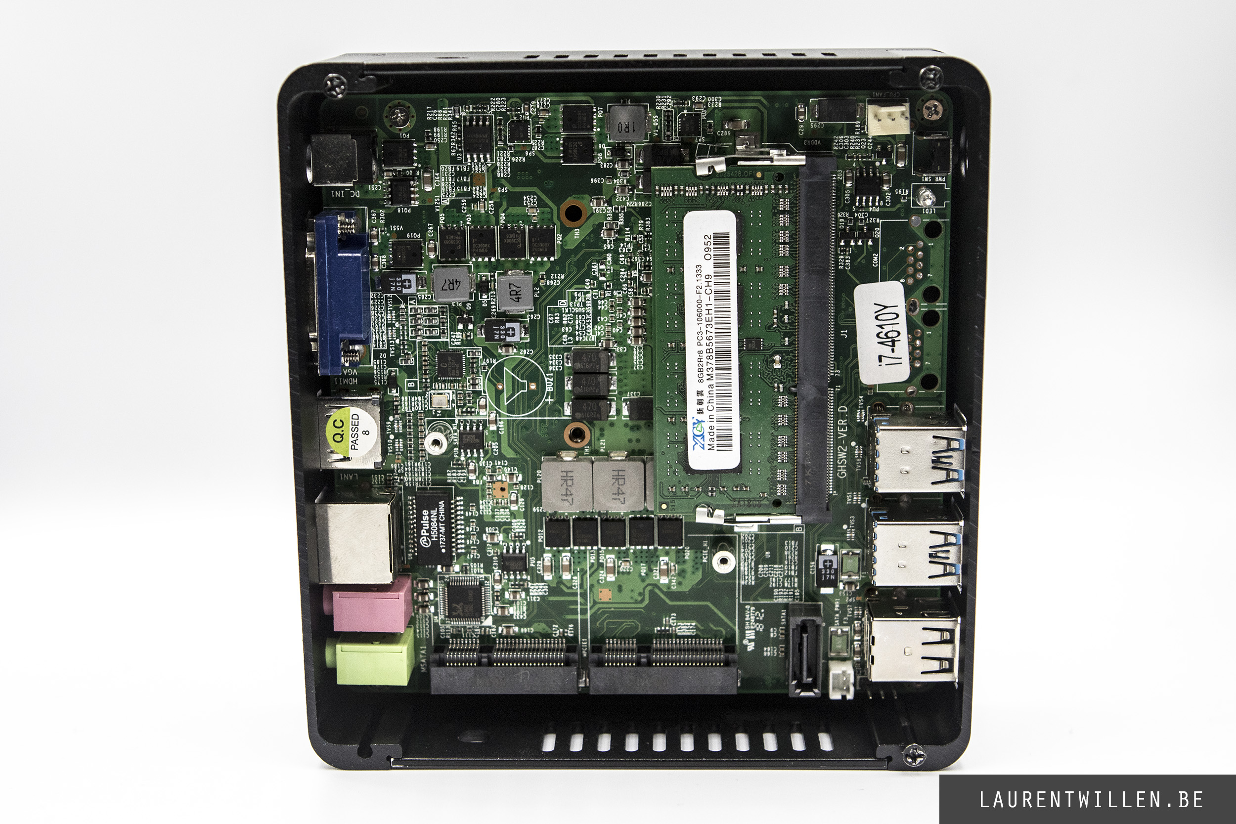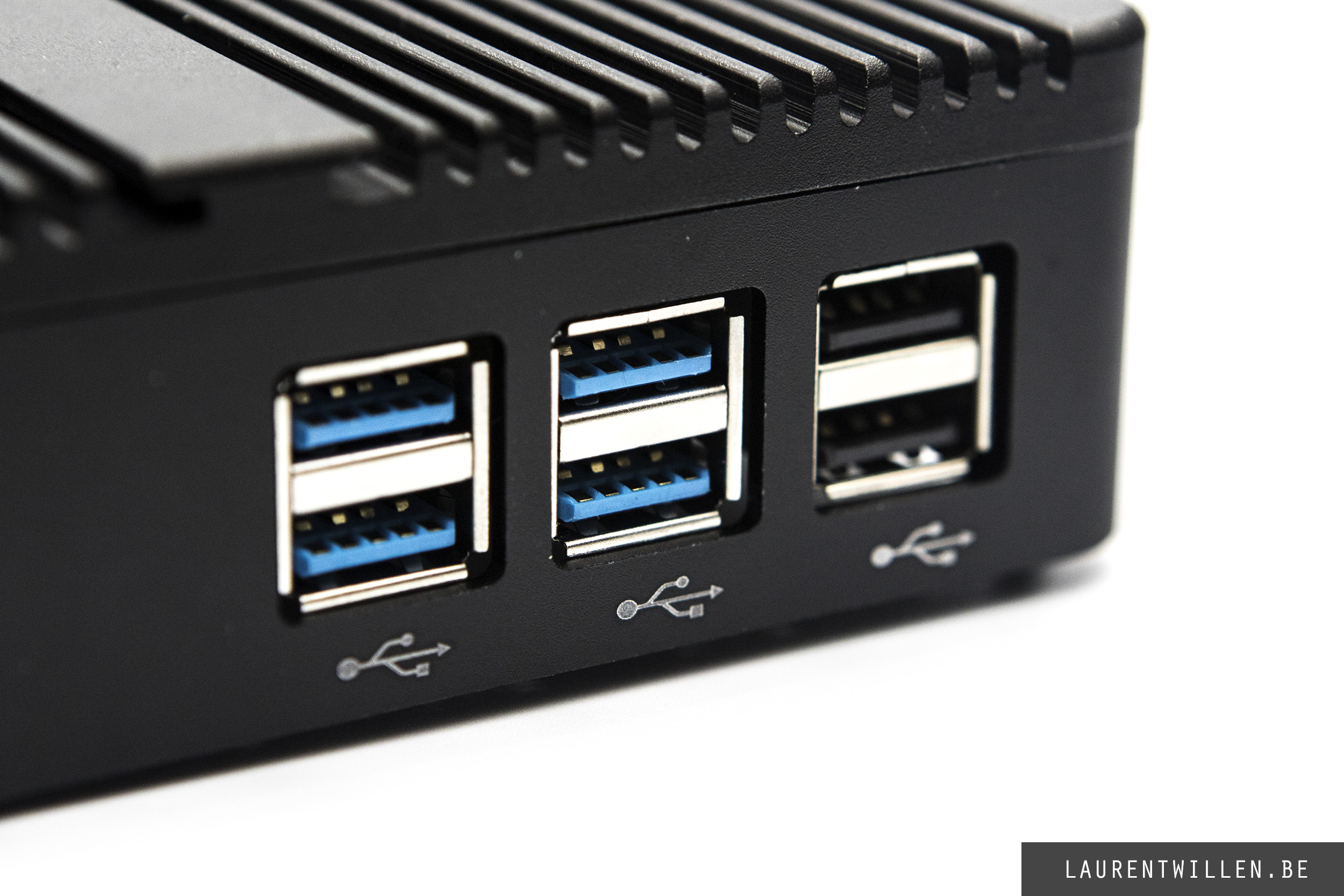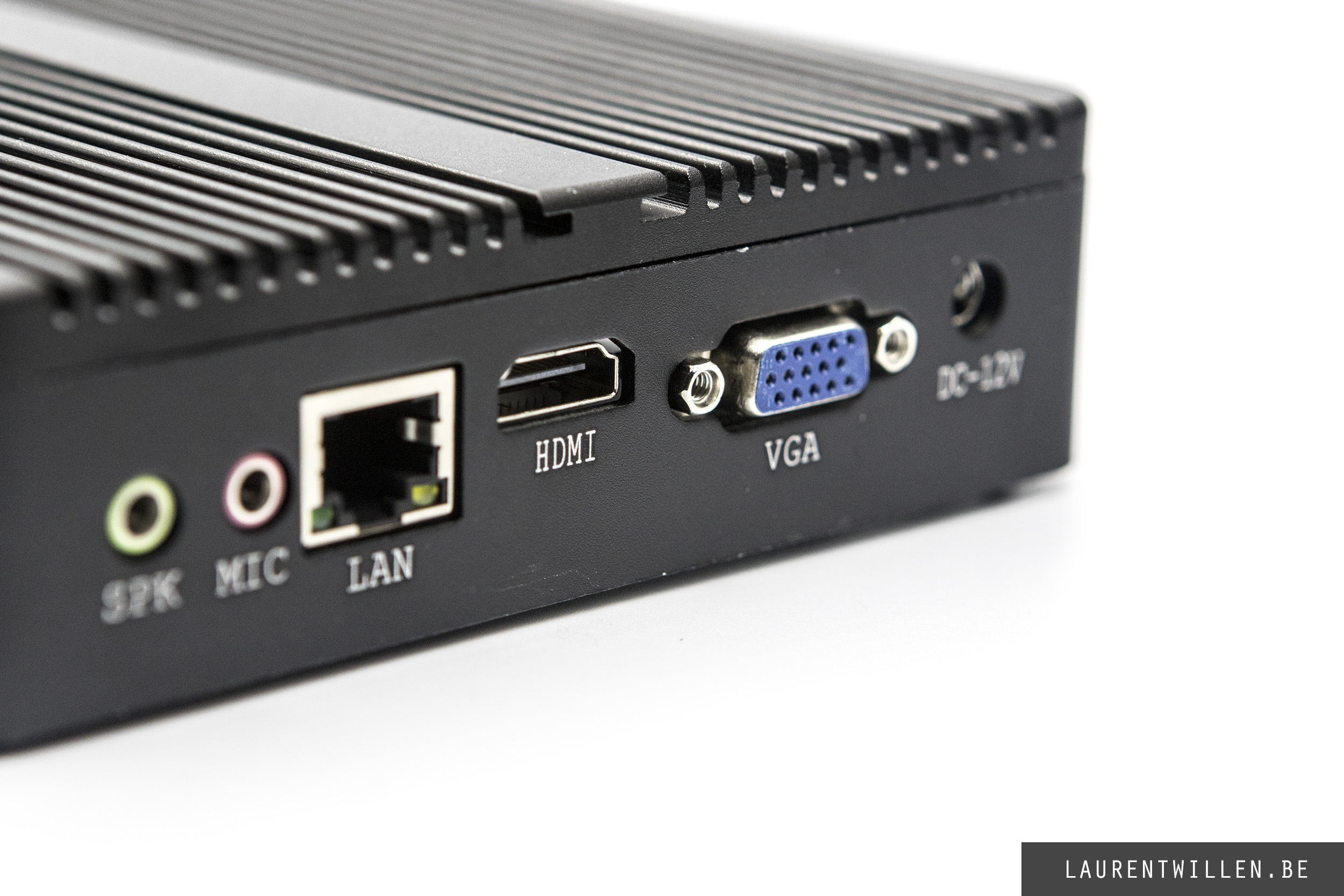 Le mini PC dispose de 6 ports USB dont 4 en USB 3.0. A l'arrière on retrouve un connecteur micro, un connecteur Jack, un port ethernet, un port HDMI, une sortie VGA et la prise d'alimentation.