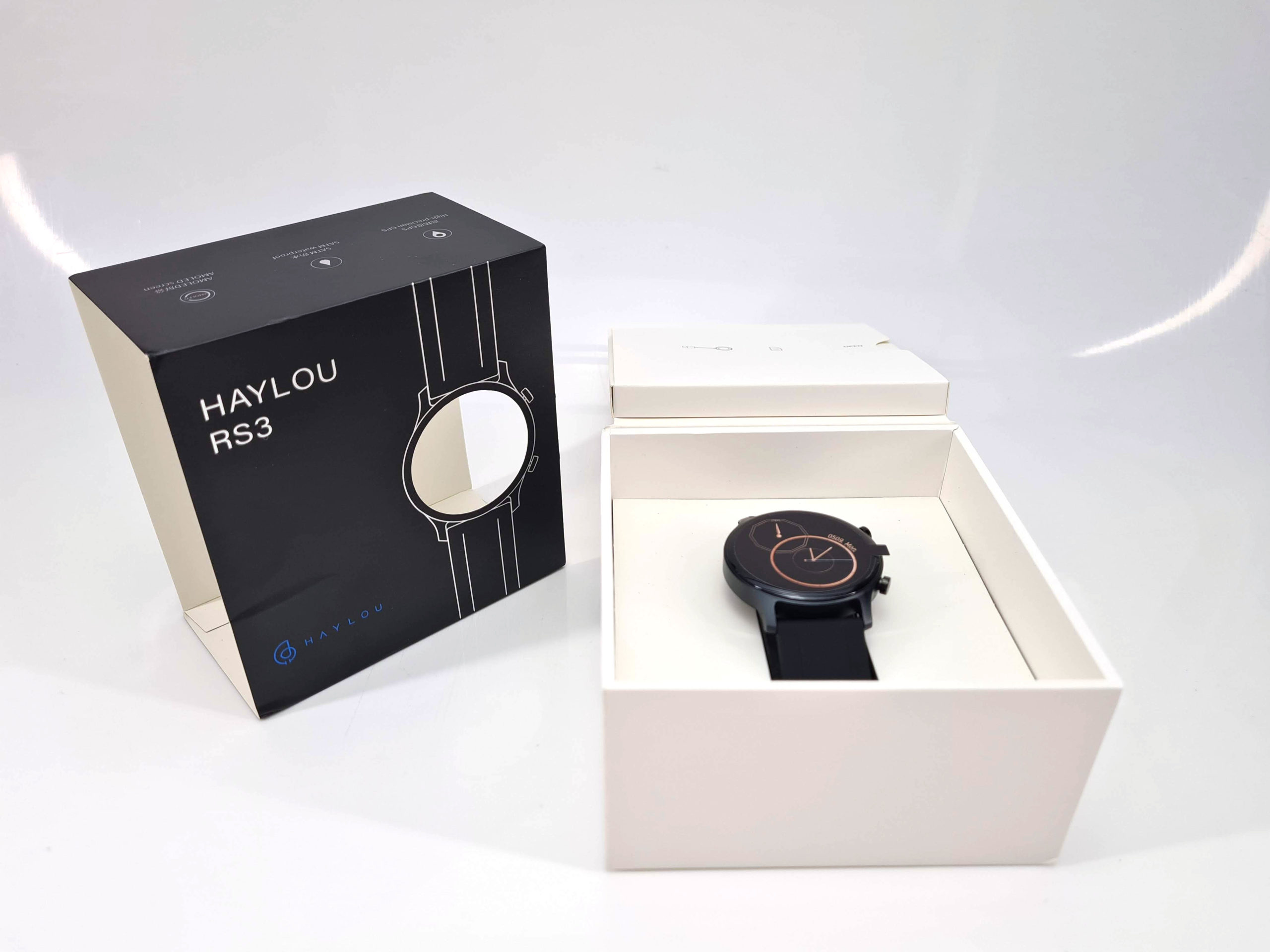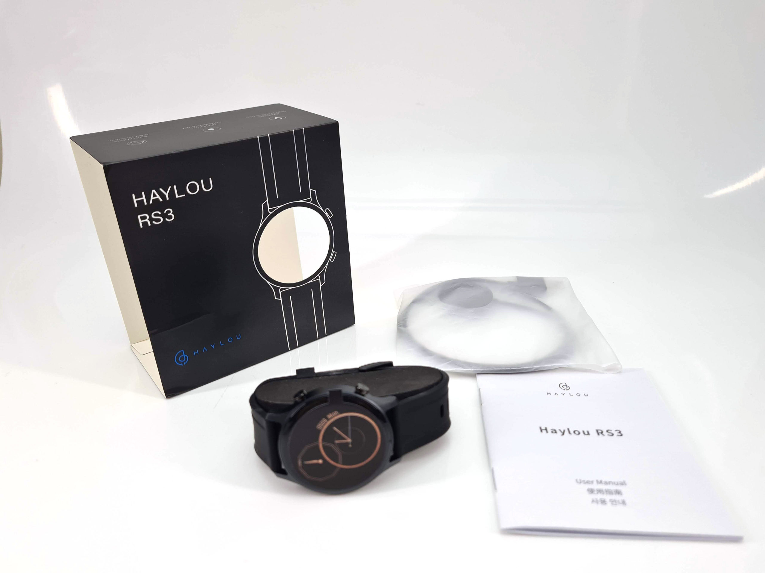 L'emballage d'un produit donne souvent une indication du positionnement du produit et la Haylou RS3 ne se positionne pas en entrée de gamme nie en gamme premium. L'emballage est soigné sans avoir un effet wow mais on est loin des emballages simplistes de marques comme Kospet par exemple. La boite contient la montre, un chargeur magnétique via USB ainsi qu'un manuel.