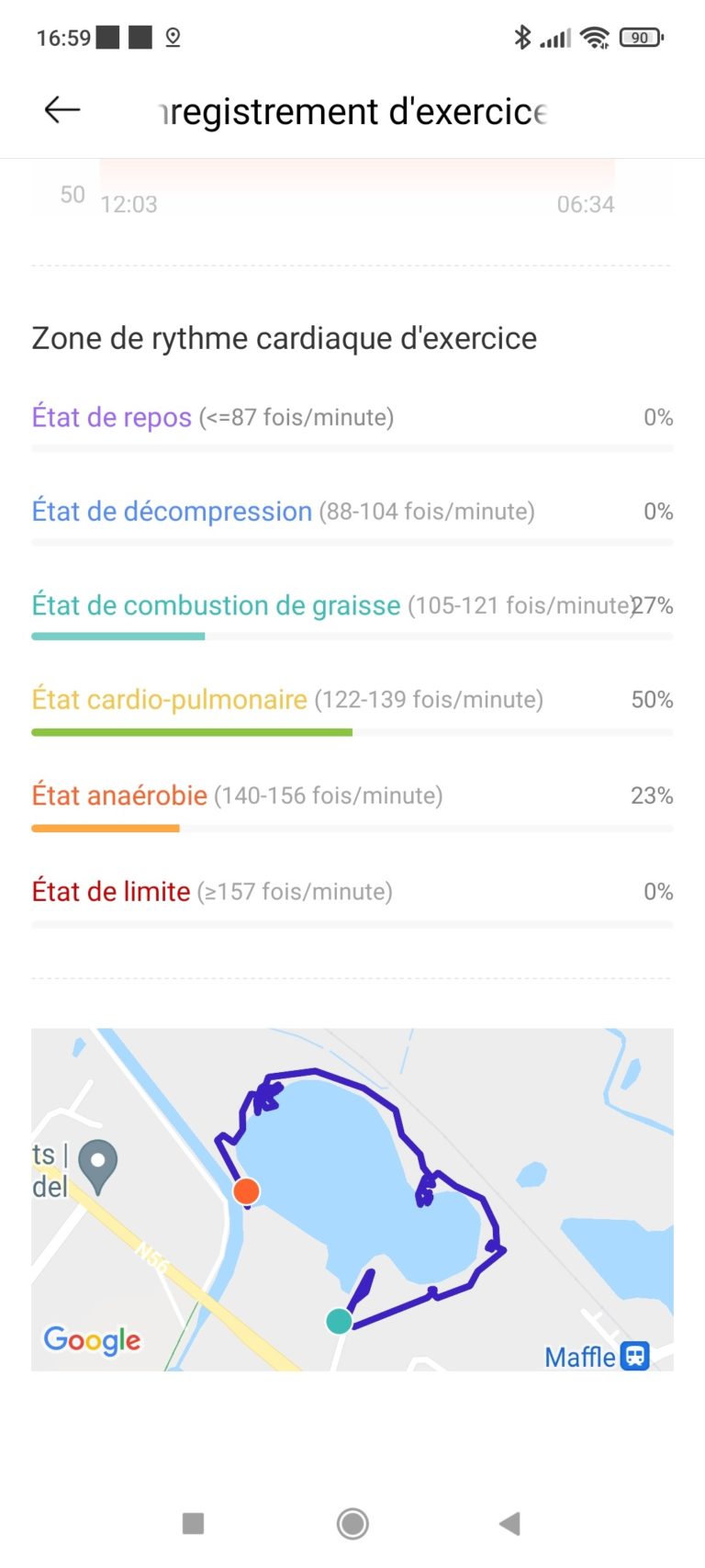 La Haylou RS3 dispose de son propre chipset GPS, elle est donc totalement autonome pour le positionnement. La connexion au réseau GPS n'est pas toujours très rapide mais plutôt que d'attendre que la connexion se fasse, le mieux est de démarrer l'exercice. Le positionnement sur une carte semble assez bon, j'ai par exemple fait un test en me promenant autour d'une étendue d'eau où il n'y a pas de route à laquelle la carte peut se raccrocher et comme vous pouvez le voir, mon parcours est assez fidèle car je me suis arrêté plusieurs fois au bord de l'eau pour faire des photos et on voit mes aller-retours.