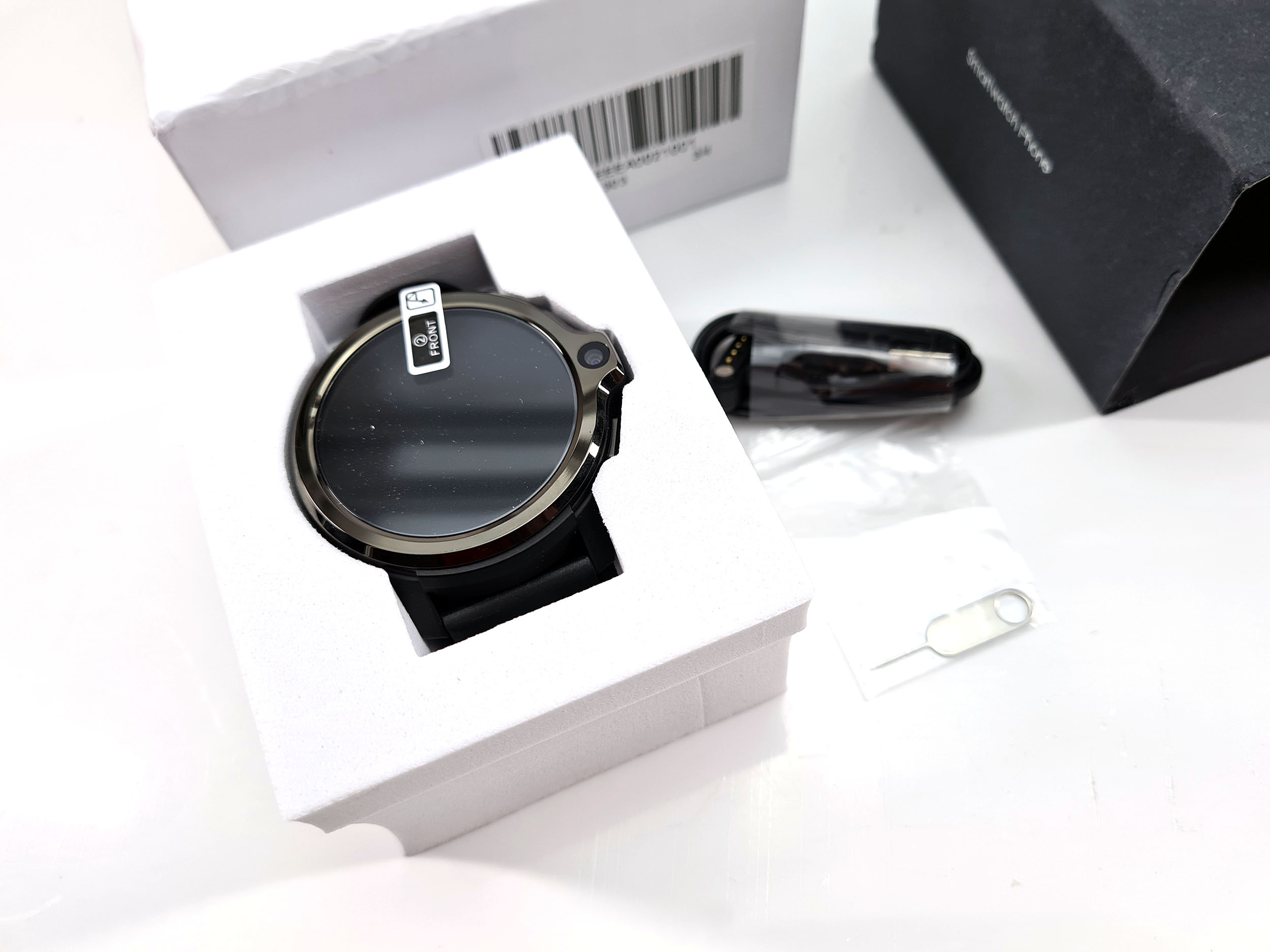 Les autres montres Kospet que j'ai testées étaient emballées dans des boites presque anonymes qui ne laissaient pas de doute sur leur positionnement d'entrée de gamme. La Kospet Prime S a un emballage assez sobre mais se détache quand même du positionnement d'entrée de gamme, la montre est mieux protégée et les accessoires sont placés des boites en carton alors que tout aurait pu être posé dans le fond de la boite comme pour les autres montres. La boite contient la montre, un manuel, une aiguille pour ouvrir le tiroir sim et un cable magnétique pour recharger la montre (vous pouvez l'associer à n'importe quel chargeur usb).