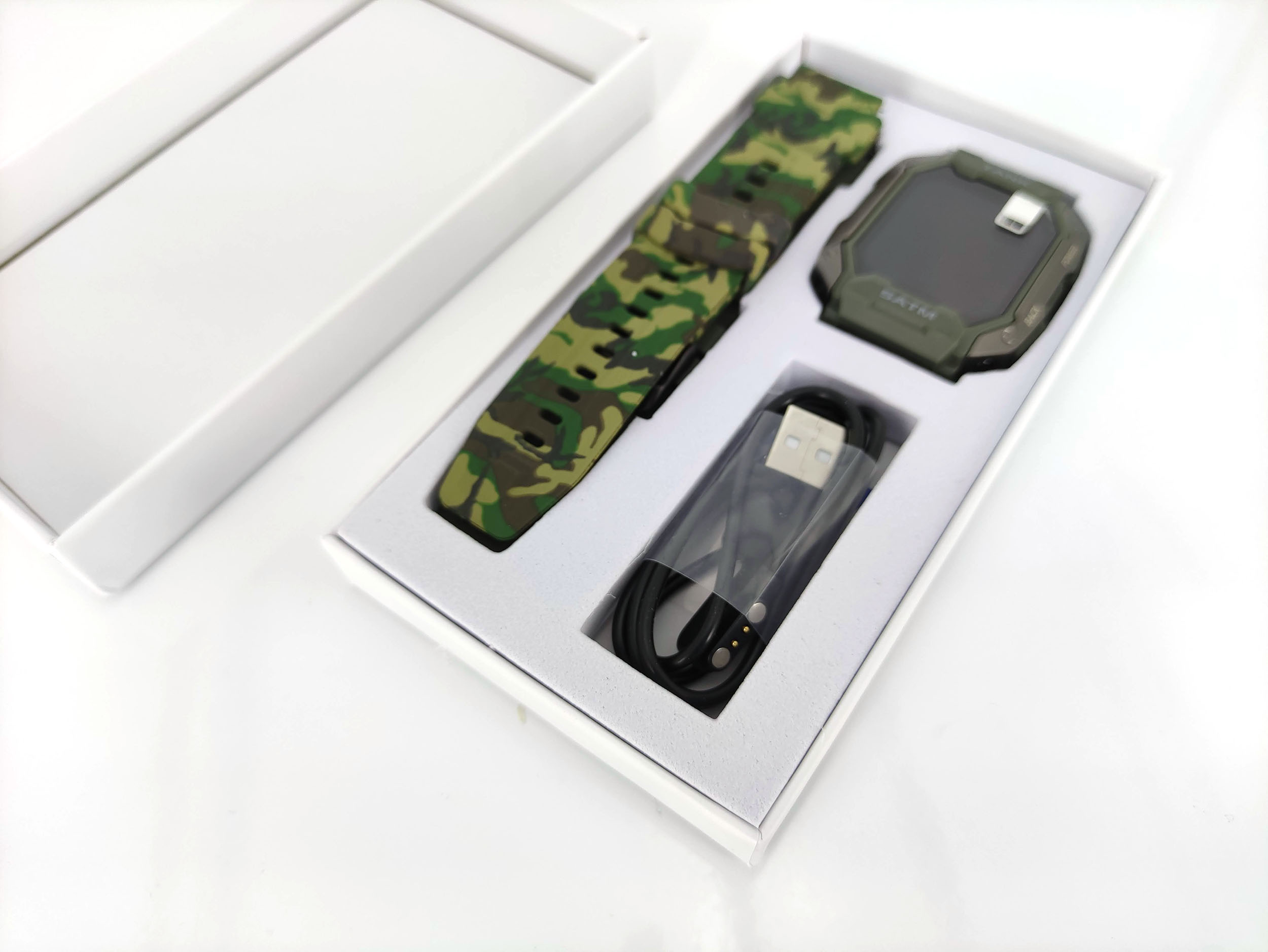Kospet commercialise des montres de plusieurs types et dans des gammes de prix assez différentes, cette fois ils ont opté pour une boite plate qui contient la montre, deux bracelets en silicone (vert kaki et texture militaire), un cable magnétique pour recharger la montre et un manuel.