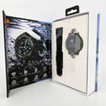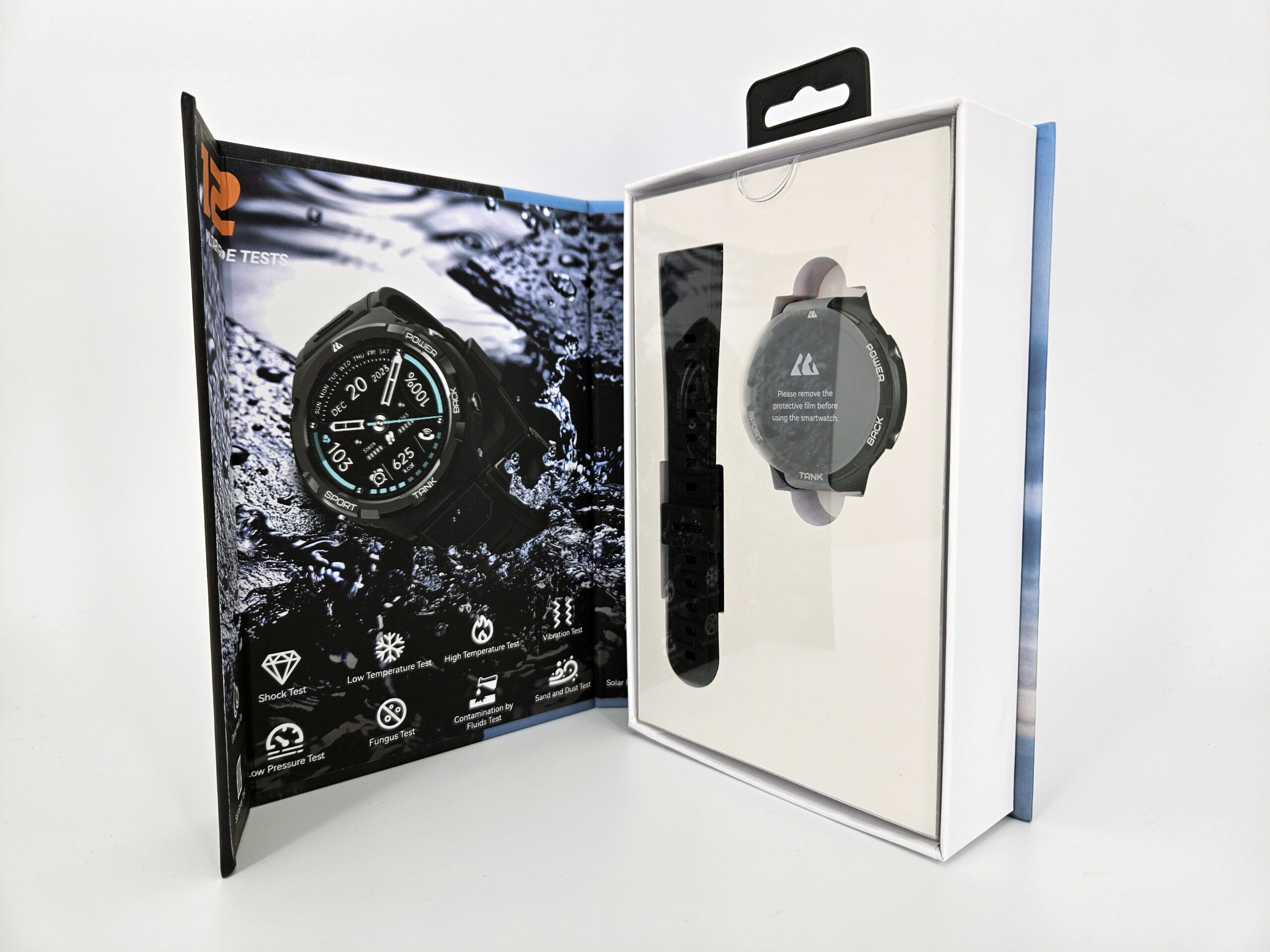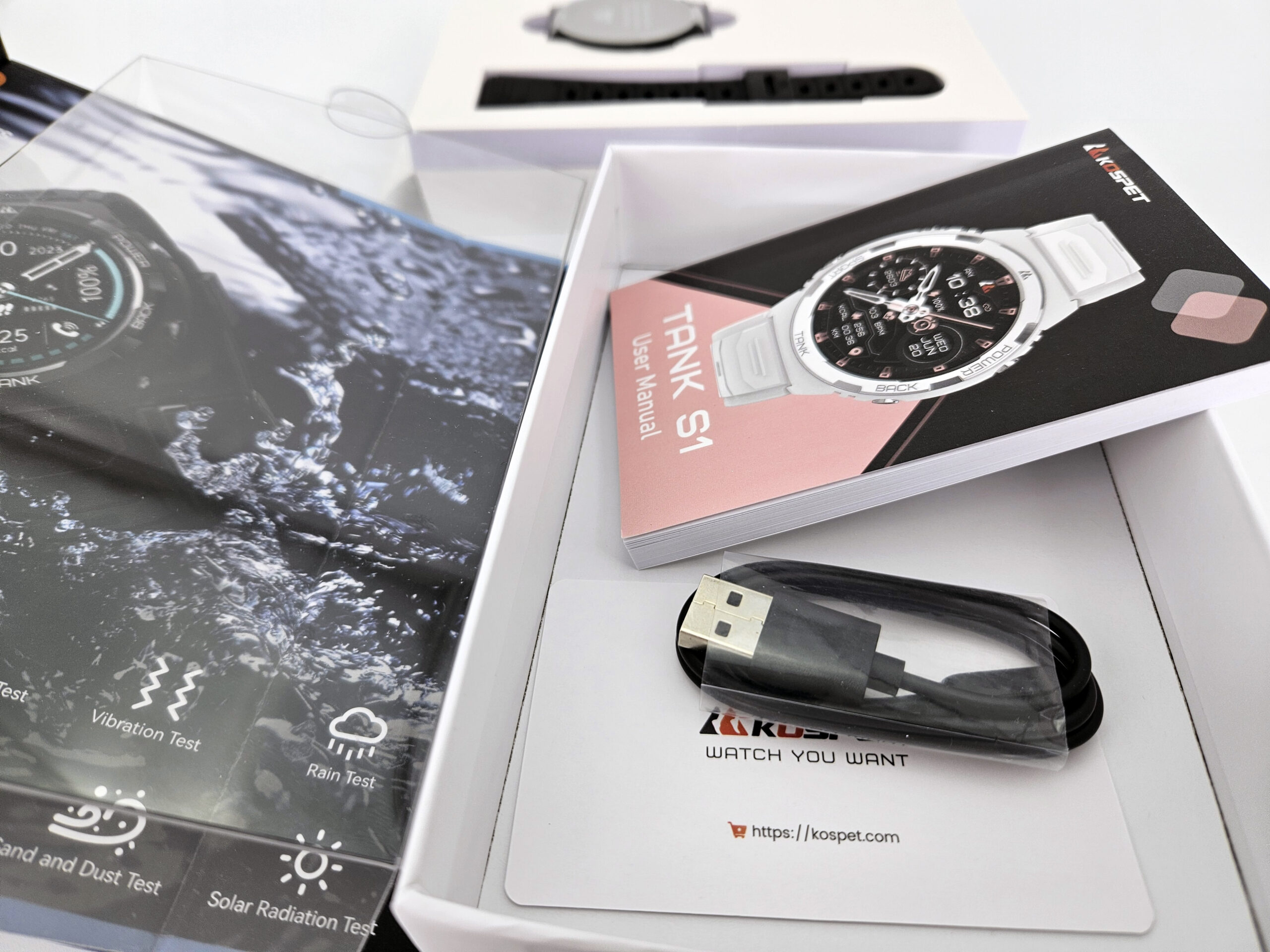 La boite contient la montre, un bracelet en silicone mou, un manuel et un chargeur usb type A avec un connecteur propriétaire pour charger la montre. Je pense que ce connecteur est le même que la génération précédente de Kospet Tank. L'emballage met l'accent sur la résistance de la montre mais en montrant aussi son esthétique qui se démarque un peu de la gamme Tank.