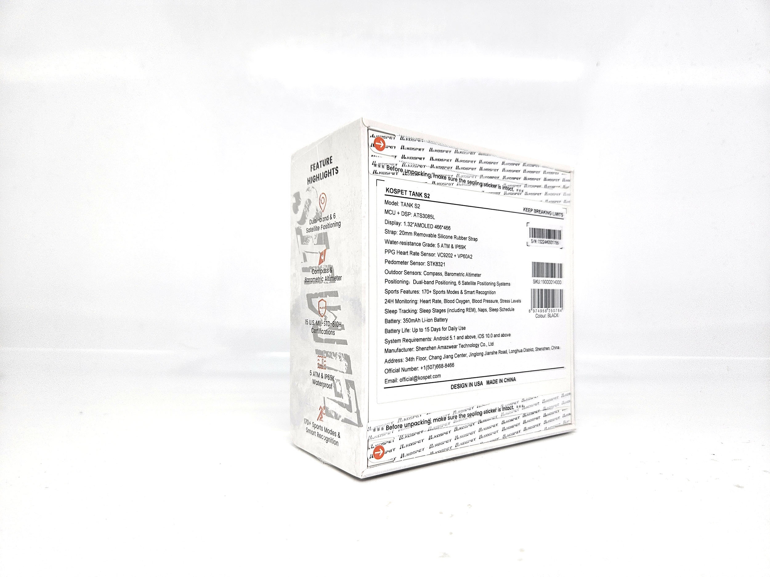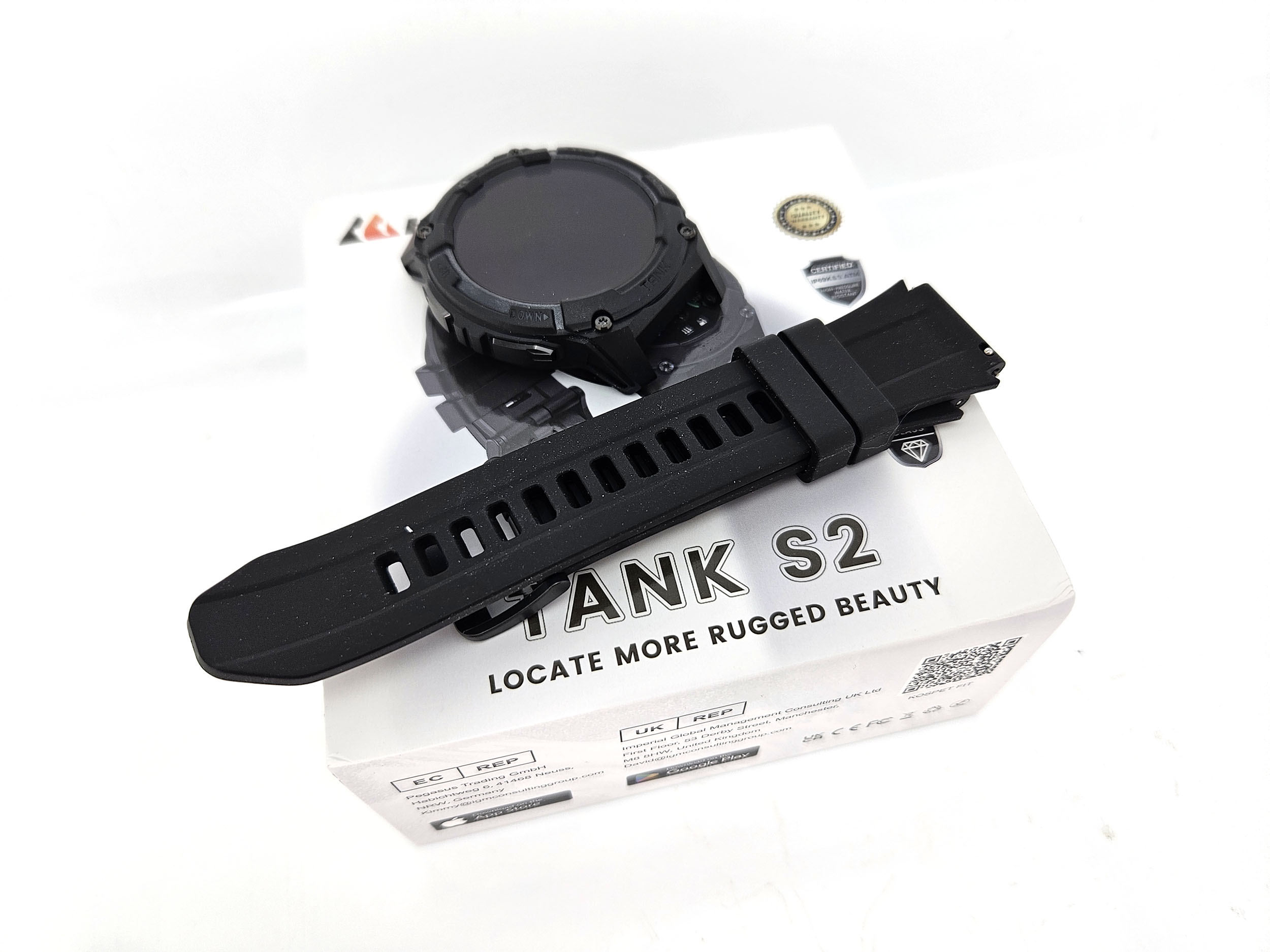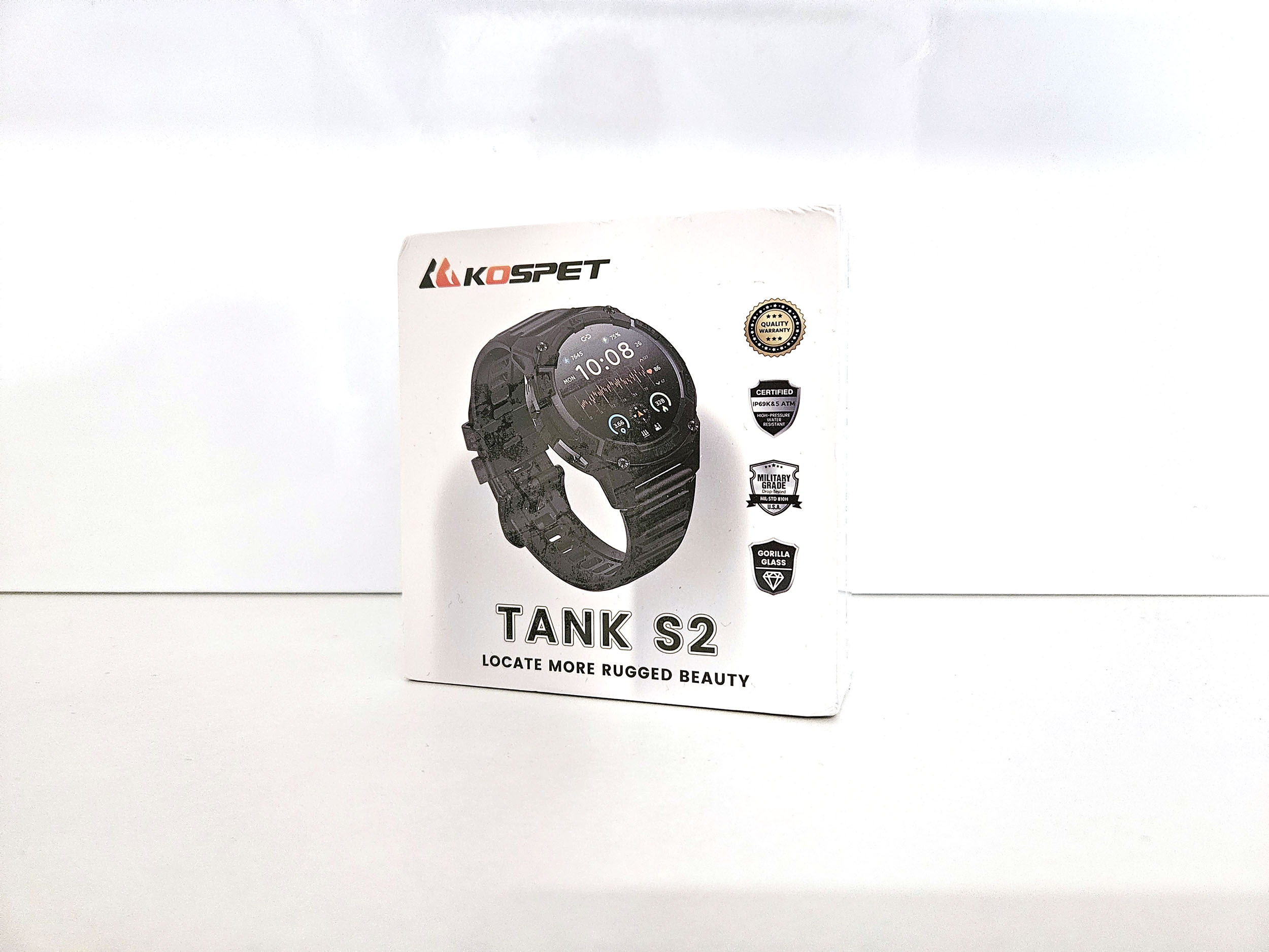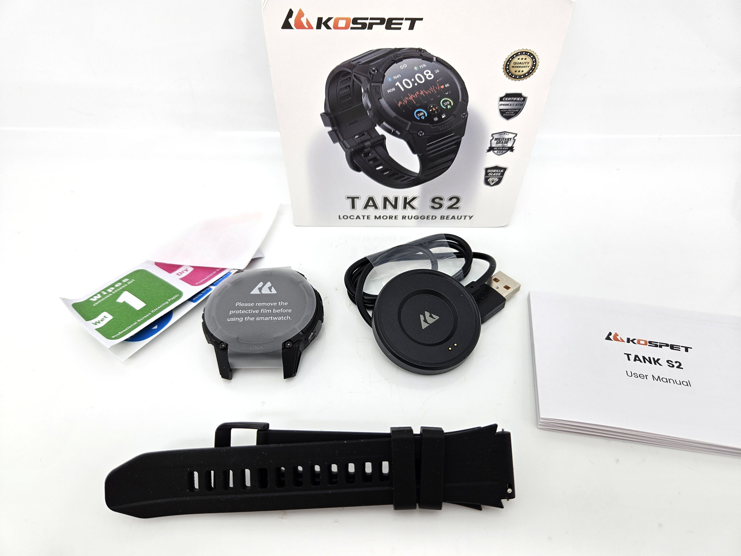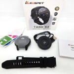 La boite de la Kospet Tank S2 reprend le format et l'esthétique des autres modèles Kospet. Elle contient la montre, un bracelet en silicone, une station de recharge circulaire, un manuel et un écran de protection. La station de recharge est compatible avec la plupart des autres montres Kospet.