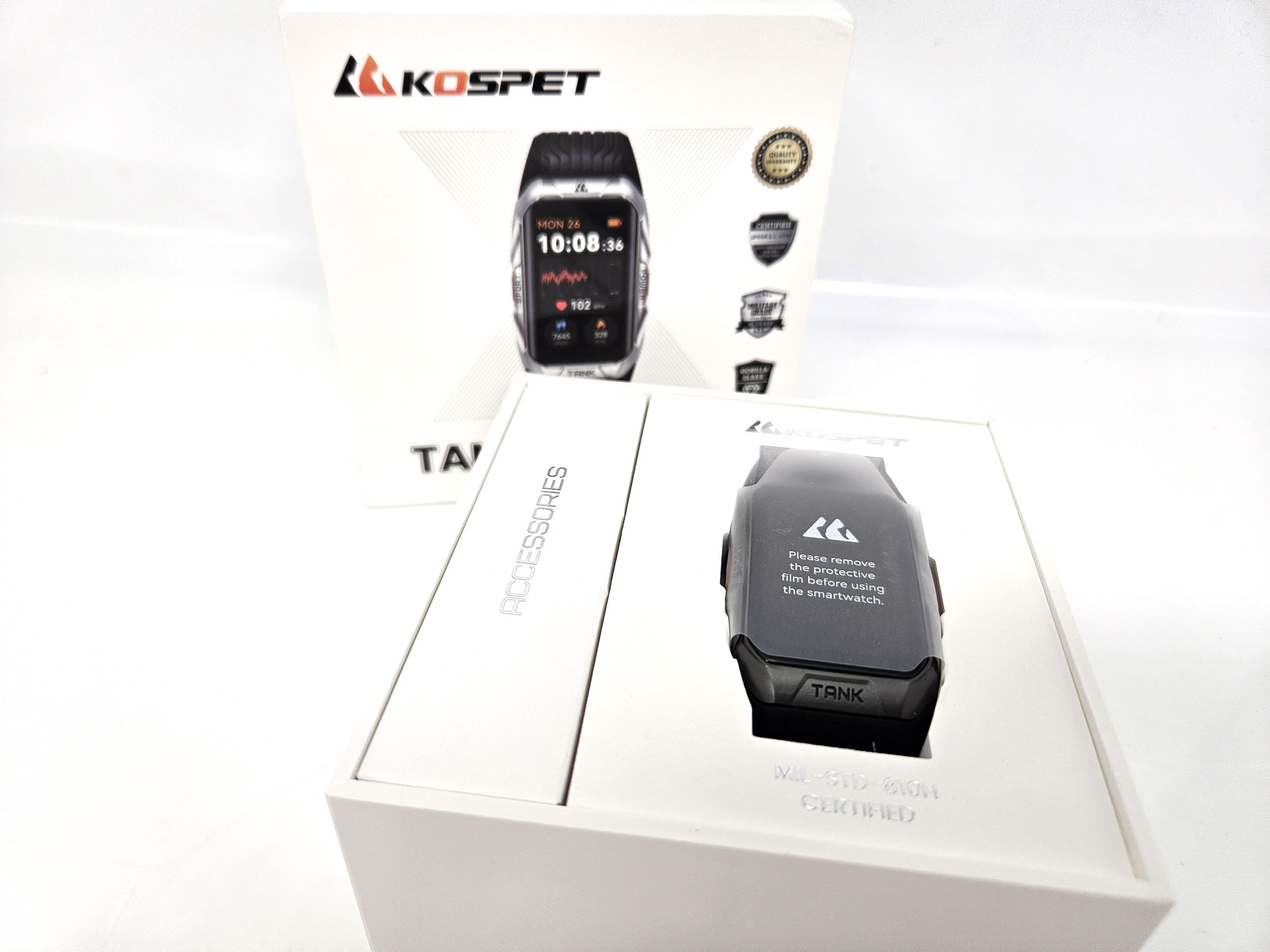 Kospet a affiné son identité visuelle ces deux dernières années pour se stabiliser sur un packaging assez compact, sobre et efficace. La Kospet Tank X2 Ultra y est évidemment illustrée mais je trouve que la photo ne lui fait pas vraiment honneur, c'est d'ailleurs cet effet qui m'avait mis un doute dans la tête avant d'ouvrir la boite.