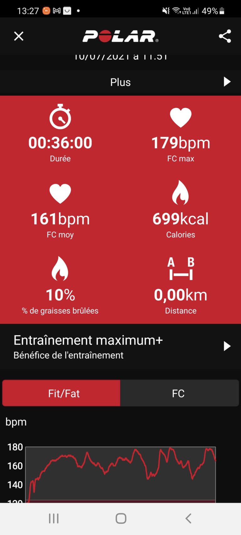 Rythme cardiaqueJ'ai testé la montre avec plusieurs types de sports (marche, vélo intérieur, vélo extérieur,...) et j'ai d'abord eu l'impression que les mesures n'étaient pas fiables car le rythme cardiaque affiché à l'écran ne correspondait pas du tout aux mesures de ma ceinture Polar H10. Il y a en fait une latence importante à l'affichage, les pulsations finissent par s'aligner avec les mesures de la Polar mais il y a toujours un décalage. J'ai pris une photo après avoir fait du vélo en extérieur: