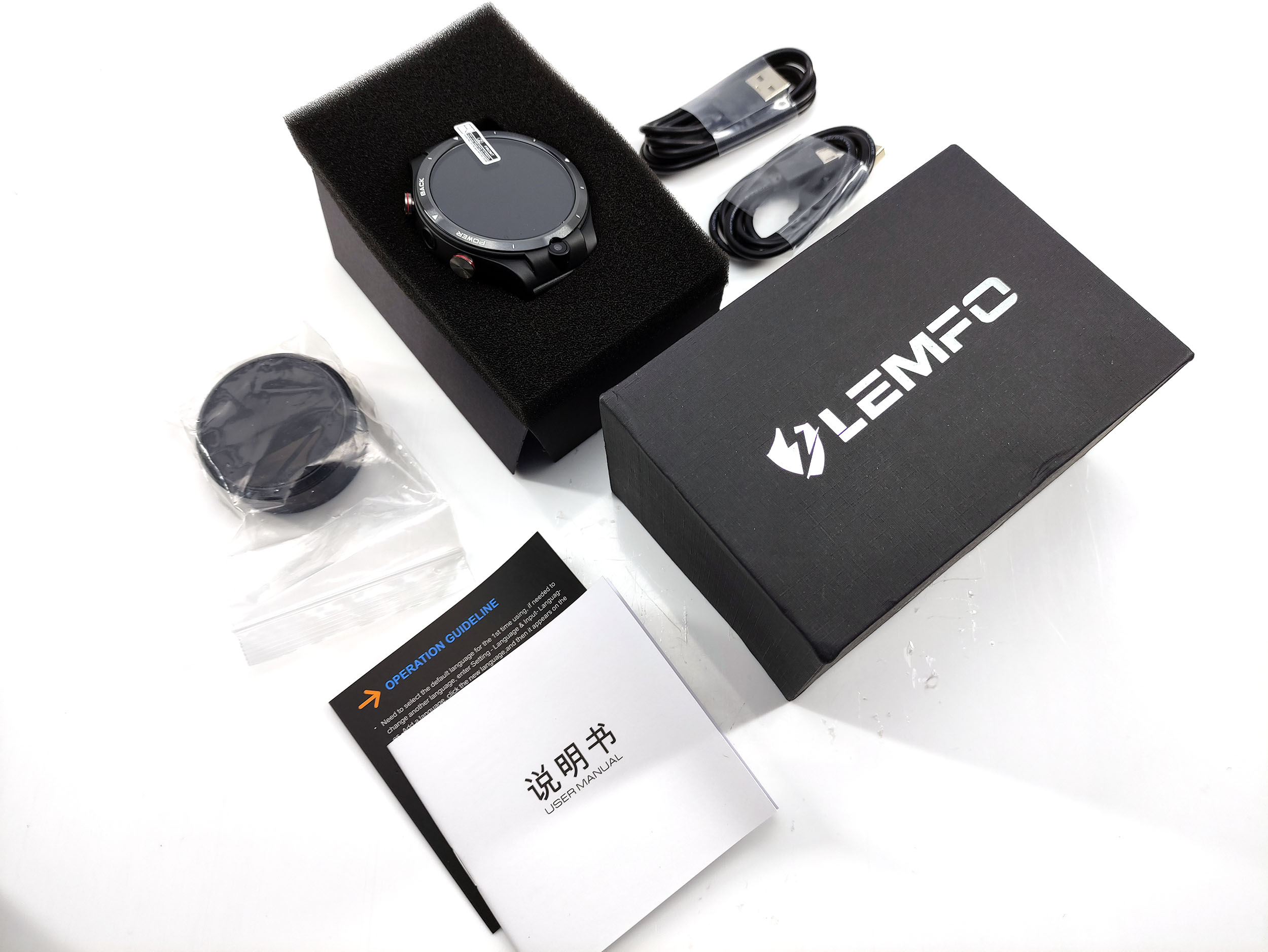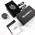 La boite de la Lemfo Lem15 est assez grand et ce n'est pas à cause de la taille de la montre. Lemfo a créer un packaging plus premium que la plupart des montres chinoises et cela commence par l'attention portée à des détails comme l'emballage et la disposition de la montre dans le paquet. La boite contient la montre, un cable de recharge USB avec embout magnétique pour charger directement la montre, un socle de chargement pour y poser la montre et un manuel.