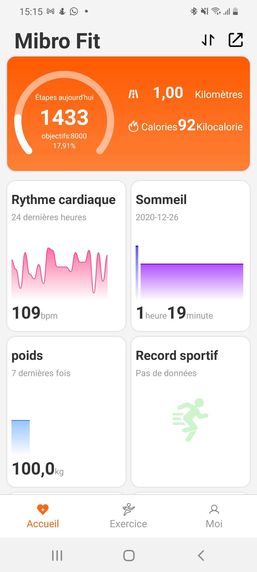 Pour gérer la Mibro Air sur votre téléphone, vous devez télécharger l'application Mibrofit. Cette application est gratuite et offre de nombreuses possibilités. Je ne sais pas si cette application existait avant le lancement de la Mibro Air mais elle est assez complète.L'écran principal affiche les indicateurs principaux, à partir de là il est possible d'obtenir un rapport détaillé sur chaque type de mesure.