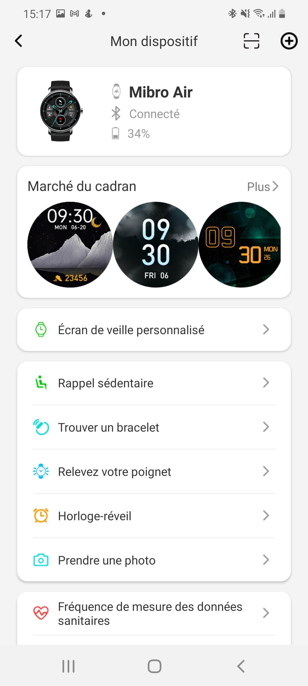 Vous pouvez définir toutes vos préférences (cadrans, notifications, ...) directement à partir de Mibro Fit.