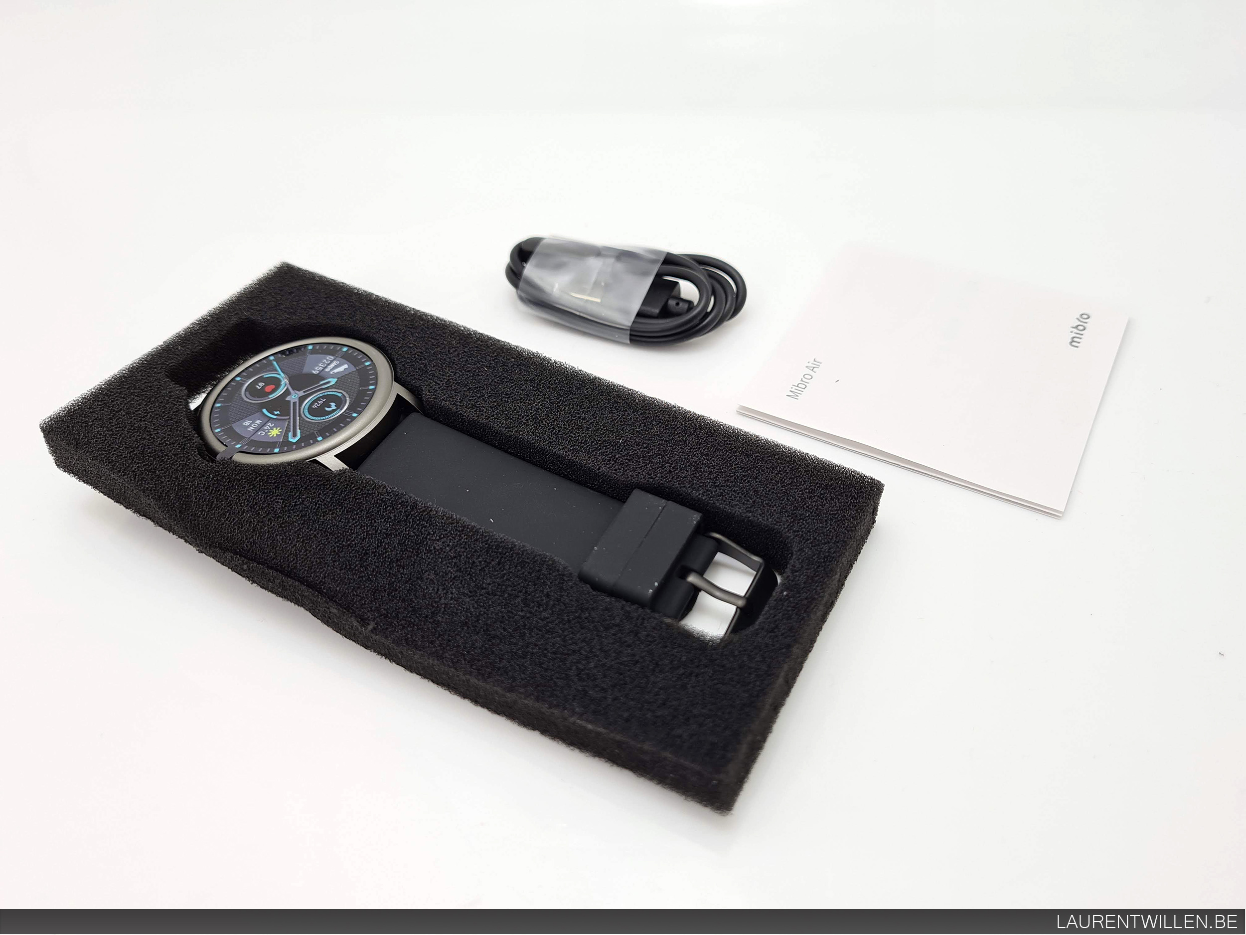 La boite de la Mibro Air me fait penser à un produit Xiaomi, les codes couleurs sont à peu près les mêmes. La boite contient la montre emballée dans une protection en mousse, un cable de recharge magnétique et un manuel.
