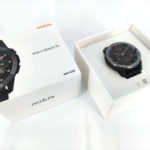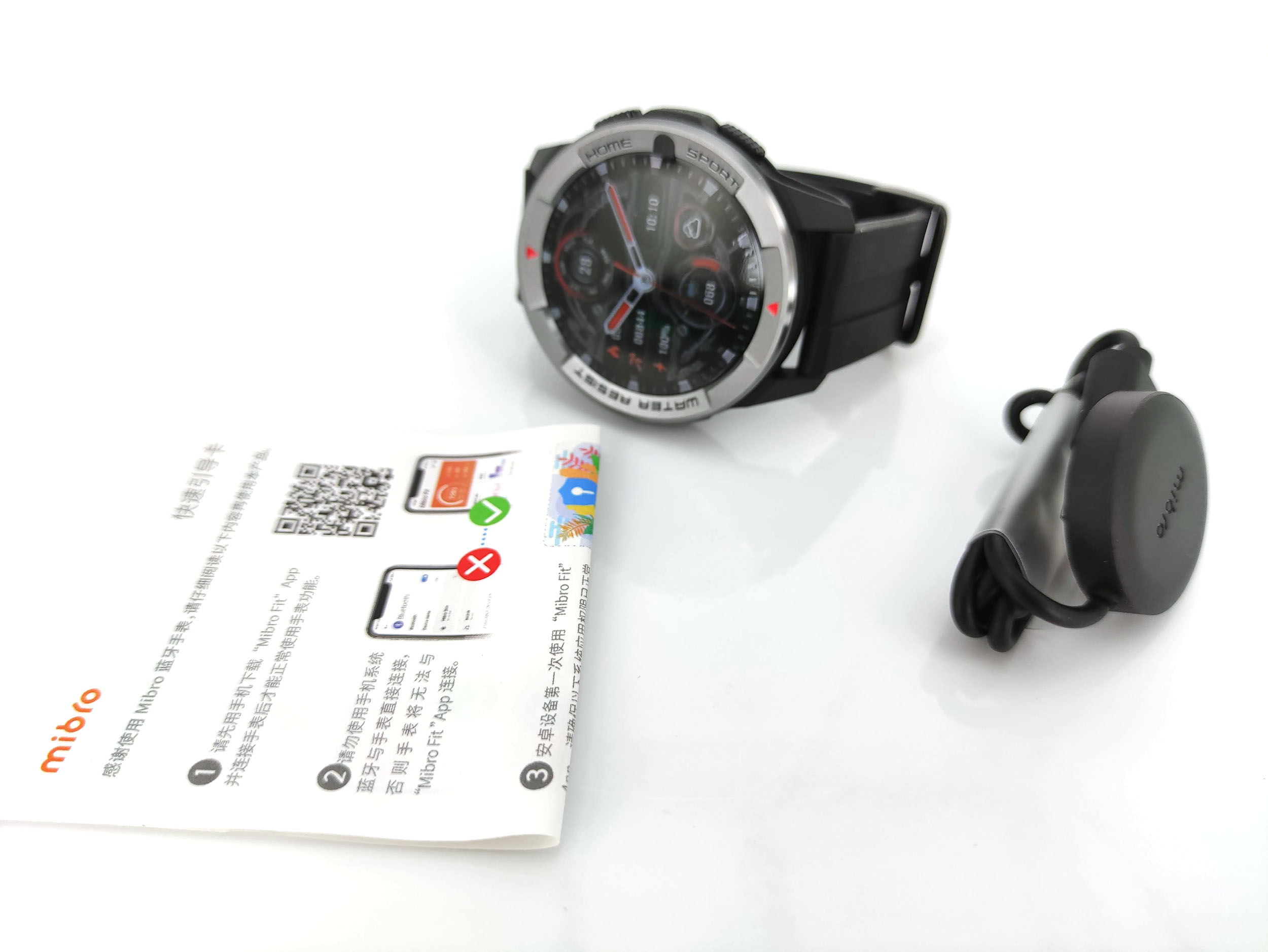 Jusqu'à présente, toutes les boites Mibro avait un design différent. Cette fois la boite a un design cubique sobre mais efficace. La boite contient le strict minimum avec la montre, un cable de rechargement (pour Mibro uniquement) et un manuel d'utilisation.