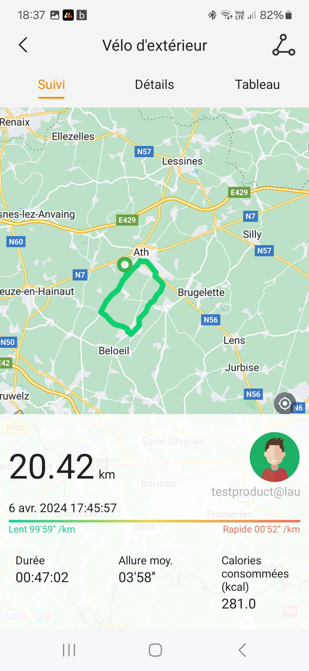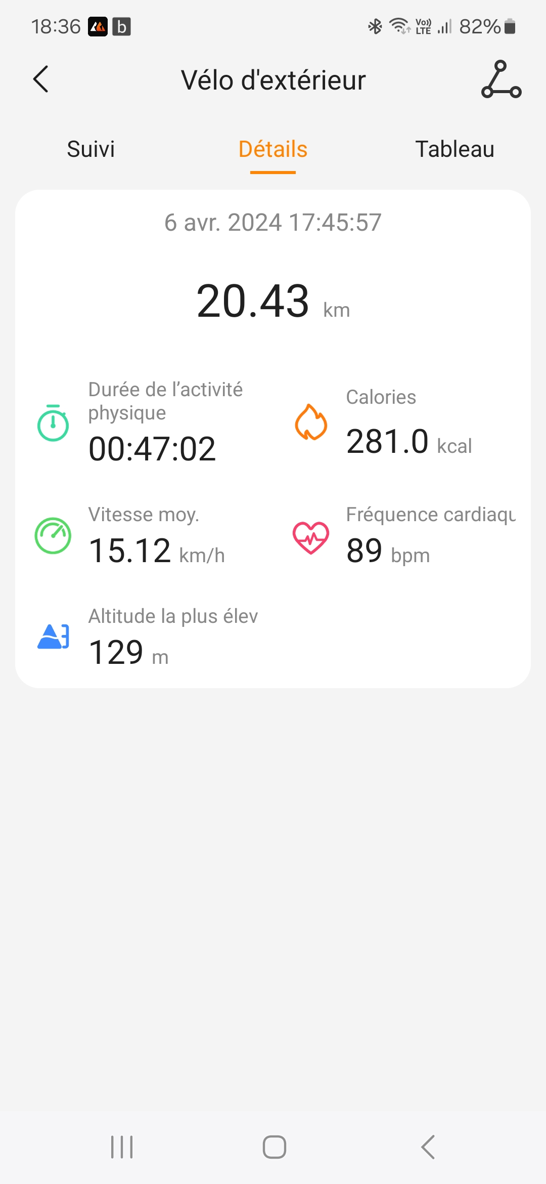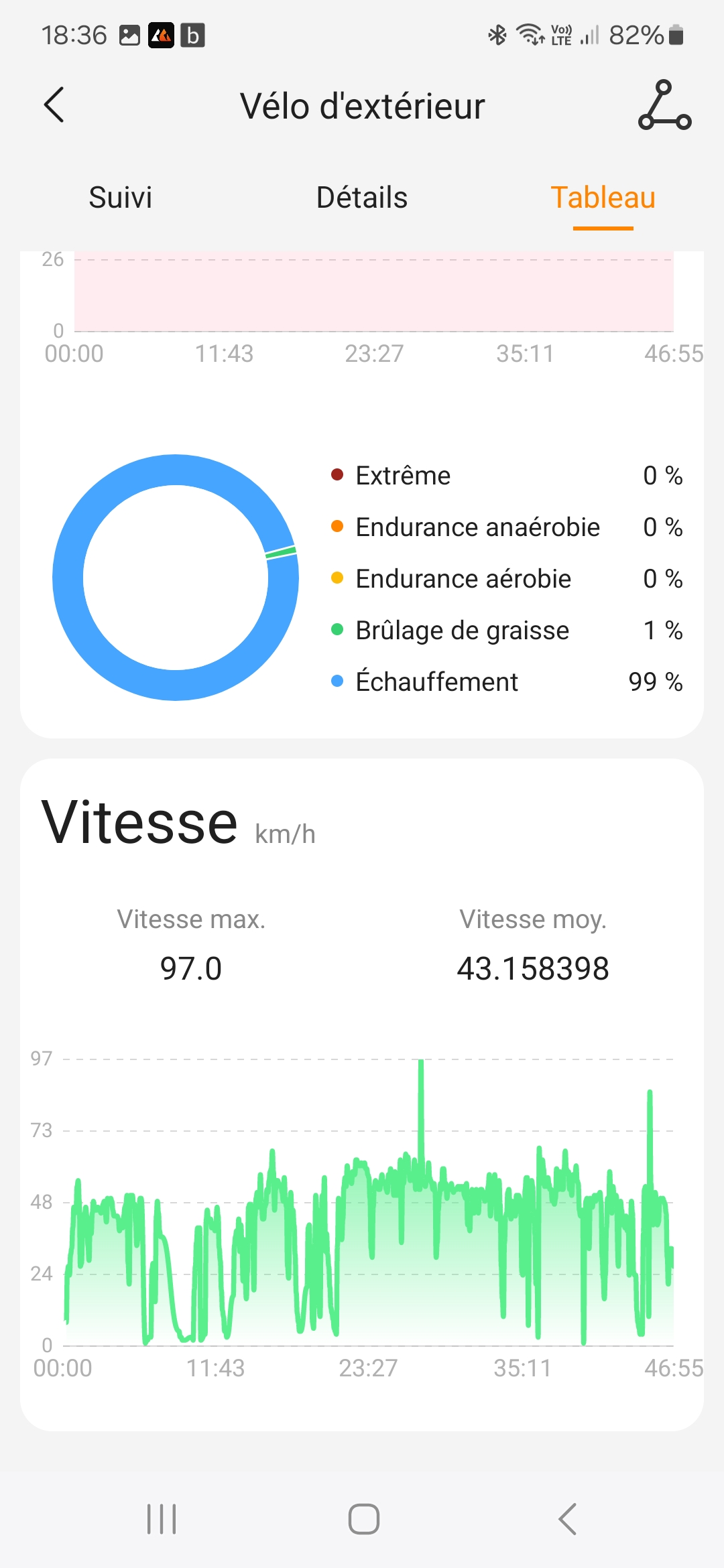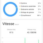 La mesure de la vitesse de déplacement se fait à partir des données GPS et vu la précision des mesures, je me disais que la vitesse allait également être bonne mais ce n'est pas le cas. J'ai obtenu une vitesse moyenne de 43km/h sur mon parcours de vélo et même si c'est théoriquement possible, je ne suis pas assez bon pour rouler à cette vitesse sur une distance de 20 km. La vitesse de pointe mesurée était de 97 km/h et évidemment, ce n'est pas possible non plus.