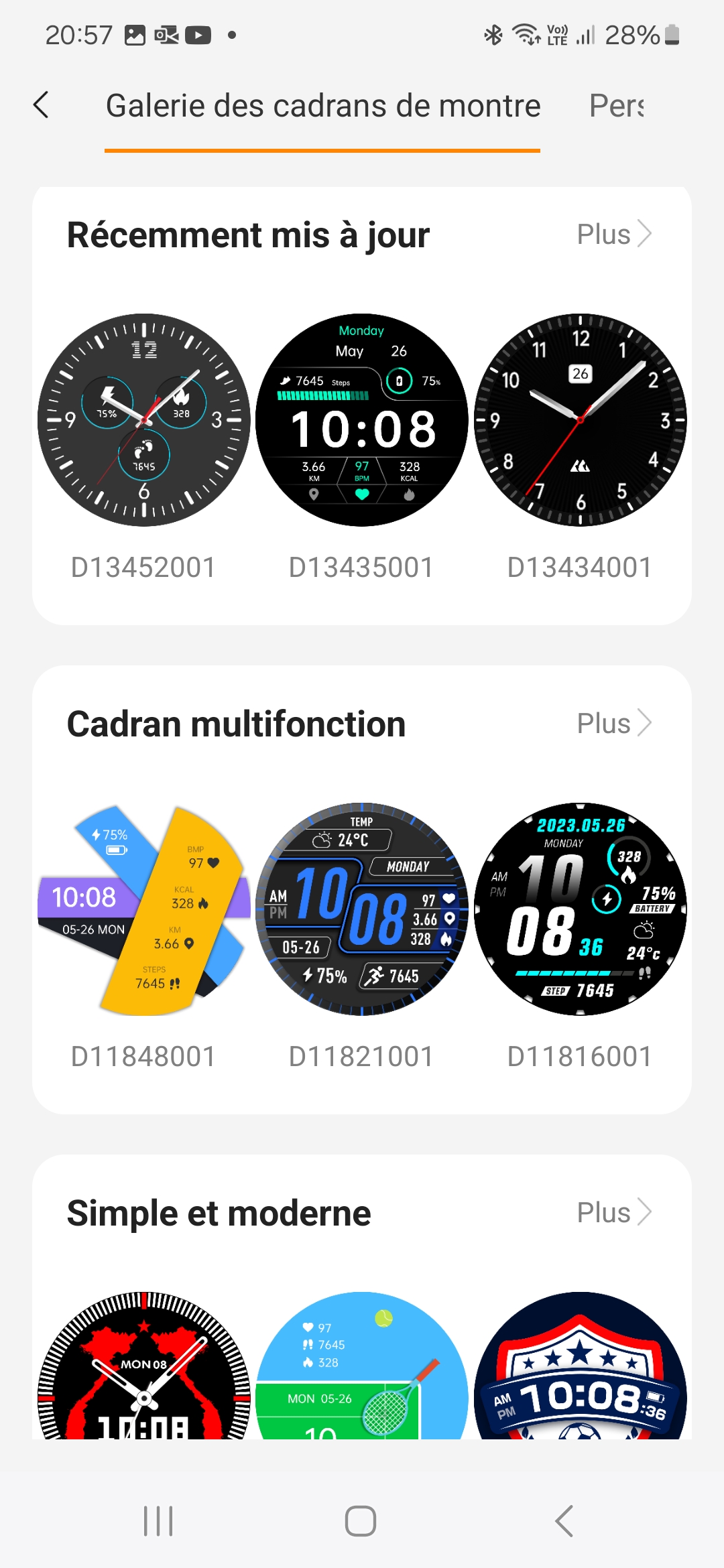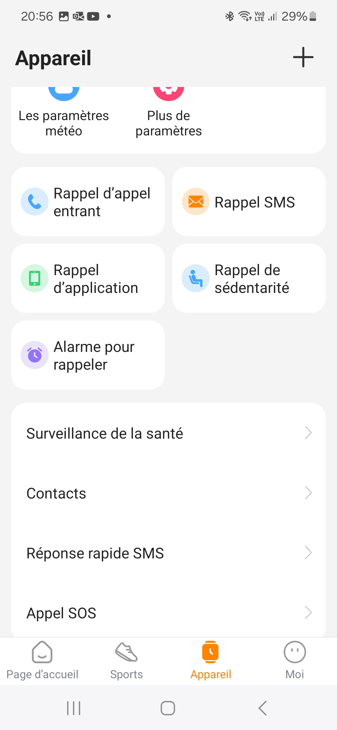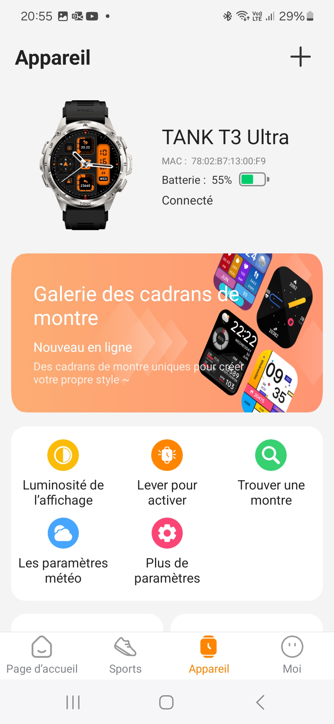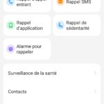 Sur l'écran du dessus, on retrouve les habituels raccourcis pour configurer la montrer ou la connecter à votre téléphone. Cet écran est partiellement personnalisable.