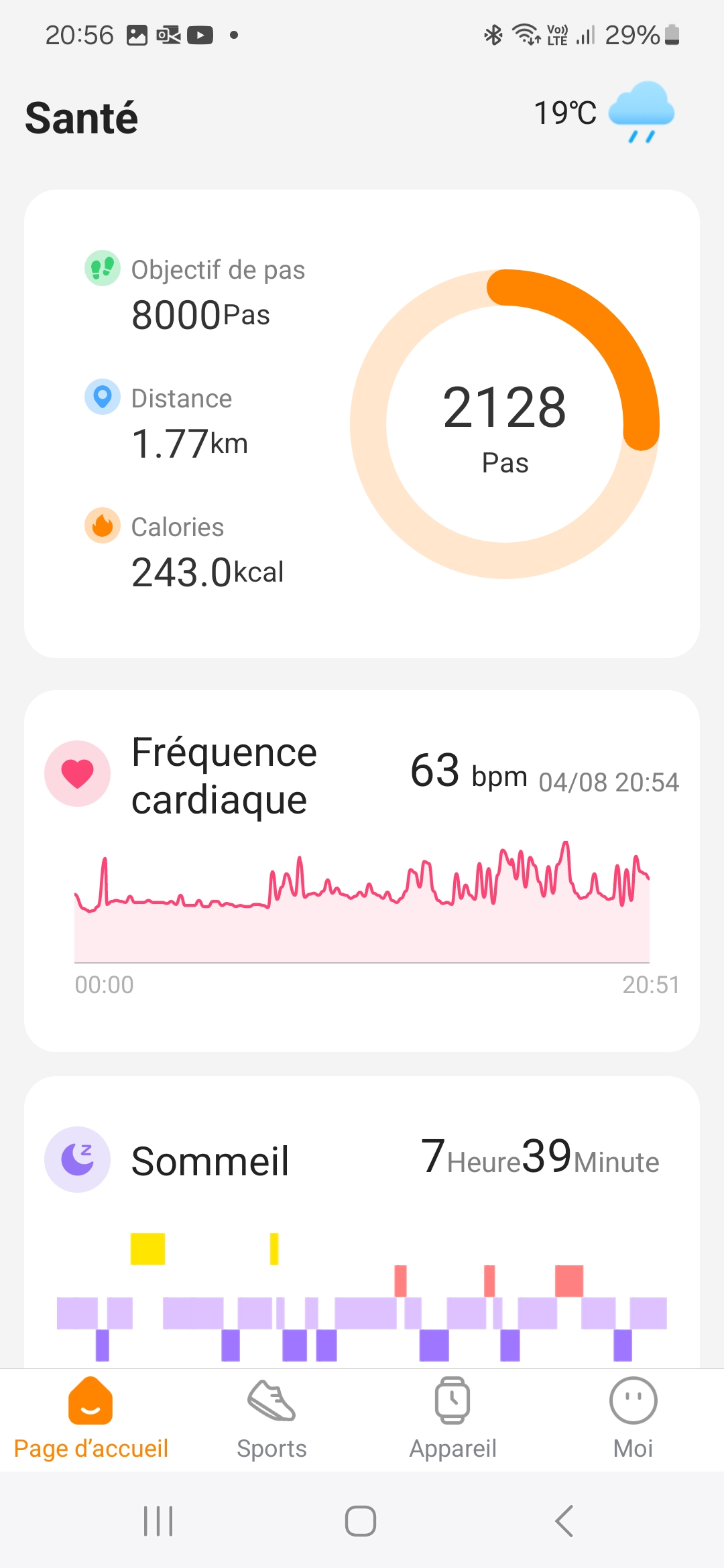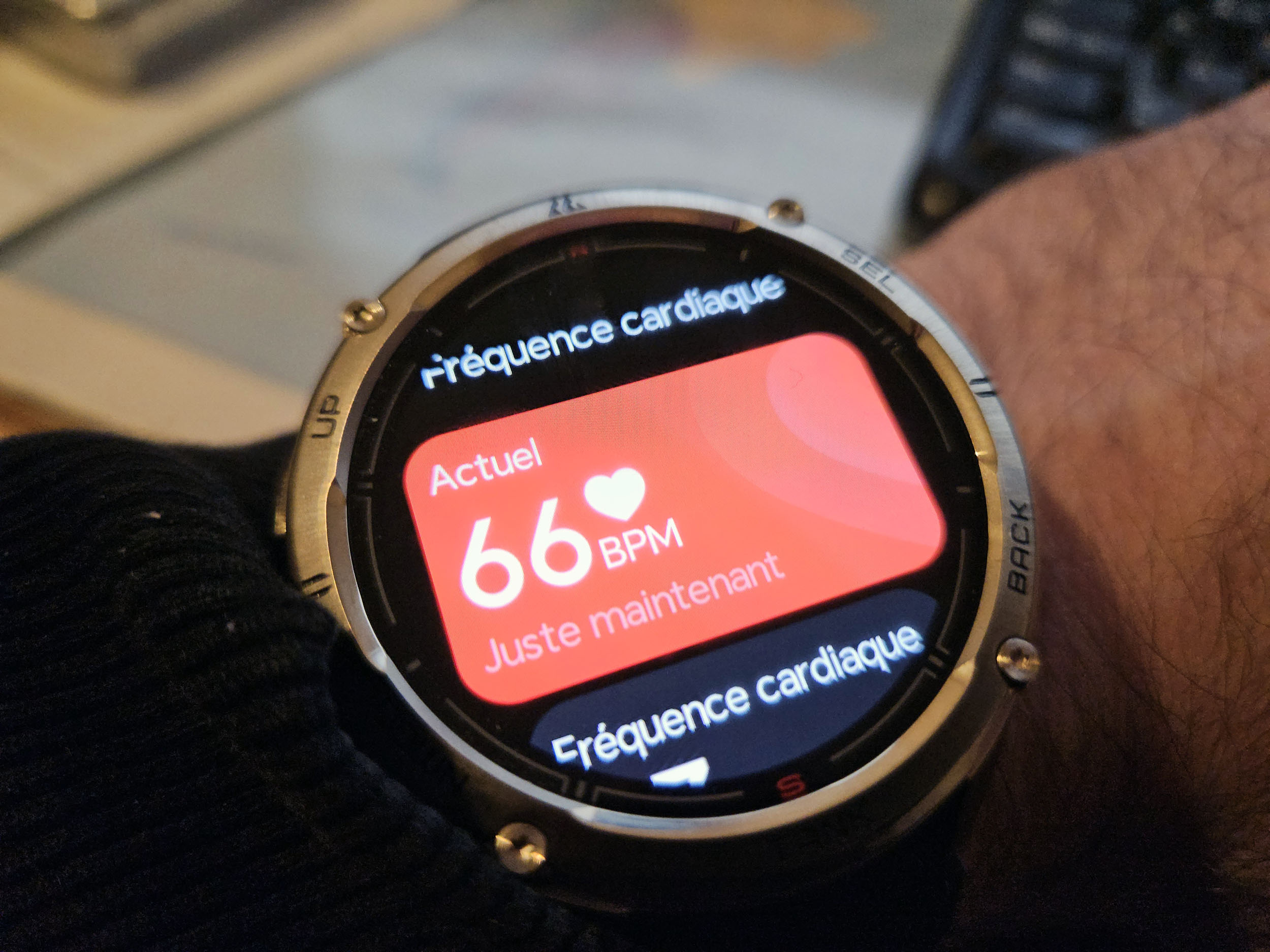 L'écran en dessous de l'écran d'accueil est un nouveau type d'écran, il reprend le concept de widgets en faisant remonter les informations disponibles dans chaque fonctionnalité de la montre. Vous pouvez ainsi voir le rythme cardiaque, le temps de sommeil ou les dernières informations remontées par les applications que vous avez utilisées. Cet écran est personnalisable, vous pouvez choisir l'ordre d'affichage ainsi que la présence des widgets.