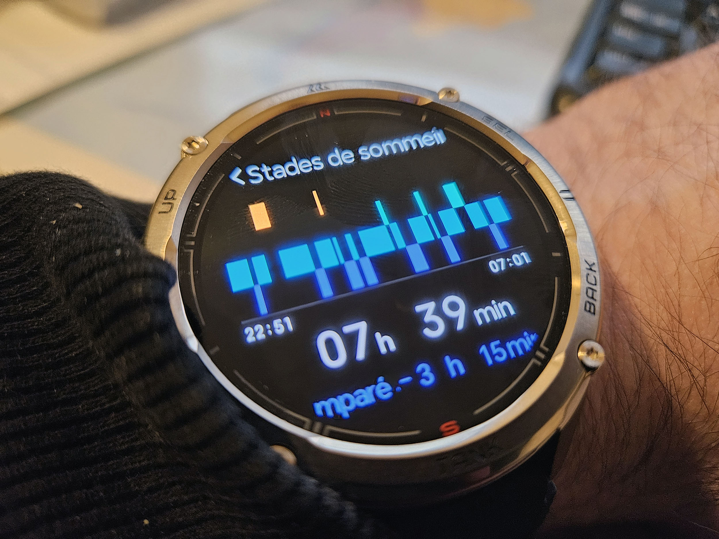 En dehors de ces périodes d'éveil en début de soirée/nuit, la montre mesure assez bien le temps de sommeil total. La durée des cycles est assez similaire à ce que j'ai mesuré avec d'autres montres. Il est possible de configurer la montre pour que le sommeil ne soit compté qu'à partir de l'heure de votre choix, ceci permet de corriger la compréhension des périodes d'éveil en début de sommeil.